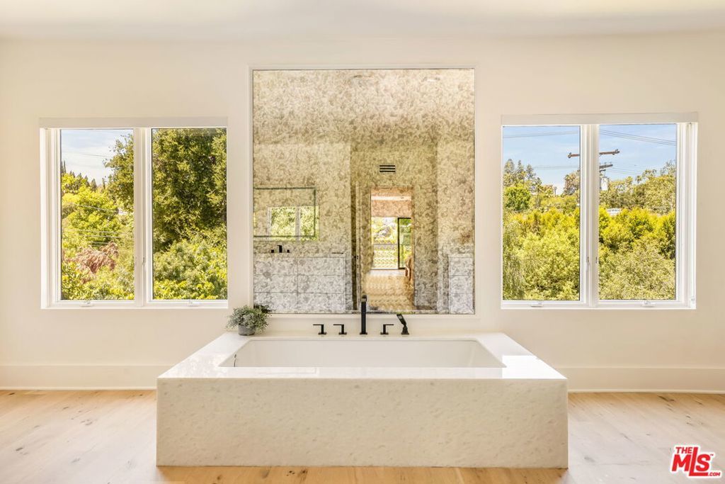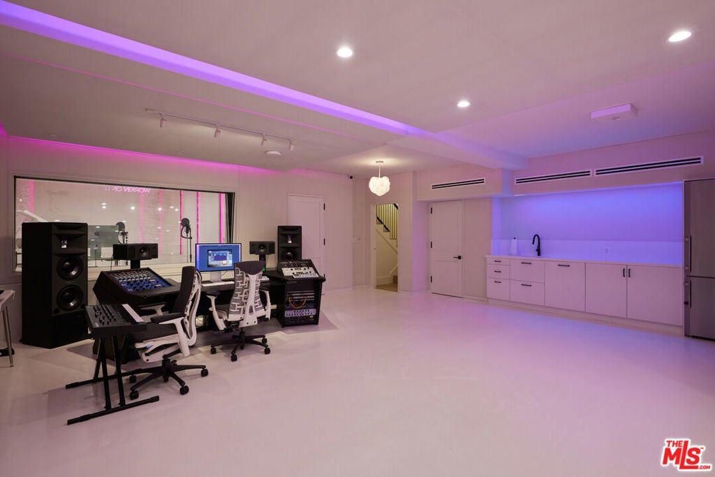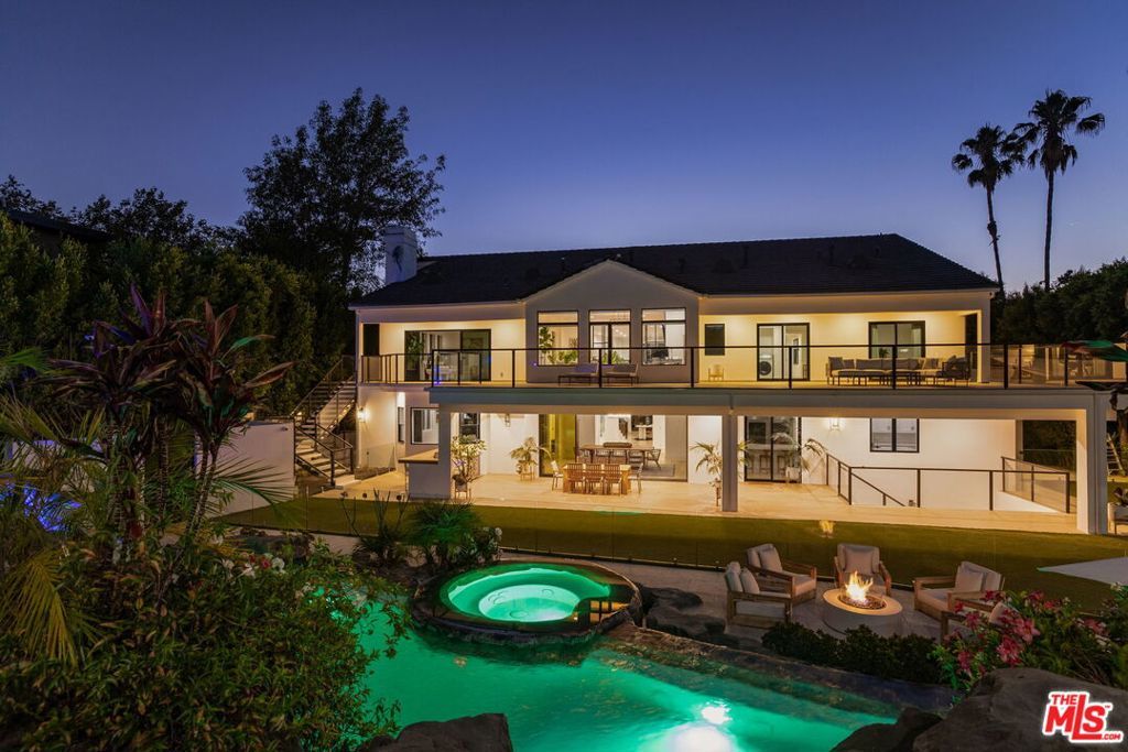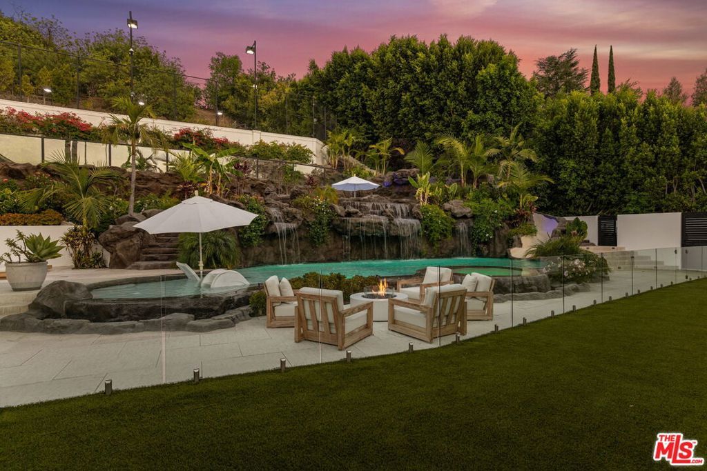 Behind gates and tall hedges South of the Boulevard, this celebrity-owned Encino estate spans over one acre. Fully renovated, the property welcomes you through grand gates and a spacious motor court to a main residence featuring a dramatic double staircase, multiple living areas, a private office, and a chef's kitchen that opens to the dining room and resort-style backyard. The basement level includes a state-of-the-art recording studio with its own private entrance. Upstairs, five en-suite bedrooms include a luxurious primary suite with dual closets, spa bath, and a terrace overlooking the grounds. Outside, enjoy a new pool and spa with waterfall and slide, a tennis court, putting green, covered dining patio with bbq area, fire pit, and a play area. A detached guest house offers a full gym, kitchen, and private guest quarters. A rare opportunity to own a secluded, resort-like compound in one of Encino's most coveted neighborhoods.