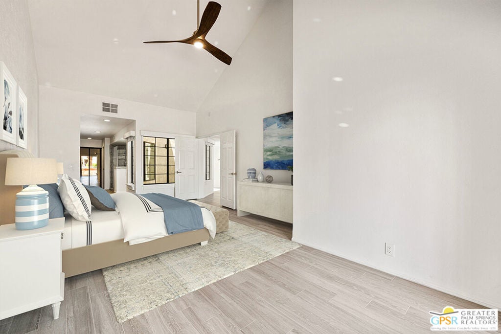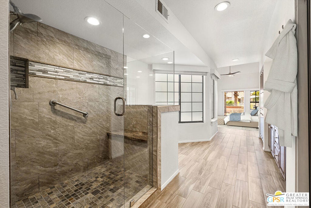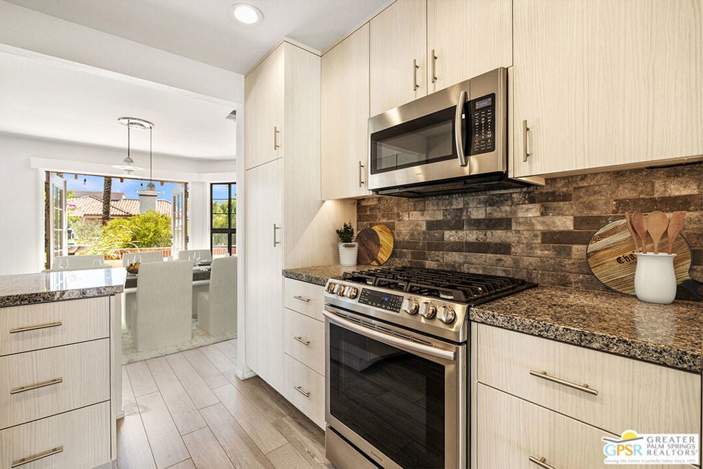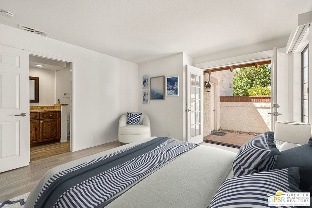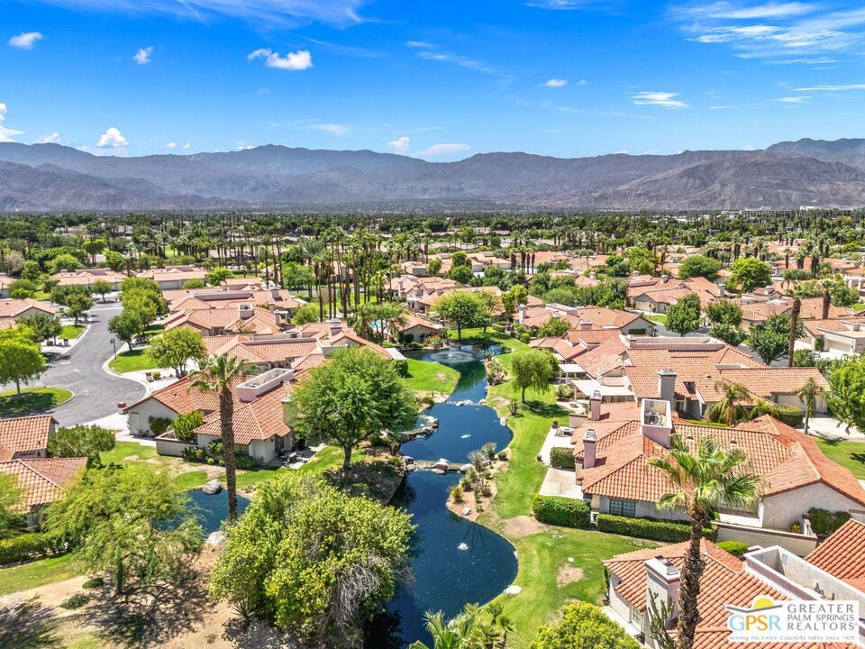 Beautifully positioned in Desert Falls Country Club, this spacious single level, single story 2BD/2BA condo with modern finishes celebrates soaring beamed ceilings, natural light, and seamless indoor-outdoor living. You will love the plank-style ceramic tile, solar shades, custom valances, and solid-core wood doors plus two patios and a central atrium to create a bright, inviting flow! Five sets of French doors open to outside areas and an east-facing terrace that is steps from a resort-style pool and spa. Your evenings will glow with poolside ambiance! The living room features a vaulted ceiling, fireplace, and wet bar while the open kitchen showcases stylish finishes, brushed nickel hardware, and a breakfast nook that opens to the gated courtyard. A dining room off the kitchen also opens to the outside, enhancing the flow for entertaining. The primary suite enjoys vaulted ceiling, patio access, and atrium views with Trex decking and new cover. The primary ensuite bath includes a large, tiled shower and dual vanities. The guest bedroom with full bath also opens to the courtyard. Pride of ownership extends to the 2-car garage with custom cabinetry. Fee Simple land and some of the lowest HOA dues at Desert Falls Country Club add appeal, along with resort pools, fitness, pickleball, tennis, and a championship golf course rated top 10 by the SCPGA and 4 stars by Golf Digest. Take the Matterport Virtual Tour for the full experience!