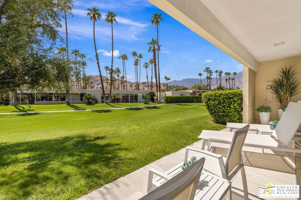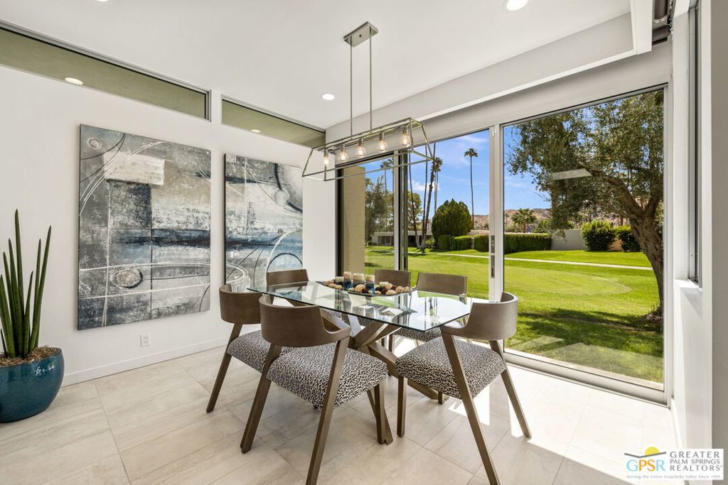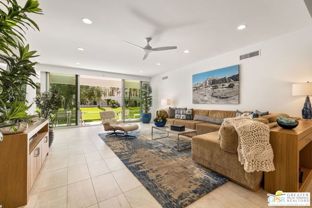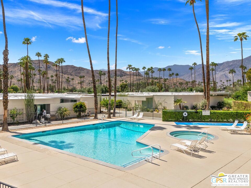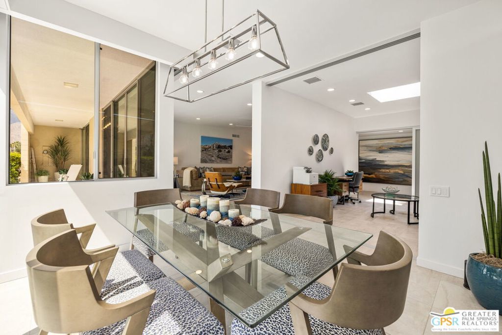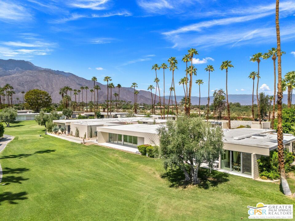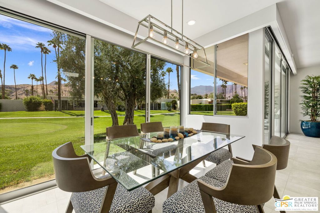 Distinctive mid-century residence at Seven Lakes Country Club. This expanded Richard A. Harrison design offers 3 bedrooms, 3 bathrooms, and 2,706 square feet all on a single level. Dramatic 10 foot ceilings, walls of glass, and multiple patios showcase striking mountain views and create seamless indoor and outdoor living. The south-facing orientation is a true highlight. Patios, living room, dining area, and primary suite all take in natural light and incredible views. The customized interior features an expansive chef's eat-in kitchen with gas fireplace, a spacious living room, and an adjacent formal dining area. The den or office is framed by sliding doors and clerestory windows which add to the home's modernist character. Each of the three ensuite bedrooms offers its own bath and outdoor connection. The primary suite enjoys dual vanities, a walk-in shower, and private patio access. Recent improvements include structural updates by architect Jeff Stoker, a smooth coat finish on interior walls, extensive plumbing updates, all windows and sliders replaced, and pocket doors added in the den/study. Systems have also been thoughtfully upgraded with a newer HVAC system and a Navien tankless water heater. The home is offered furnished, includes a golf cart, and features an EV charger installed in the carport.The community is designed for leisure with 15 pools and spas, tennis, a Ted Robinson executive par 58 golf course, and the iconic William Cody clubhouse with restaurant and bar just a short golf cart ride away. HOA provides 24-hour security. Take the Matterport virtual tour for the full experience of this one-of-a-kind home.