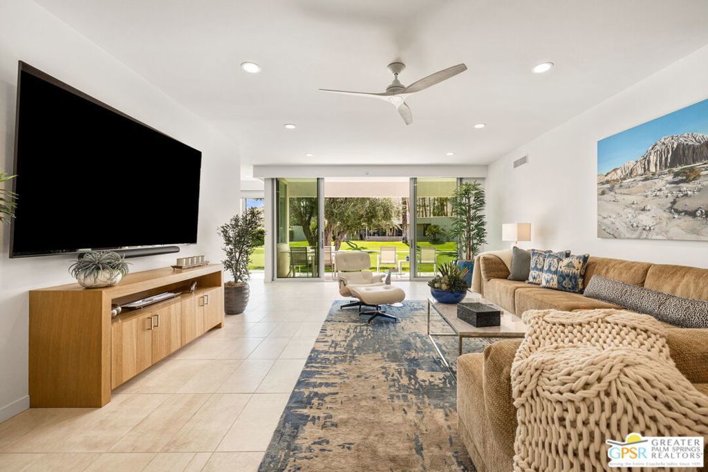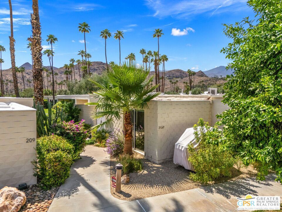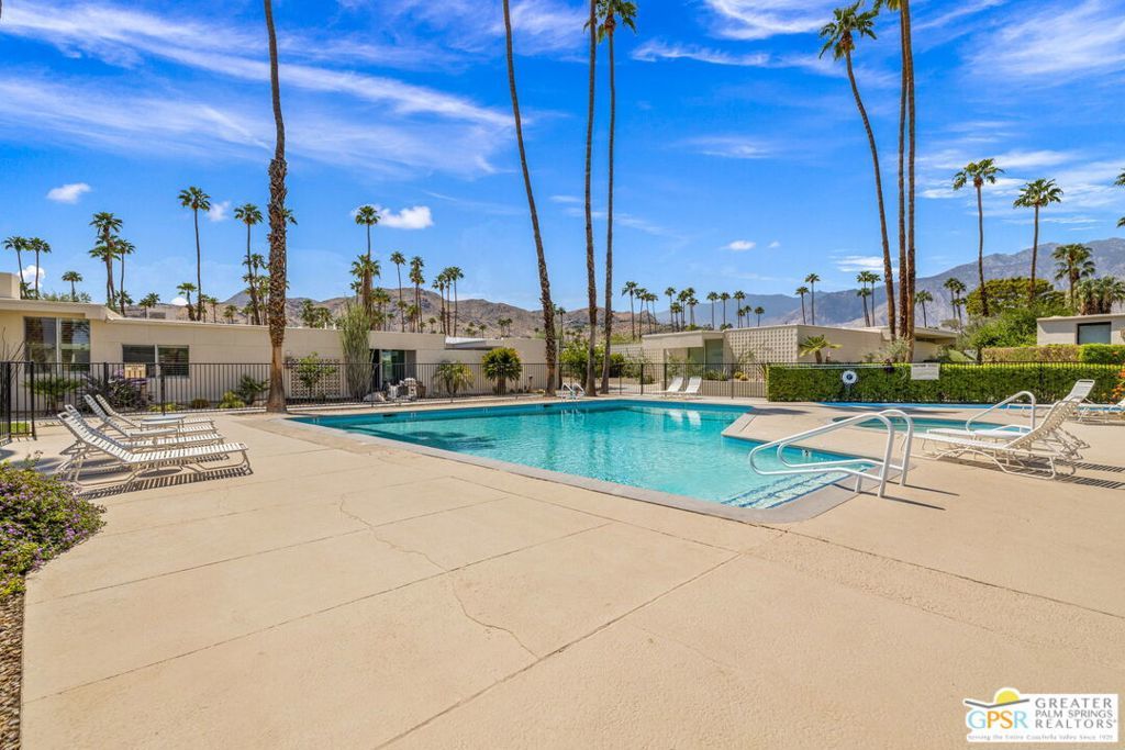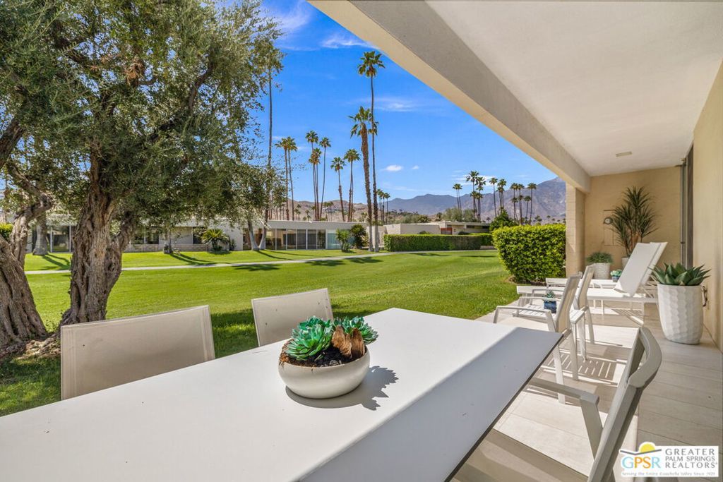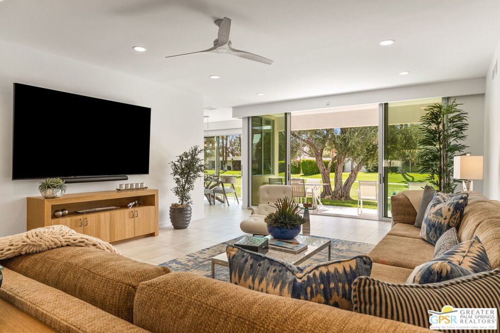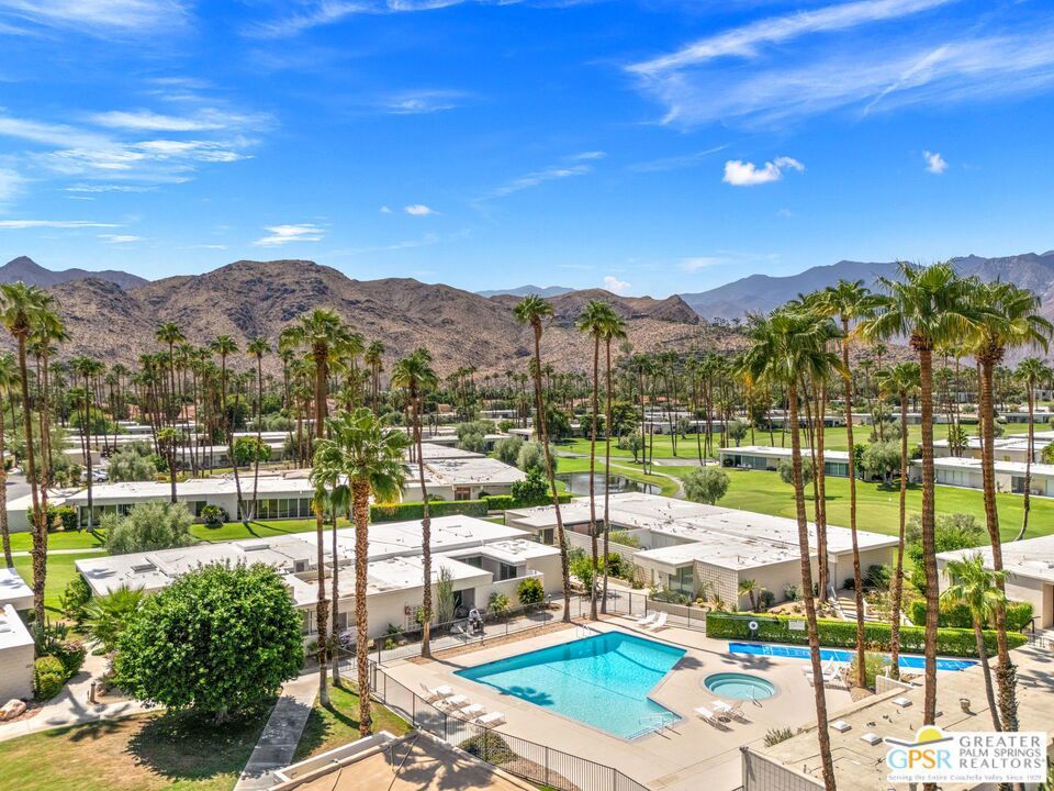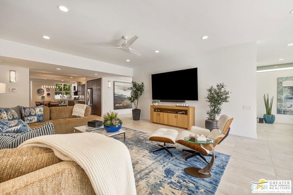 Distinctive mid-century residence at Seven Lakes Country Club. This expanded Richard A. Harrison design offers 3 bedrooms, 3 bathrooms, and 2,706 square feet all on a single level. Dramatic 10 foot ceilings, walls of glass, and multiple patios showcase striking mountain views and create seamless indoor and outdoor living. The south-facing orientation is a true highlight. Patios, living room, dining area, and primary suite all take in natural light and incredible views. The customized interior features an expansive chef's eat-in kitchen with gas fireplace, a spacious living room, and an adjacent formal dining area. The den or office is framed by sliding doors and clerestory windows which add to the home's modernist character. Each of the three ensuite bedrooms offers its own bath and outdoor connection. The primary suite enjoys dual vanities, a walk-in shower, and private patio access. Recent improvements include structural updates by architect Jeff Stoker, a smooth coat finish on interior walls, extensive plumbing updates, all windows and sliders replaced, and pocket doors added in the den/study. Systems have also been thoughtfully upgraded with a newer HVAC system and a Navien tankless water heater. The home is offered furnished, includes a golf cart, and features an EV charger installed in the carport.The community is designed for leisure with 15 pools and spas, tennis, a Ted Robinson executive par 58 golf course, and the iconic William Cody clubhouse with restaurant and bar just a short golf cart ride away. HOA provides 24-hour security. Take the Matterport virtual tour for the full experience of this one-of-a-kind home.