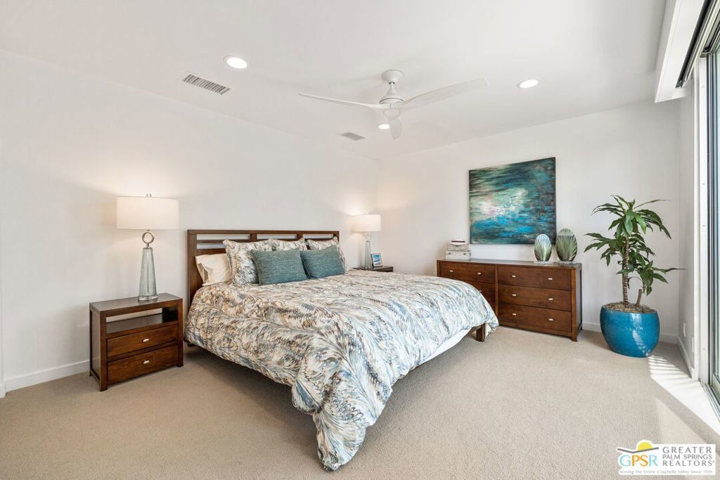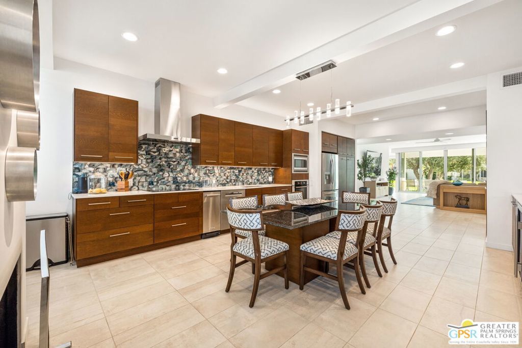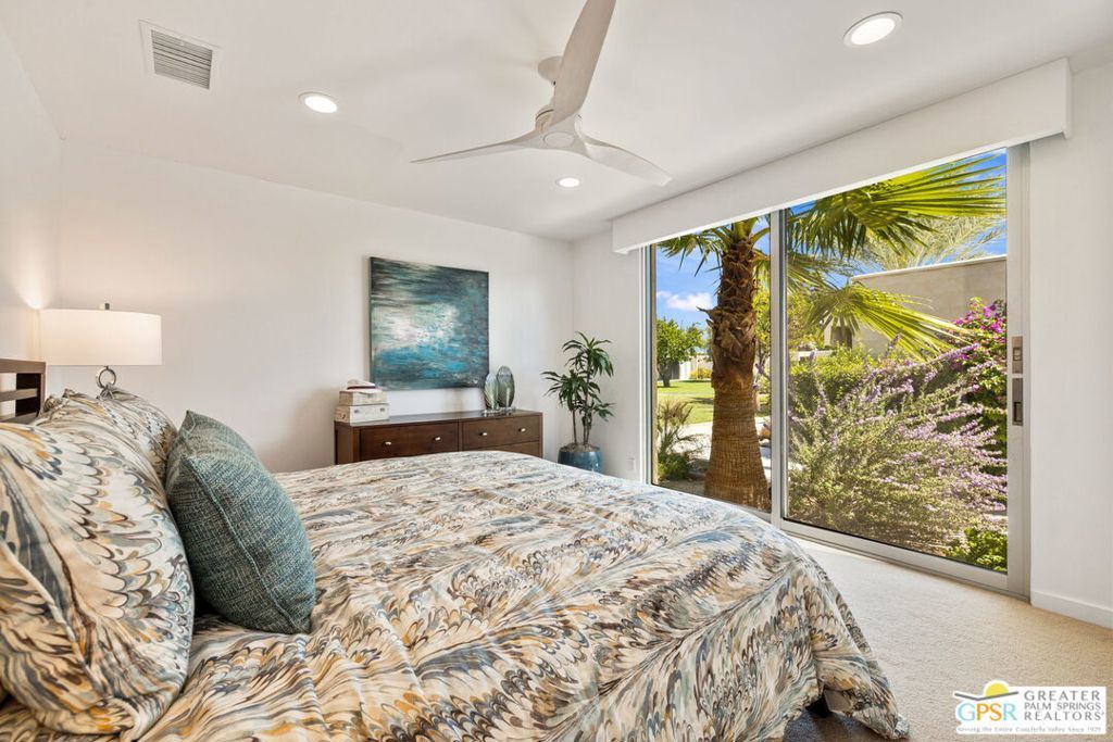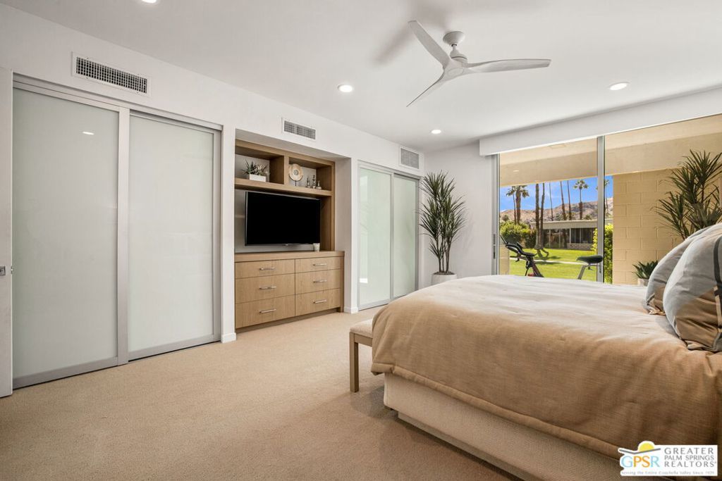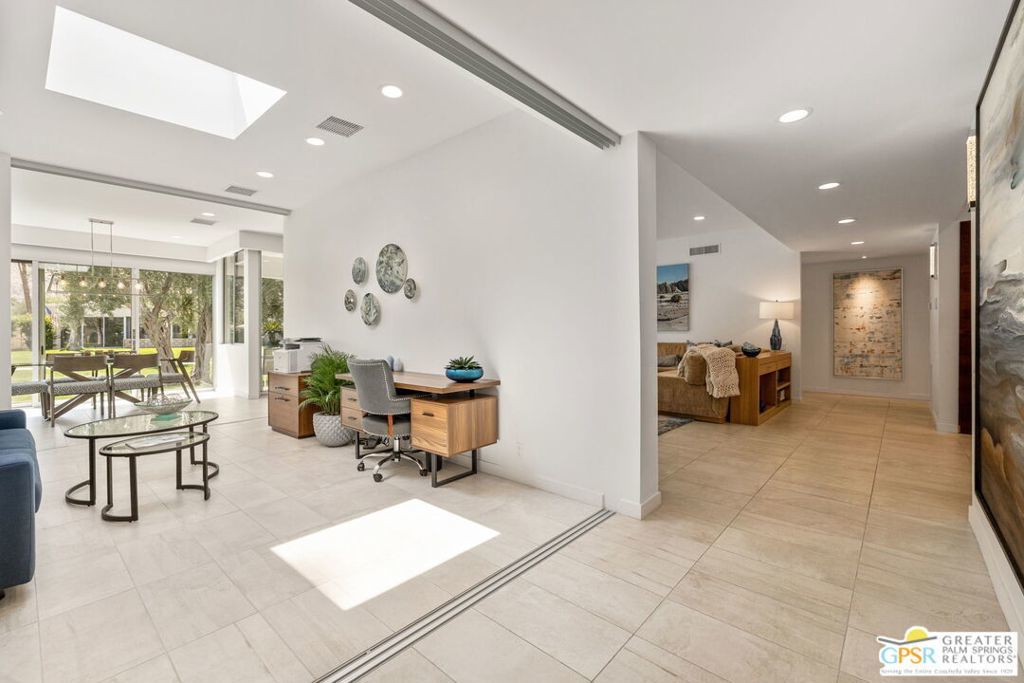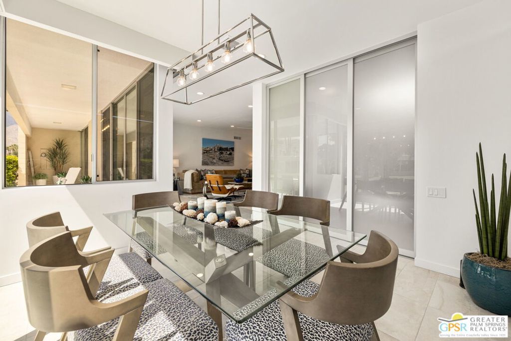 Distinctive mid-century residence at Seven Lakes Country Club. This expanded Richard A. Harrison design offers 3 bedrooms, 3 bathrooms, and 2,706 square feet all on a single level. Dramatic 10 foot ceilings, walls of glass, and multiple patios showcase striking mountain views and create seamless indoor and outdoor living. The south-facing orientation is a true highlight. Patios, living room, dining area, and primary suite all take in natural light and incredible views. The customized interior features an expansive chef's eat-in kitchen with gas fireplace, a spacious living room, and an adjacent formal dining area. The den or office is framed by sliding doors and clerestory windows which add to the home's modernist character. Each of the three ensuite bedrooms offers its own bath and outdoor connection. The primary suite enjoys dual vanities, a walk-in shower, and private patio access. Recent improvements include structural updates by architect Jeff Stoker, a smooth coat finish on interior walls, extensive plumbing updates, all windows and sliders replaced, and pocket doors added in the den/study. Systems have also been thoughtfully upgraded with a newer HVAC system and a Navien tankless water heater. The home is offered furnished, includes a golf cart, and features an EV charger installed in the carport.The community is designed for leisure with 15 pools and spas, tennis, a Ted Robinson executive par 58 golf course, and the iconic William Cody clubhouse with restaurant and bar just a short golf cart ride away. HOA provides 24-hour security. Take the Matterport virtual tour for the full experience of this one-of-a-kind home.
