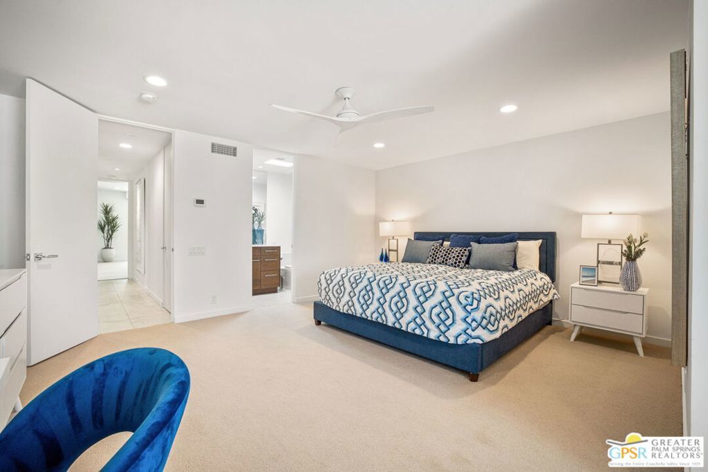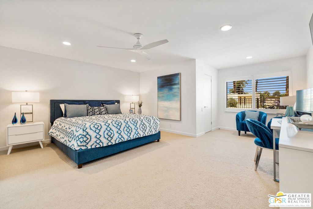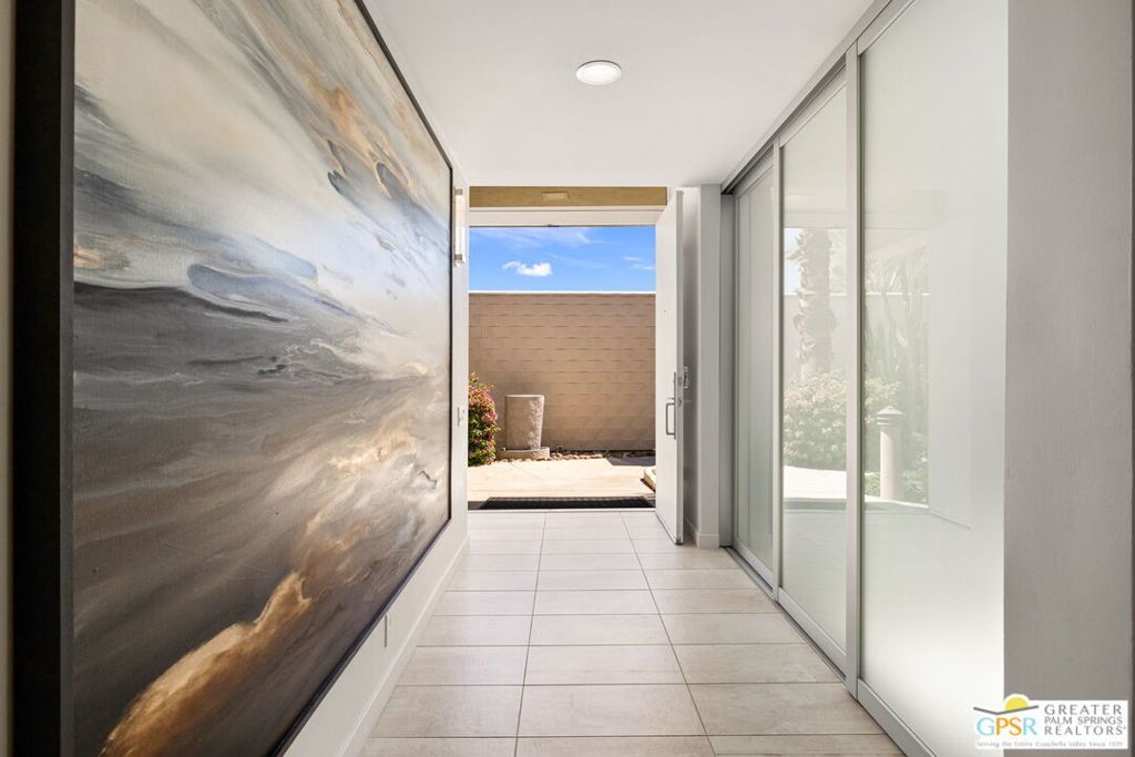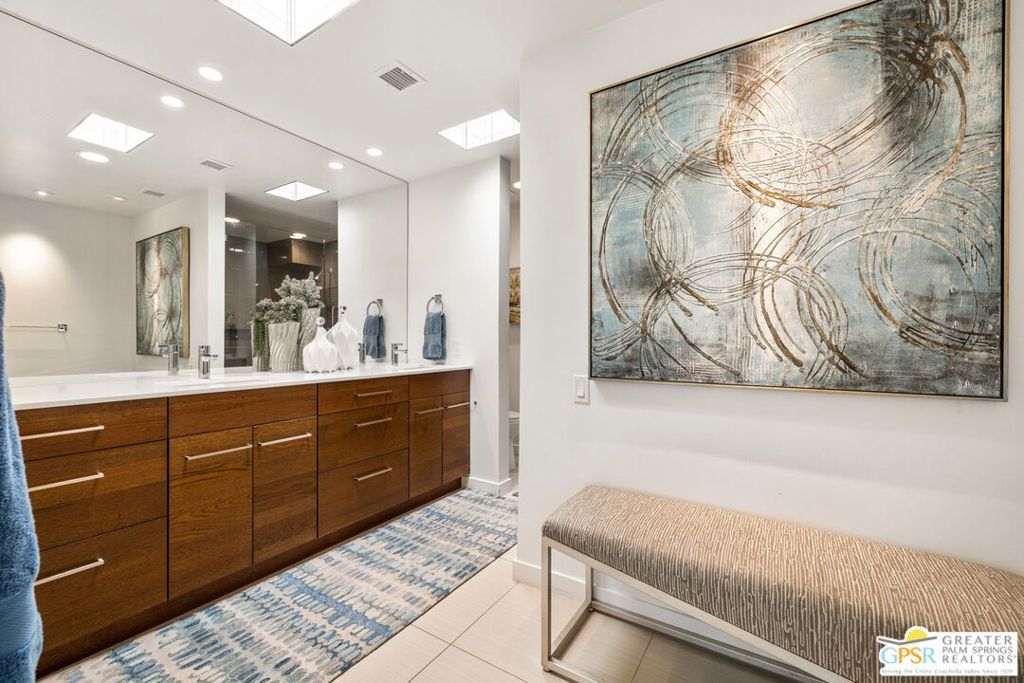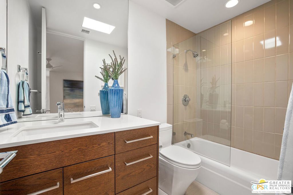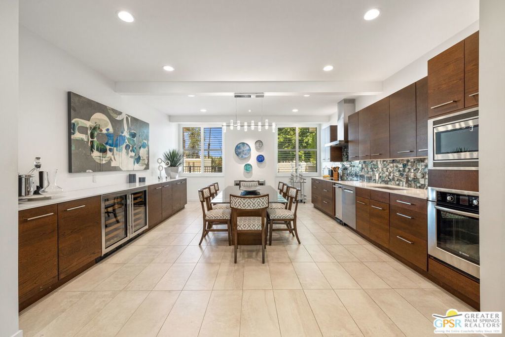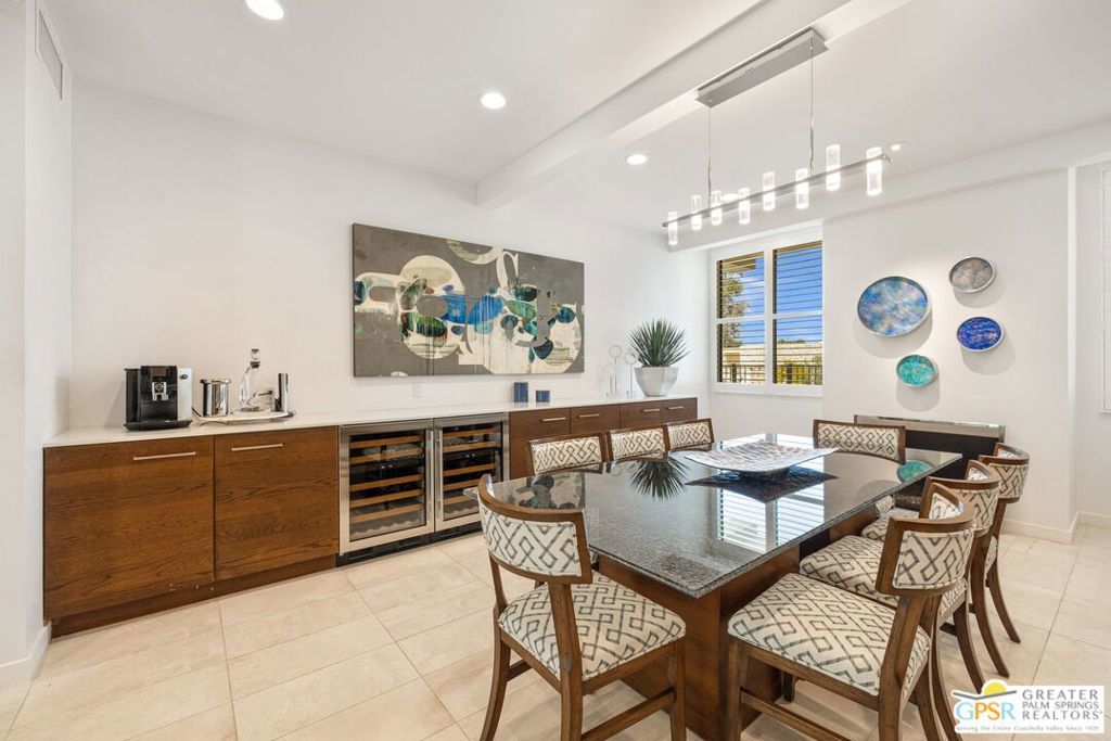 Distinctive mid-century residence at Seven Lakes Country Club. This expanded Richard A. Harrison design offers 3 bedrooms, 3 bathrooms, and 2,706 square feet all on a single level. Dramatic 10 foot ceilings, walls of glass, and multiple patios showcase striking mountain views and create seamless indoor and outdoor living. The south-facing orientation is a true highlight. Patios, living room, dining area, and primary suite all take in natural light and incredible views. The customized interior features an expansive chef's eat-in kitchen with gas fireplace, a spacious living room, and an adjacent formal dining area. The den or office is framed by sliding doors and clerestory windows which add to the home's modernist character. Each of the three ensuite bedrooms offers its own bath and outdoor connection. The primary suite enjoys dual vanities, a walk-in shower, and private patio access. Recent improvements include structural updates by architect Jeff Stoker, a smooth coat finish on interior walls, extensive plumbing updates, all windows and sliders replaced, and pocket doors added in the den/study. Systems have also been thoughtfully upgraded with a newer HVAC system and a Navien tankless water heater. The home is offered furnished, includes a golf cart, and features an EV charger installed in the carport.The community is designed for leisure with 15 pools and spas, tennis, a Ted Robinson executive par 58 golf course, and the iconic William Cody clubhouse with restaurant and bar just a short golf cart ride away. HOA provides 24-hour security. Take the Matterport virtual tour for the full experience of this one-of-a-kind home.