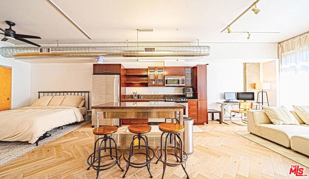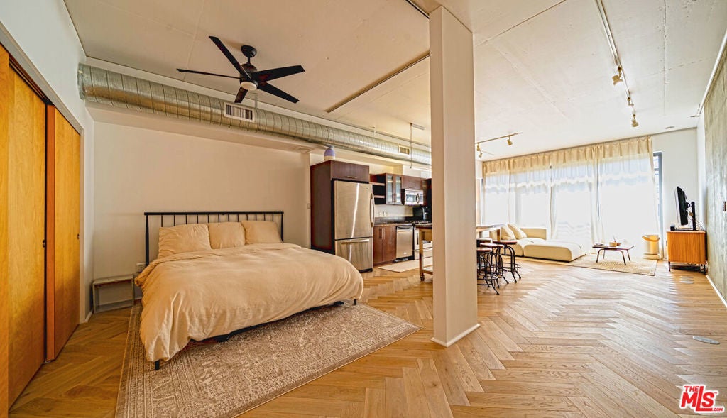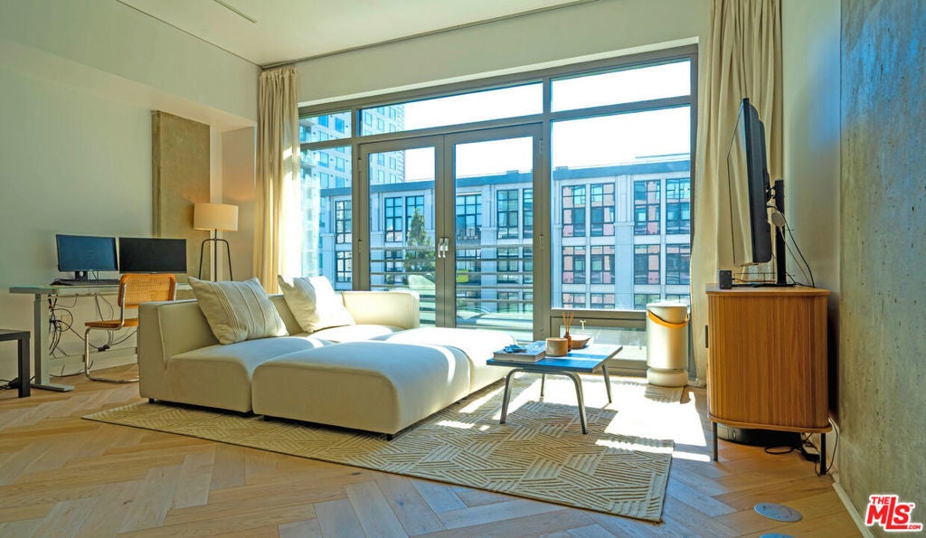 Luxury loft located in the coveted South Park, Downtown Los Angeles, LEEDS certified Elleven building. This versatile 7th-floor east-facing unit with high ceilings offers stunning panoramic city views through floor-to-ceiling windows, excellent natural light. The open layout is complemented by new herringbone white oak hardwood floors throughout, stainless steel appliances, a very large utility room with in-unit washer and dryer, and closets for ample storage. Additional features include NEST thermostat, in floor plugs, and a Juliette balcony. The unit also includes a deeded parking space conveniently located in garage near elevator, plus an additional locked storage currently rented month-to-month at $350/month. Residents at Elleven enjoy huge energy savings and lots of amenities, including a resort-style pool and spa, outdoor BBQ stations, fireplace, fitness center, sundeck, waterfall features, gas heat lamps, and the peace of mind of 24-hour security and concierge service. A Starbucks is conveniently located on the first floor for quick coffee breaks. The prime South Park location offers unbeatable walkability, with Whole Foods, LA Live, Crypto.com Arena (formerly Staples Center), shops, cafes, and top-rated restaurants just steps away. Easy freeway access makes commuting simple and efficient.