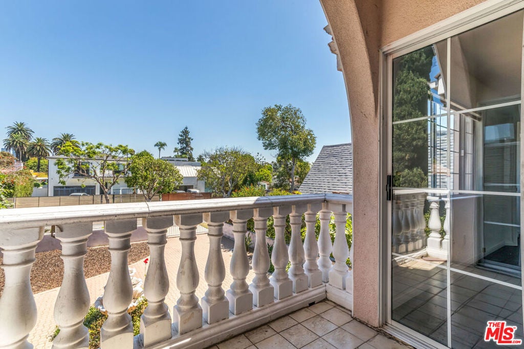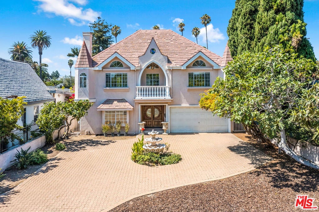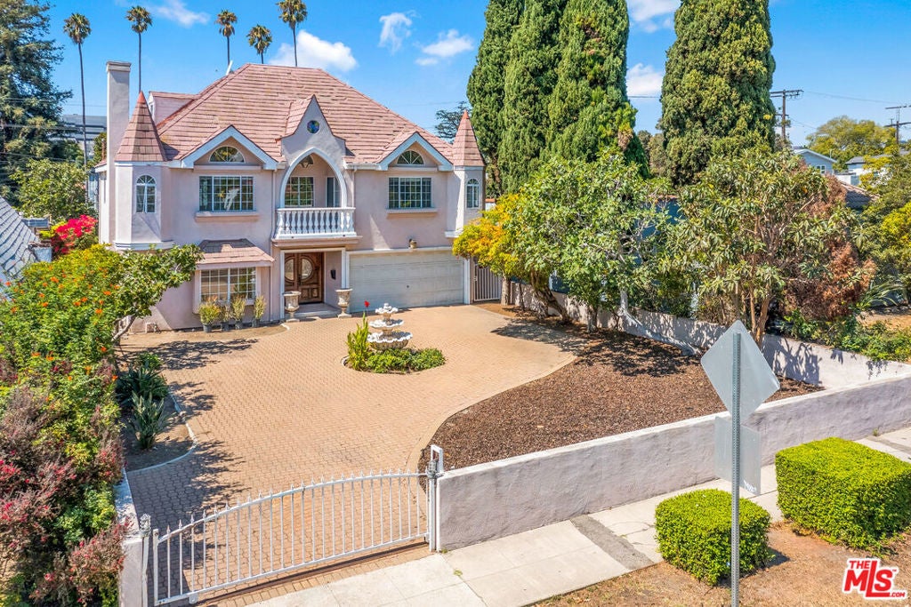 Located in a highly sought-after Westwood neighborhood, this exceptional Mediterranean estate offers five bedrooms, six bathrooms, spanning 3,550 sqft (per title). Situated behind a gated entrance with circular paver stone driveway, the property features a two-car garage, covered patio, and fully enclosed setting with privacy from the street. A formal entry introduces the expansive living and dining areas, connected by custom arched openings and accented by high ceilings, marble flooring, and natural light throughout. The kitchen is equipped with granite countertops, custom cabinetry, a center island, Viking range, and stainless-steel appliances. Multiple glass doors provide access to the backyard, allowing for seamless indoor-outdoor use. Upstairs, a custom spiral staircase leads to an expansive finished attic approx. 1,134 sqft, perfect for a home office, guest suite, playroom, or man-cave! Each of the five bedrooms features an en-suite bath, and direct access to their own private balcony. The large primary suite features a fireplace, dual walk-in closets, private balcony, and a spa-style bath with soaking tub and separate shower. The backyard features hardscape patio areas, multiple mature fruit trees, and low-maintenance landscaping ideal for entertaining. Prime Westwood location close to UCLA, Westfield Century City Mall, shopping and dining!
