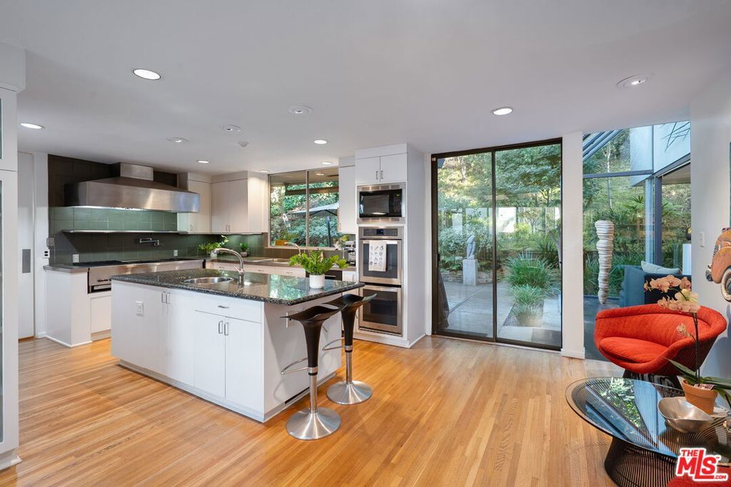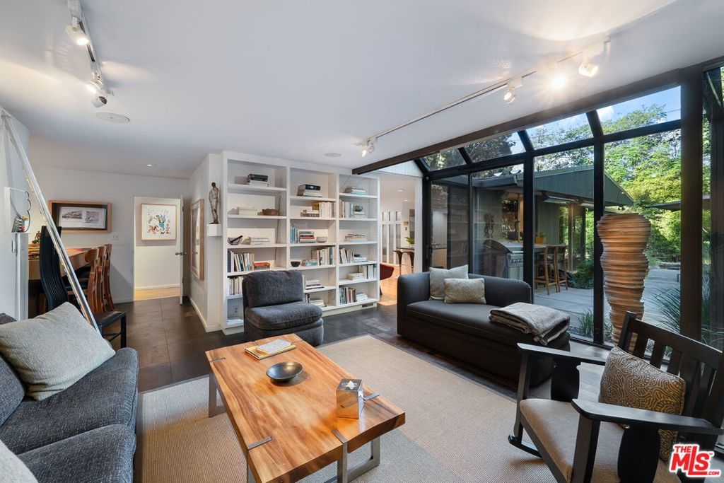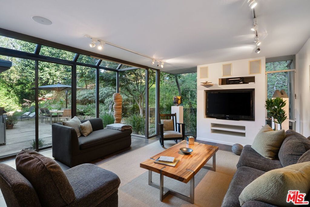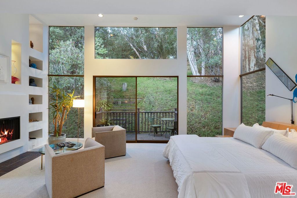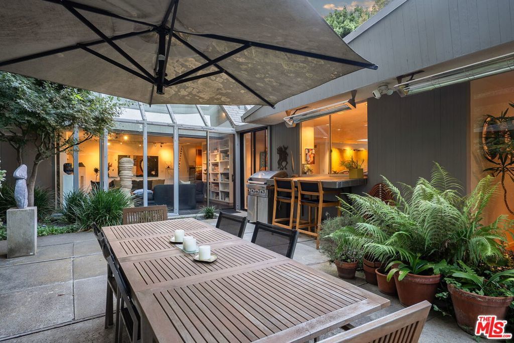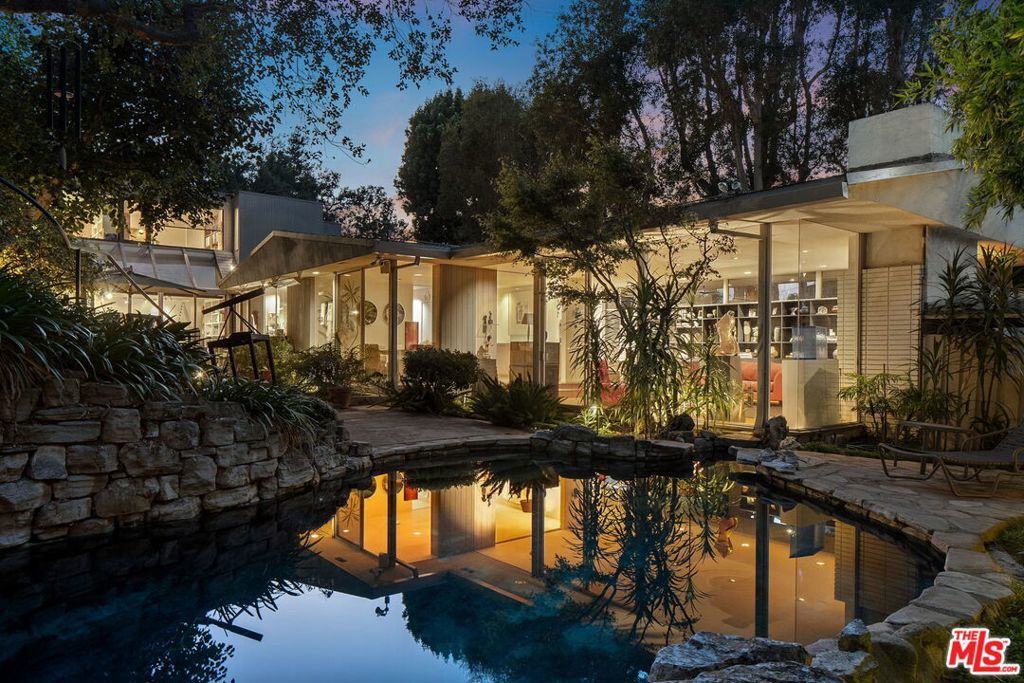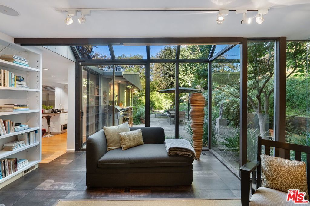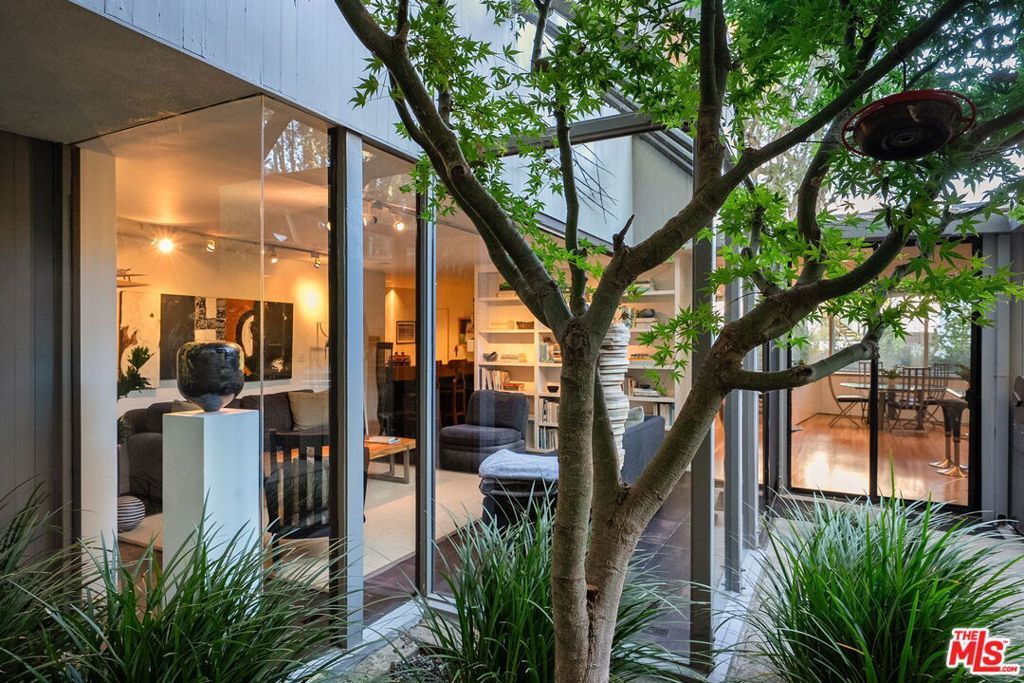 This stunning architectural residence by architects Benton and Park blends modern design with timeless elegance in the heart of Brentwood. Offering 4 bedrooms and 4 bathrooms, this home is filled with natural light and verdant green backyard views from floor-to-ceiling windows and skylights, creating seamless indoor-outdoor living. The upstairs private primary suite is a true retreat, complete with a sun deck, two large walk-in closets, and a spa-like bathroom. Designed for both work and leisure, the home includes two private offices, a family room with wet bar, a striking solarium, and conditioned wine storage. The chef's kitchen features professional-grade stainless appliances, an eat-in dining area, and an effortless flow to the center hall and living spaces. A dedicated laundry room and two-car garage add everyday convenience. Step outside to a lushly landscaped backyard oasis with a pool, waterfall, and hot tub, perfect for relaxation and entertaining. Central heating and air conditioning ensure year-round comfort. This is more than a home it's a rare architectural jewel offering style, comfort, and timeless sophistication in one of Los Angeles' most coveted neighborhoods, in a rare and quiet cul-de-sac location.