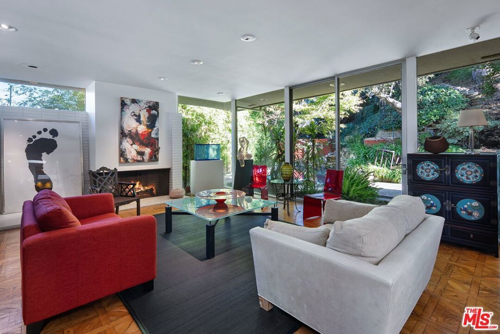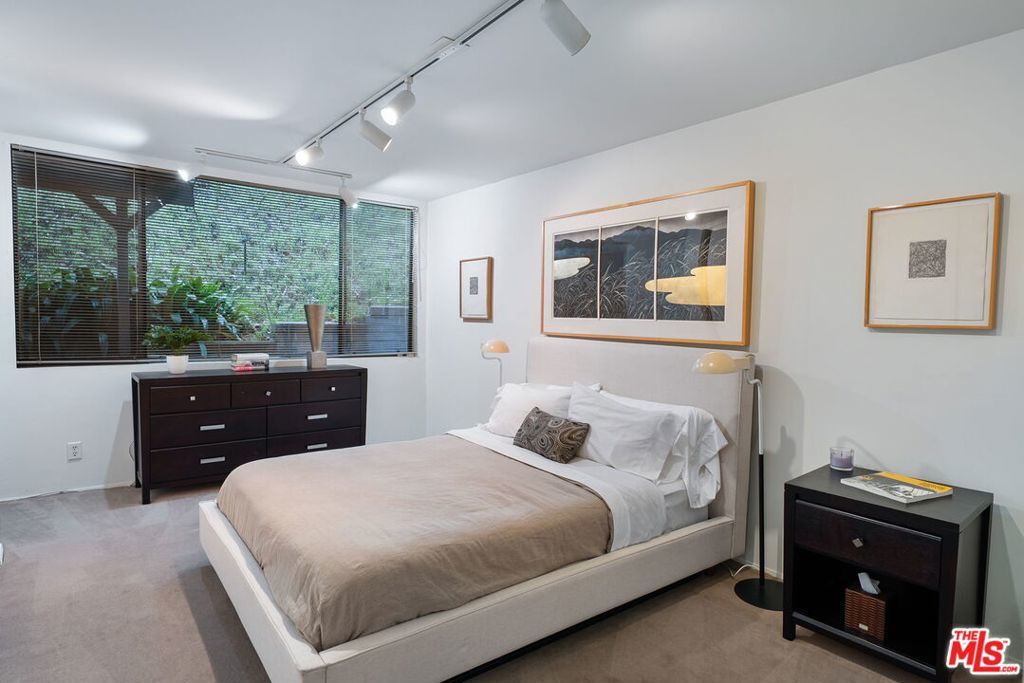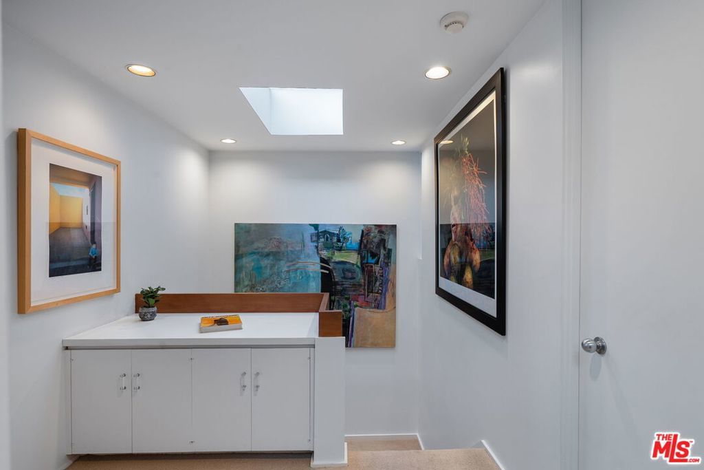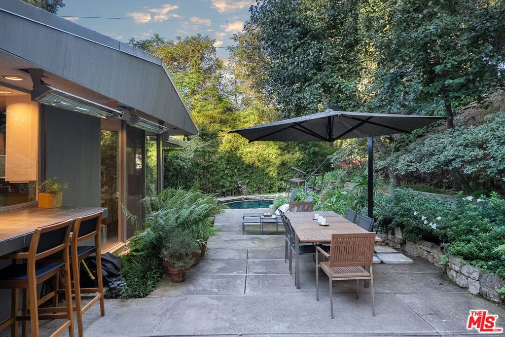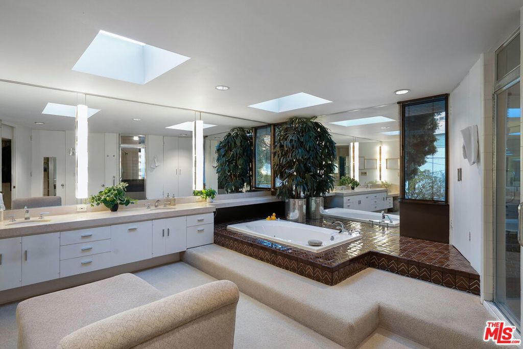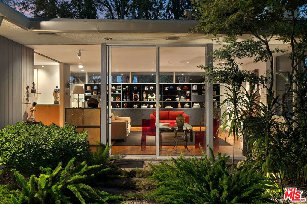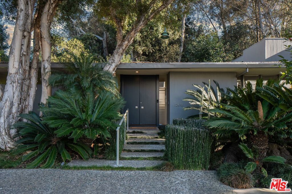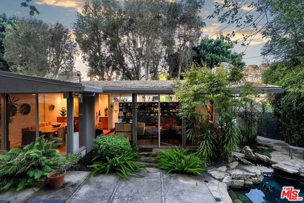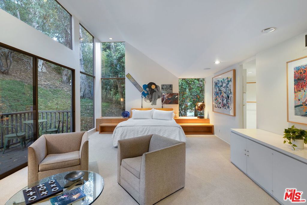 This stunning architectural residence by architects Benton and Park blends modern design with timeless elegance in the heart of Brentwood. Offering 4 bedrooms and 4 bathrooms, this home is filled with natural light and verdant green backyard views from floor-to-ceiling windows and skylights, creating seamless indoor-outdoor living. The upstairs private primary suite is a true retreat, complete with a sun deck, two large walk-in closets, and a spa-like bathroom. Designed for both work and leisure, the home includes two private offices, a family room with wet bar, a striking solarium, and conditioned wine storage. The chef's kitchen features professional-grade stainless appliances, an eat-in dining area, and an effortless flow to the center hall and living spaces. A dedicated laundry room and two-car garage add everyday convenience. Step outside to a lushly landscaped backyard oasis with a pool, waterfall, and hot tub, perfect for relaxation and entertaining. Central heating and air conditioning ensure year-round comfort. This is more than a home it's a rare architectural jewel offering style, comfort, and timeless sophistication in one of Los Angeles' most coveted neighborhoods, in a rare and quiet cul-de-sac location.
