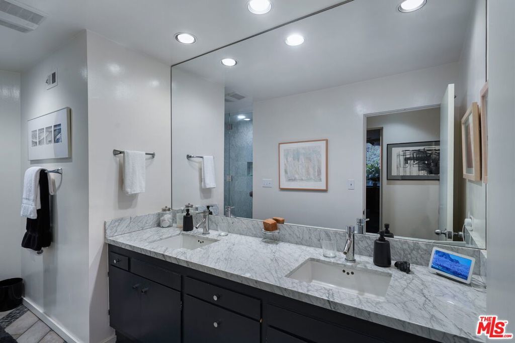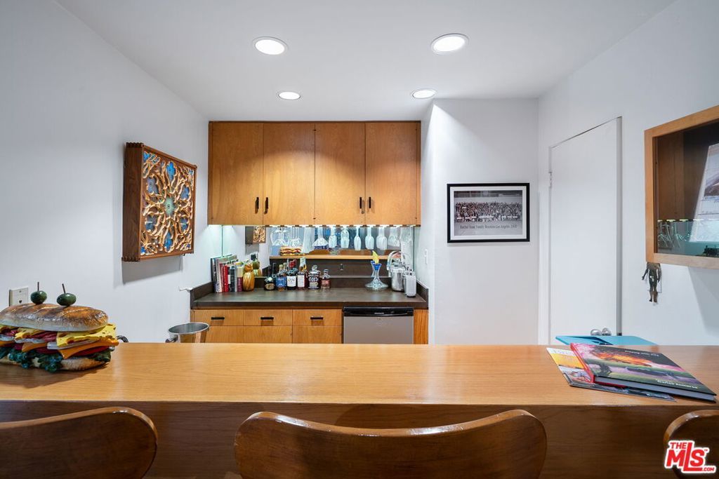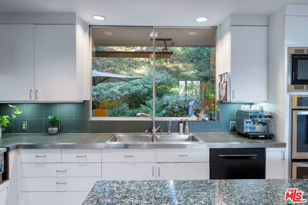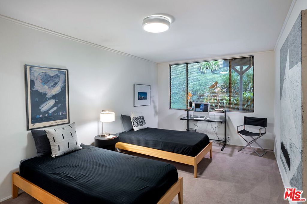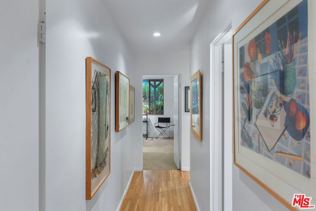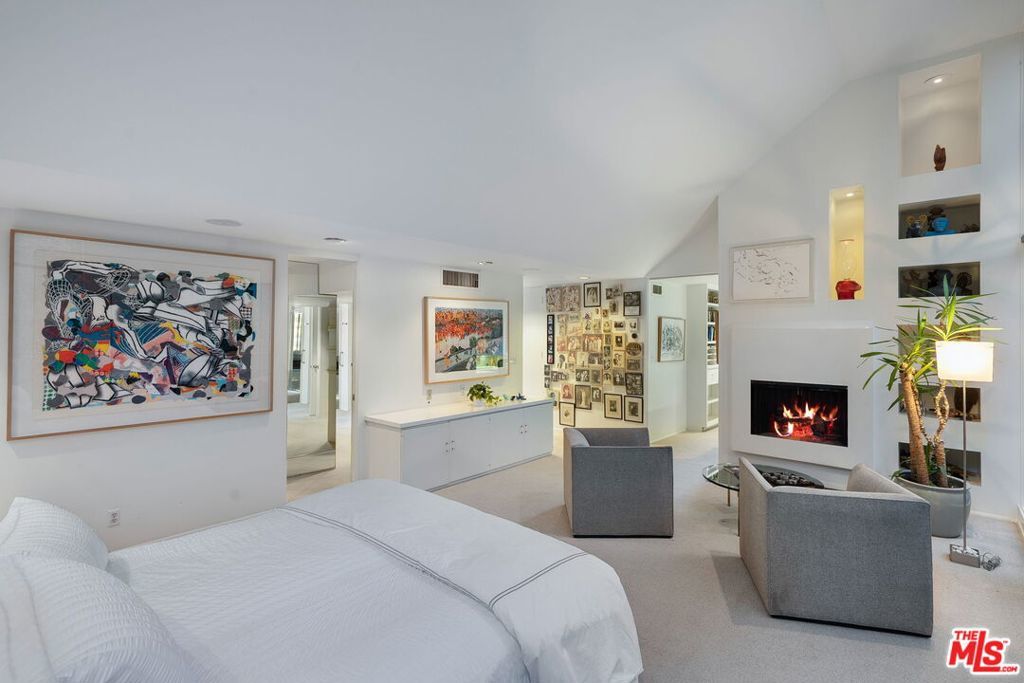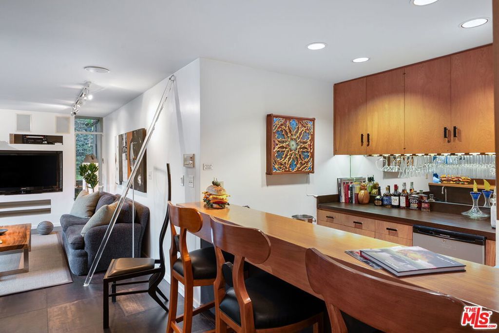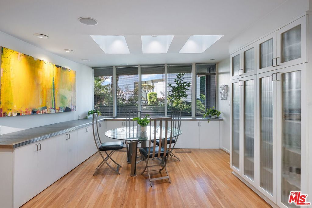 This stunning architectural residence by architects Benton and Park blends modern design with timeless elegance in the heart of Brentwood. Offering 4 bedrooms and 4 bathrooms, this home is filled with natural light and verdant green backyard views from floor-to-ceiling windows and skylights, creating seamless indoor-outdoor living. The upstairs private primary suite is a true retreat, complete with a sun deck, two large walk-in closets, and a spa-like bathroom. Designed for both work and leisure, the home includes two private offices, a family room with wet bar, a striking solarium, and conditioned wine storage. The chef's kitchen features professional-grade stainless appliances, an eat-in dining area, and an effortless flow to the center hall and living spaces. A dedicated laundry room and two-car garage add everyday convenience. Step outside to a lushly landscaped backyard oasis with a pool, waterfall, and hot tub, perfect for relaxation and entertaining. Central heating and air conditioning ensure year-round comfort. This is more than a home it's a rare architectural jewel offering style, comfort, and timeless sophistication in one of Los Angeles' most coveted neighborhoods, in a rare and quiet cul-de-sac location.
