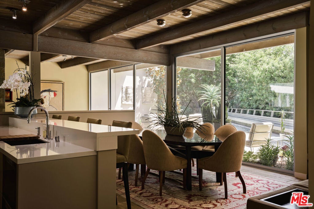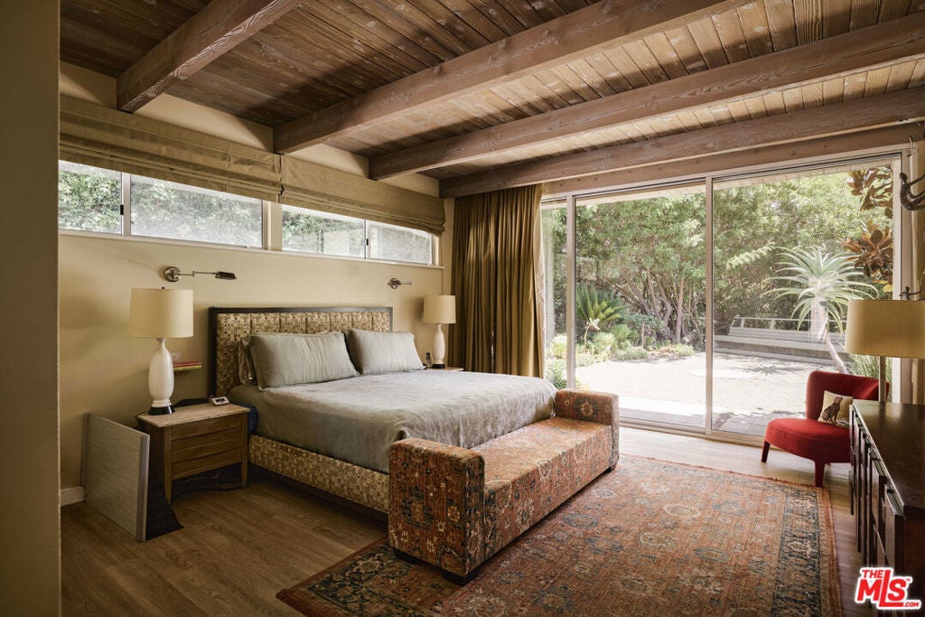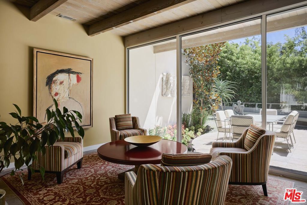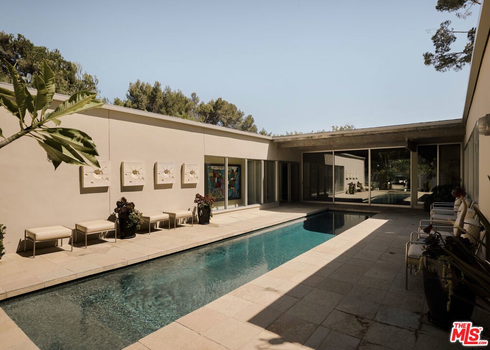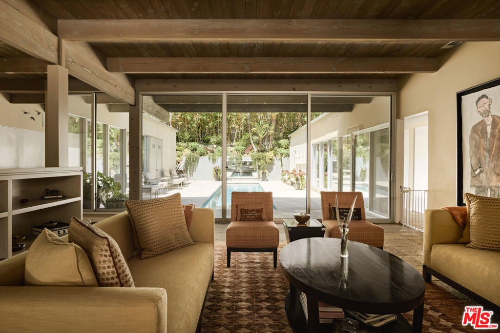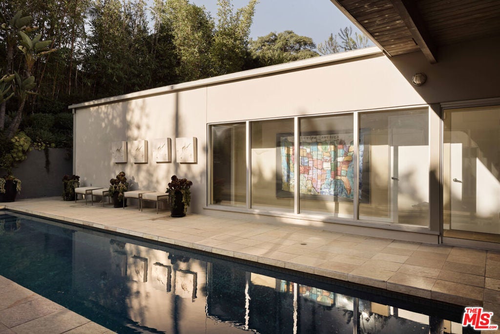Step into this reimagined Post & Beam mid-century retreat, impeccably maintained with uncompromising attention to detail. Nestled in a serene Brentwood canyon setting, this 4-bedroom, 4.5-bathroom residence embodies timeless architecture. The signature atrium floor plan, framed by walls of glass and centered around a lap pool, seamlessly connects indoor and outdoor living while filling the home with natural light. At the heart of the residence, a new chef's kitchen with Viking and Sub-Zero appliances, a center island with a separate sink and custom finishes. This creates the perfect gathering space for both intimate dinners and large-scale entertaining. Framed by a striking double-sided fireplace, the living room offers two distinct sitting areas, each with sliding glass doors that open to the pool and backyard for seamless indoor-outdoor living, while a signature mid-century bookcase adds architectural character to the space. Each bedroom is ensuite and two of the three guest rooms have direct access to a large side yard, ideal for a sauna + cold plunge. The primary suite is a serene retreat with spa-like amenities, including a jetted tub, a walk-in closet with custom cabinetry, and a sliding glass door that opens directly to the backyard. Outside the primary bathroom, there's a custom dog run, which creates a private outdoor space for your furry friends. Beyond the interiors, there are multiple outdoor spaces including a front yard that could be used as a potential playground for kids. Situated just a short stroll from Kenter Elementary, yet far enough to avoid school traffic. Now featured by Dwell Magazine.
