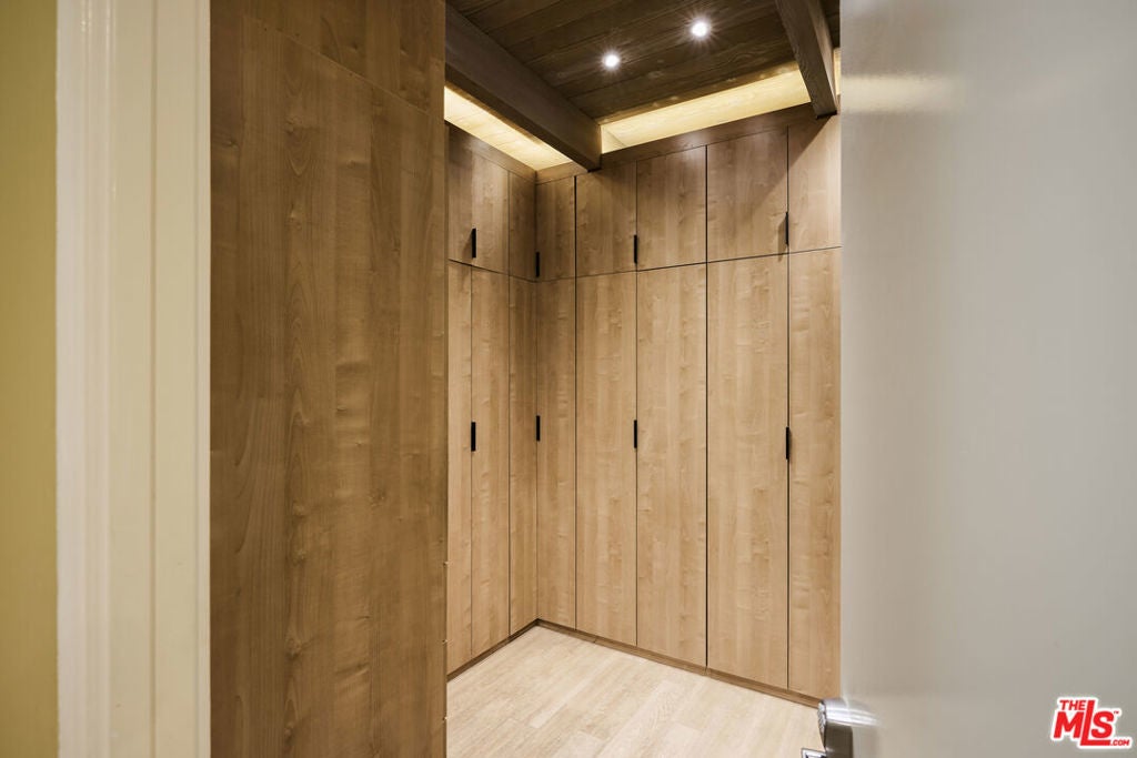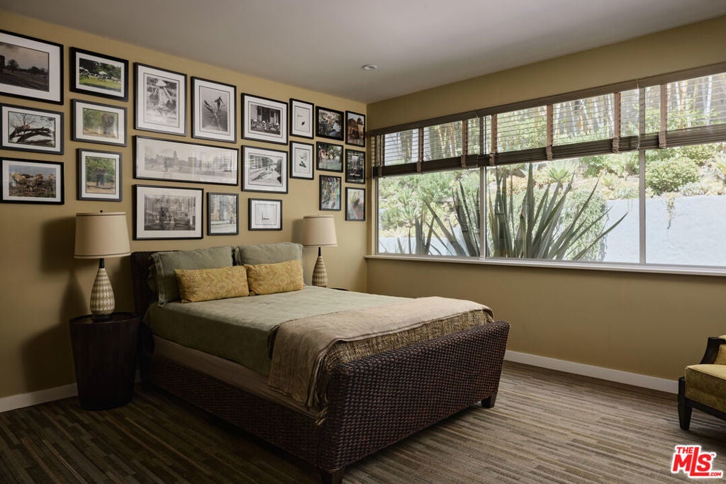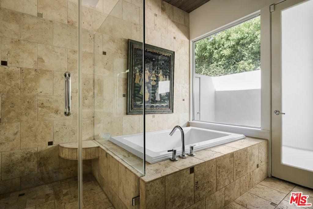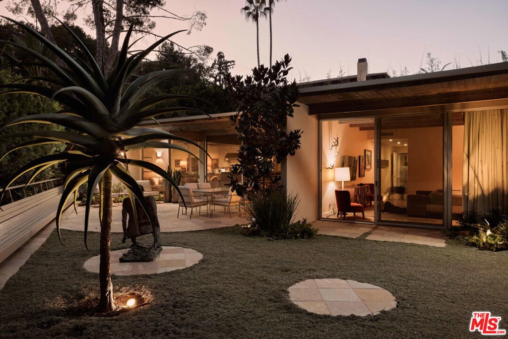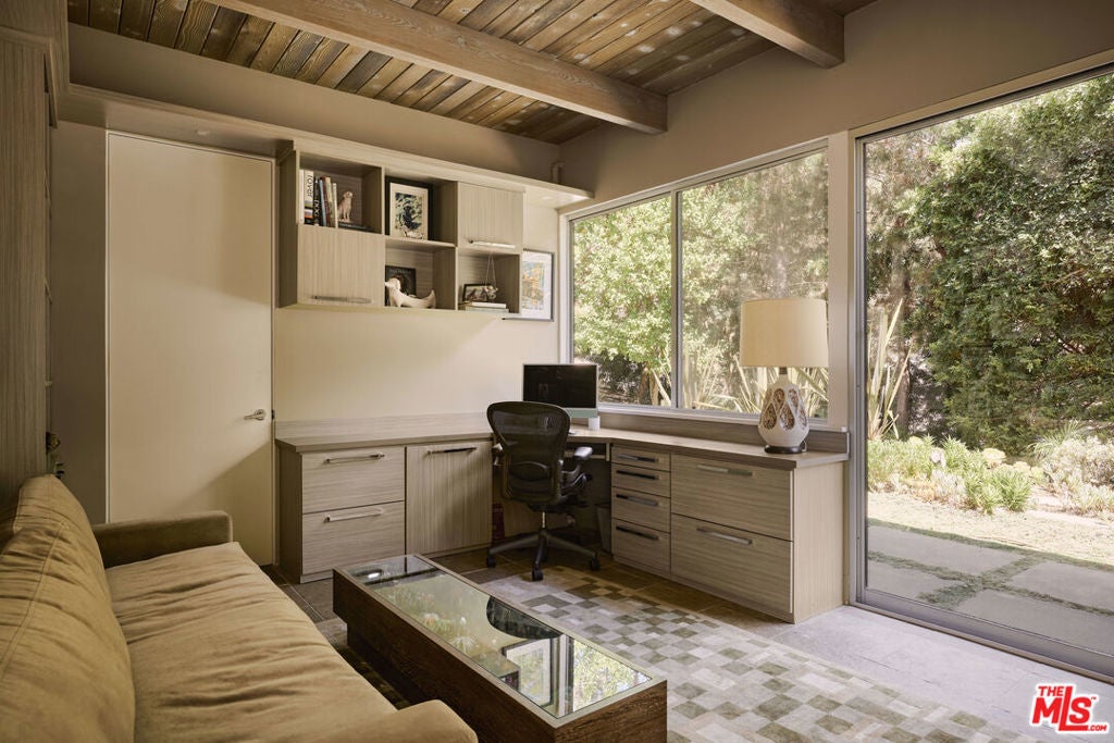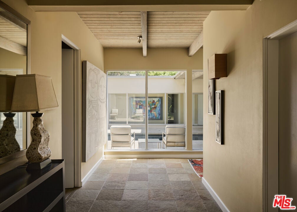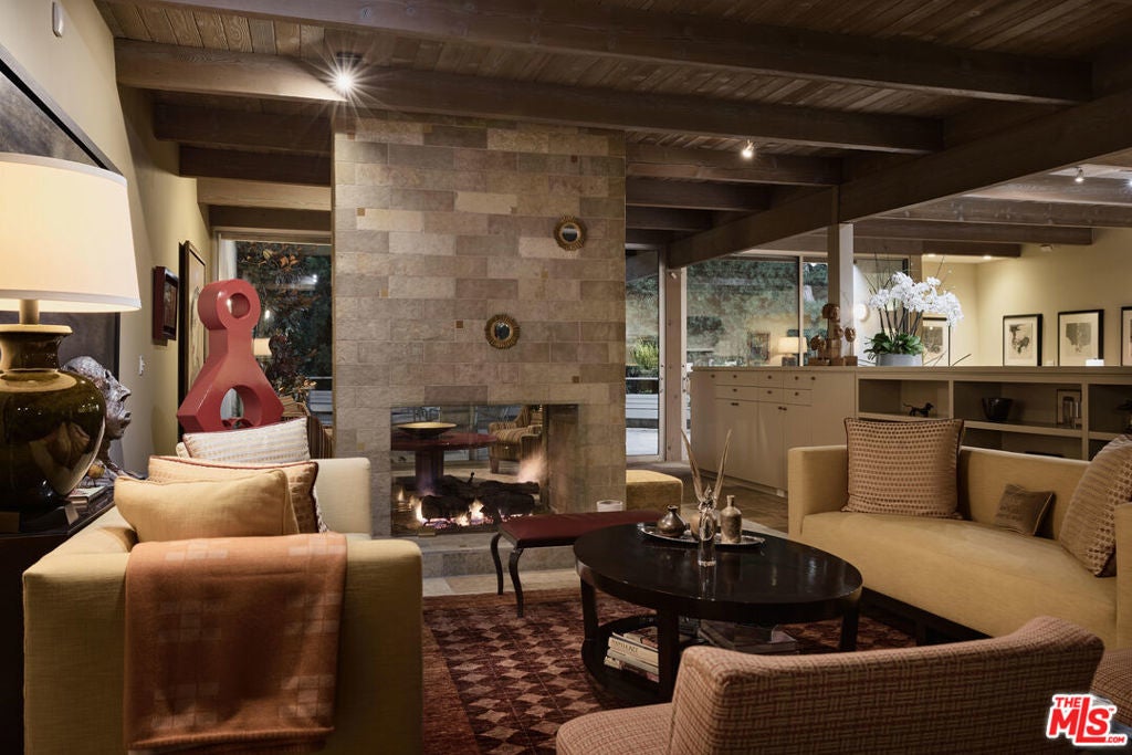 Step into this reimagined Post & Beam mid-century retreat, impeccably maintained with uncompromising attention to detail. Nestled in a serene Brentwood canyon setting, this 4-bedroom, 4.5-bathroom residence embodies timeless architecture. The signature atrium floor plan, framed by walls of glass and centered around a lap pool, seamlessly connects indoor and outdoor living while filling the home with natural light. At the heart of the residence, a new chef's kitchen with Viking and Sub-Zero appliances, a center island with a separate sink and custom finishes. This creates the perfect gathering space for both intimate dinners and large-scale entertaining. Framed by a striking double-sided fireplace, the living room offers two distinct sitting areas, each with sliding glass doors that open to the pool and backyard for seamless indoor-outdoor living, while a signature mid-century bookcase adds architectural character to the space. Each bedroom is ensuite and two of the three guest rooms have direct access to a large side yard, ideal for a sauna + cold plunge. The primary suite is a serene retreat with spa-like amenities, including a jetted tub, a walk-in closet with custom cabinetry, and a sliding glass door that opens directly to the backyard. Outside the primary bathroom, there's a custom dog run, which creates a private outdoor space for your furry friends. Beyond the interiors, there are multiple outdoor spaces including a front yard that could be used as a potential playground for kids. Situated just a short stroll from Kenter Elementary, yet far enough to avoid school traffic. Now featured by Dwell Magazine.