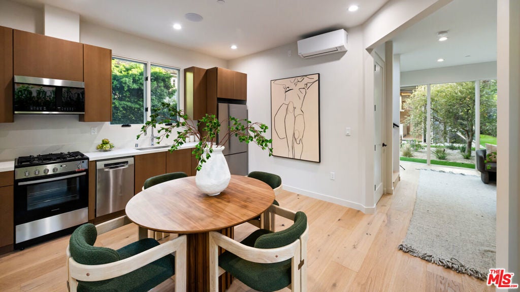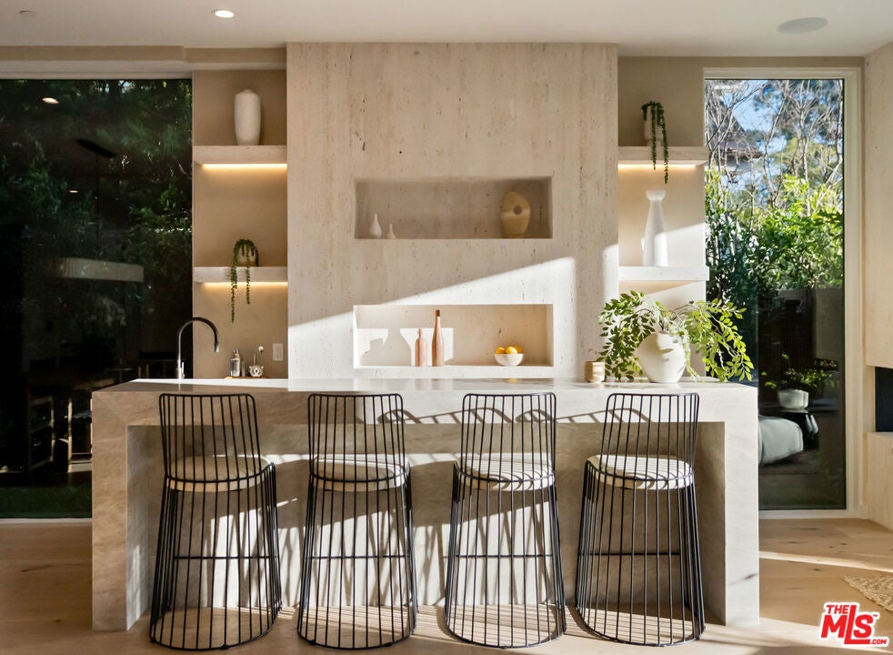 Newly completed following an extensive six-month renovation and offered for the first time, this North of Montana residence pairs disciplined modern architecture with a fully realized amenity program and exceptional indooroutdoor flow. The home spans three thoughtfully planned levels with private elevator access, delivering scale, privacy, and seamless functionality for both daily living and large-format entertaining. The main residence includes five bedrooms and seven bathrooms with expansive open-concept living and dining areas framed by oversized glazing and folding glass walls. Light moves through the home from multiple exposures, enhanced by clean ceiling lines, skylights, and wide-plank flooring that carries a consistent, warm modern palette throughout. At the center, a double-island chef's kitchen is finished in Taj Mahal quartzite with top-tier appliances and integrated storage, opening directly to the primary living spaces and exterior terraces for effortless hosting. Interiors are defined by refined material continuity and architectural restraint, including four limestone fireplaces, a newly executed primary bath, a custom-designed closet, and a redesigned powder room. Large picture windows capture garden views and mature greenery with beautiful olive trees, creating a calm, gallery-like backdrop across living areas and bedrooms. A comprehensive lower level includes a private movie theater, fully equipped gym, wine cellar and meditation room forming a true at-home retreat across multiple levels. The exterior is designed as a direct extension of the interior program: folding glass doors open to landscaped grounds with a pool and spa, an eight-jet water feature, integrated LED lighting, an outdoor fireplace, multiple lounge zones, and grassy play areas. Newly installed landscaping and mature olive trees provide structure and privacy, while the overall plan supports both relaxed daily use and entertaining at scale. Additional highlights include an expansive rooftop deck with ocean views and a 1,050-square-foot two-story ADU complete with two bedrooms, one and a half bathrooms, with living room, kitchen, and in-unit washer/dryer ideal for extended stays, guests, staff, or flexible work-from-home living. A newly completed, design-forward offering in one Santa Monica's most established and sought-after neighborhood.