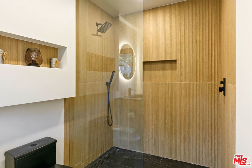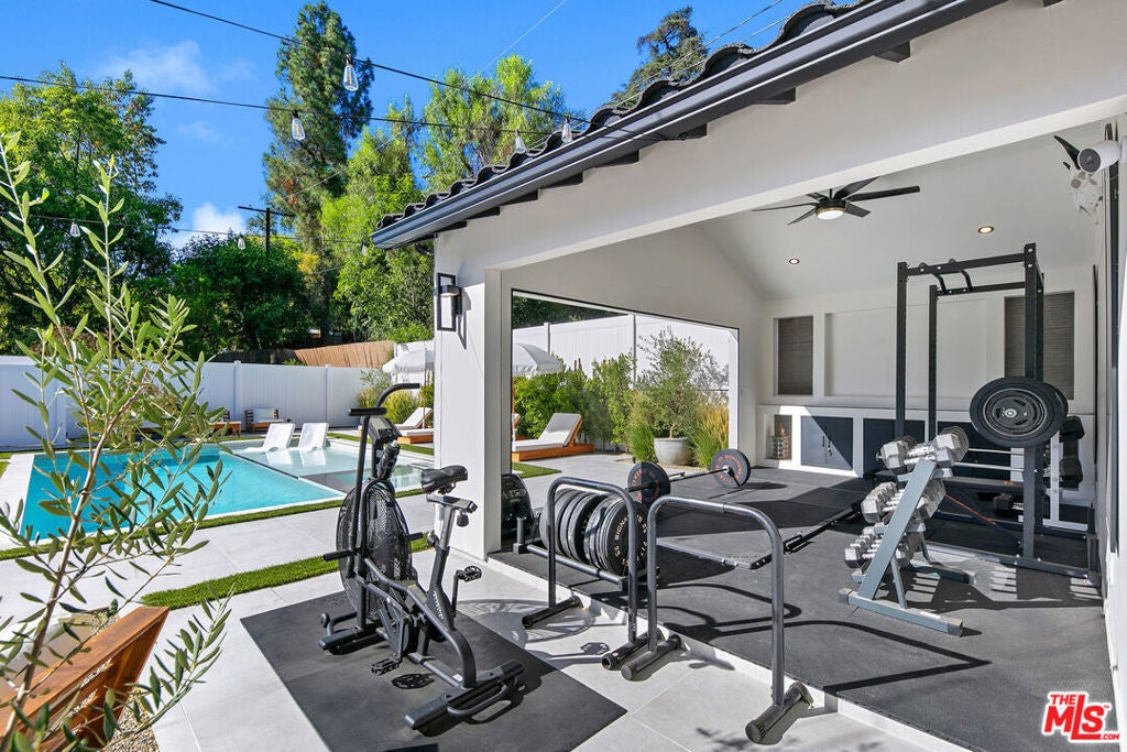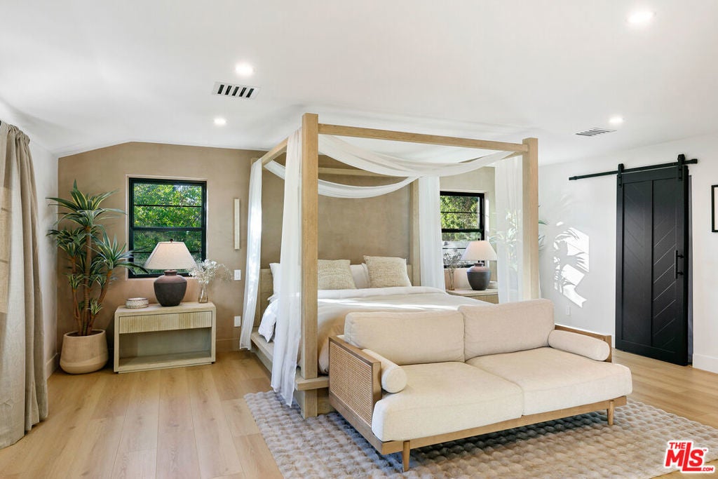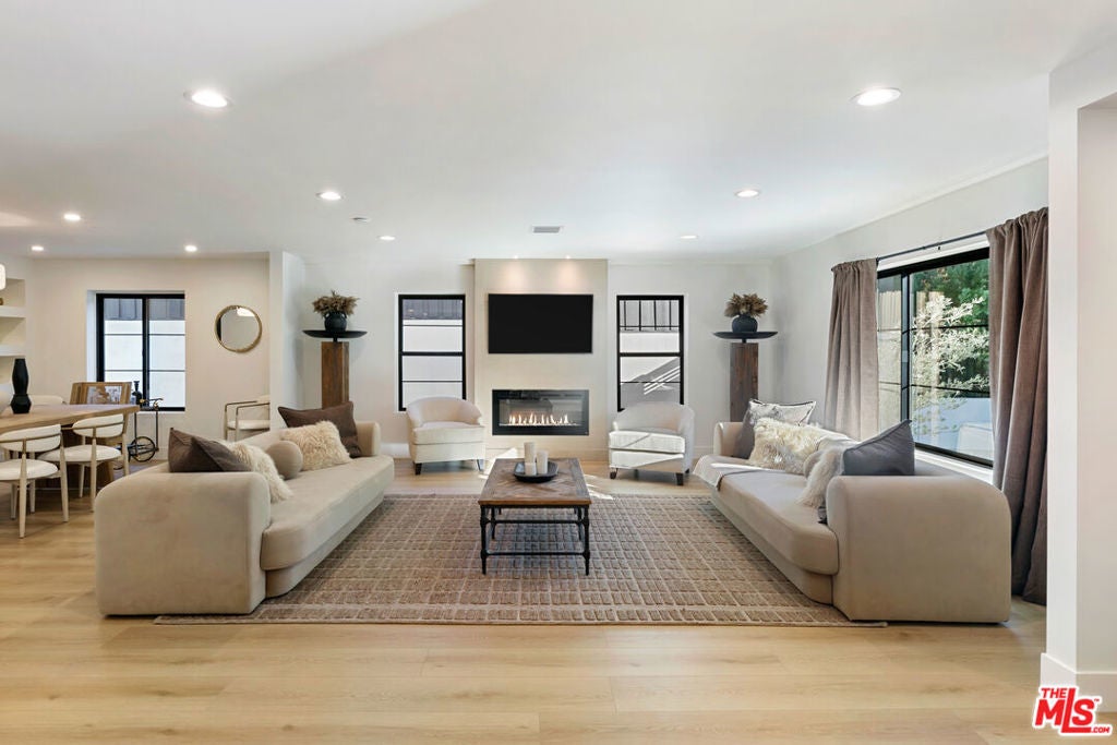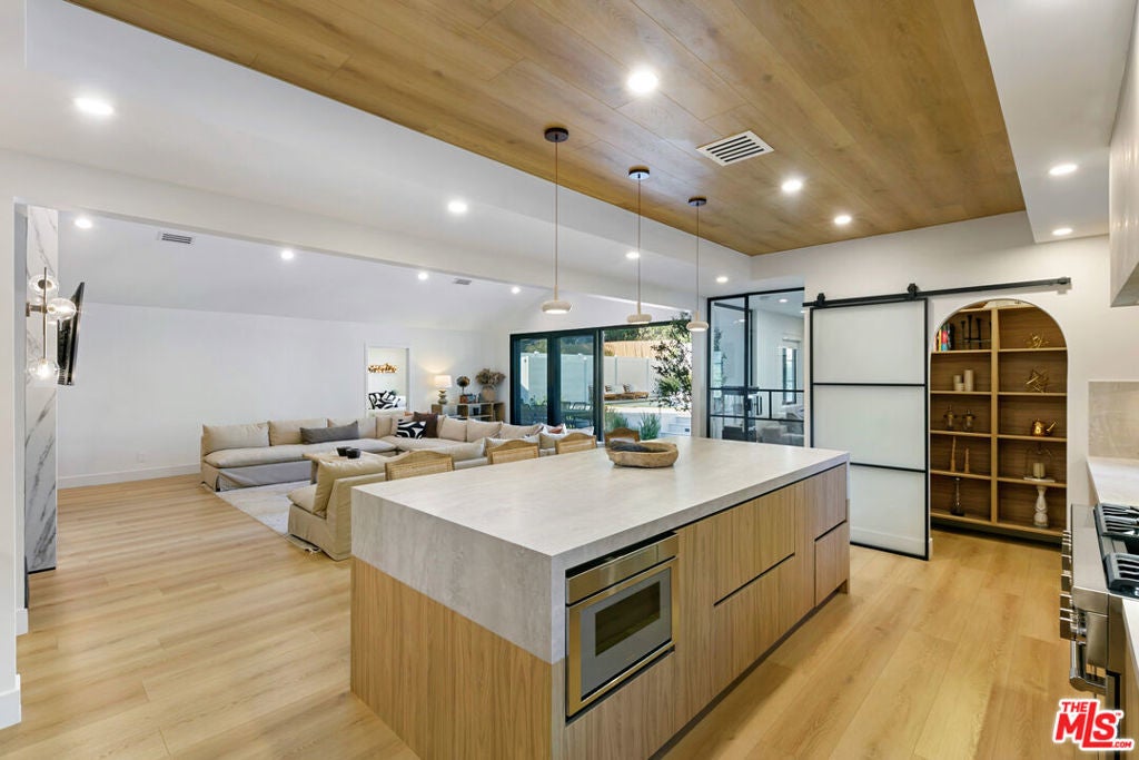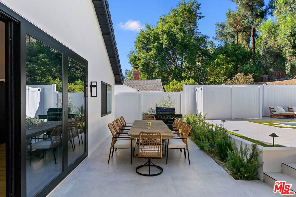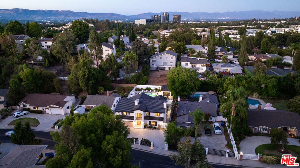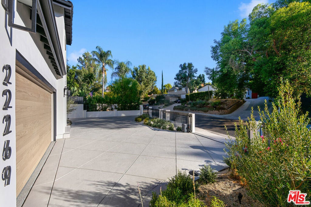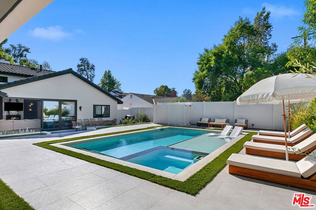 Contemporary Woodland Hills retreat with a resort-style pool and cabana! Tucked behind gates on a beautifully landscaped lot, this extensively renovated custom home blends upscale design with the ease of indoor-outdoor California living. Designed with high-end finishes throughout, including Roman Clay walls, soaring ceilings, and wide-plank White Oak floors, the home exudes a warm yet sophisticated aesthetic. The main level features a light-filled living room with a gas fireplace and an elegant dining area with a built-in bar. The gourmet kitchen is a chef's dream, complete with Thermador appliances, a walk-in pantry, and a center island with bar seating. Adjacent to the kitchen, there's a versatile media room, and an open-concept family room with a gas fireplace that flows seamlessly through sliding accordion doors to the backyard oasis. Outside, you'll find a sparkling pool and spa, al fresco dining, multiple lounge areas, and a cabana currently set up as a gym yet easily adaptable for an entertaining space. Upstairs, the luxurious primary suite boasts a gas fireplace, dual walk-in closets, a built-in vanity, and a private balcony. The spa-inspired bathroom offers a freestanding tub and refined finishes. All bedrooms are en-suite, with two conveniently located on the main level and the remainder upstairs, ensuring privacy and comfort for family and guests. Additional highlights include a temperature-controlled wine cellar, ample storage, a two-car garage, and a drive-in/drive-out motor court. Conveniently located near the 101 and moments from local amenities such as The Commons at Calabasas, The Village, Westfield Topanga, markets, and dining, this residence embodies upscale Woodland Hills living at its finest.