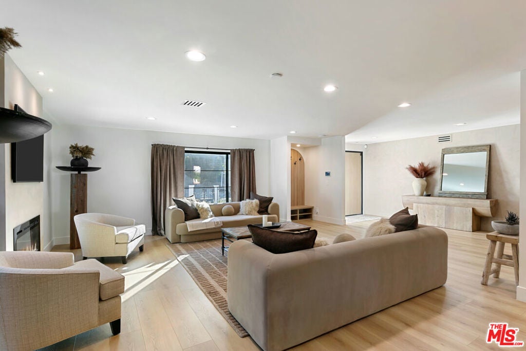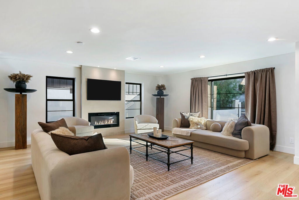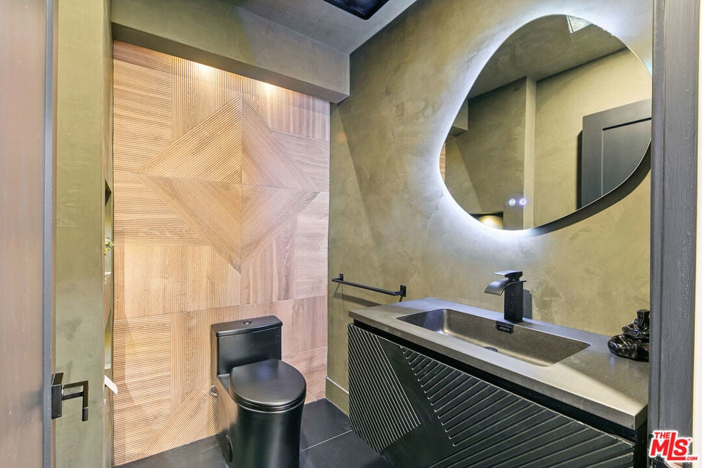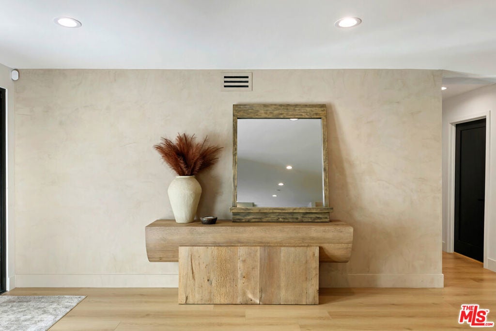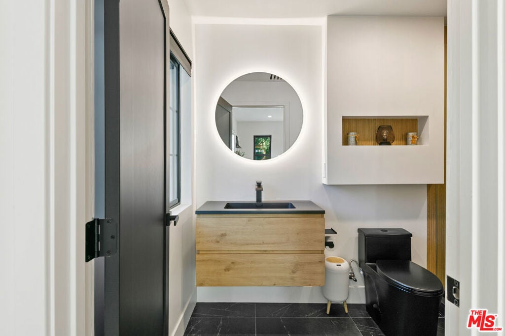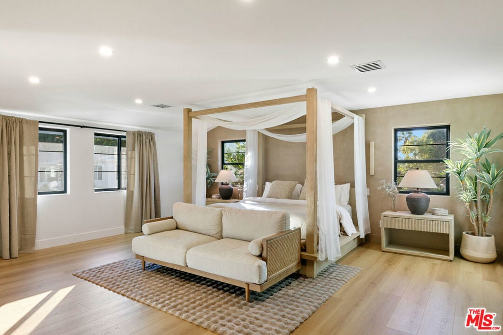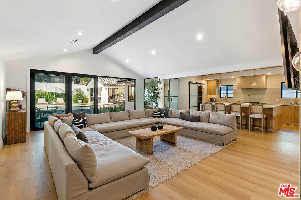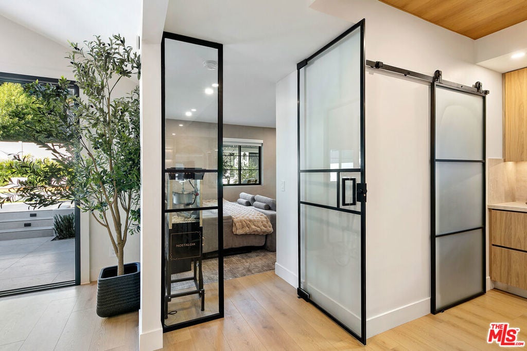 Contemporary Woodland Hills retreat with a resort-style pool and cabana! Tucked behind gates on a beautifully landscaped lot, this extensively renovated custom home blends upscale design with the ease of indoor-outdoor California living. Designed with high-end finishes throughout, including Roman Clay walls, soaring ceilings, and wide-plank White Oak floors, the home exudes a warm yet sophisticated aesthetic. The main level features a light-filled living room with a gas fireplace and an elegant dining area with a built-in bar. The gourmet kitchen is a chef's dream, complete with Thermador appliances, a walk-in pantry, and a center island with bar seating. Adjacent to the kitchen, there's a versatile media room, and an open-concept family room with a gas fireplace that flows seamlessly through sliding accordion doors to the backyard oasis. Outside, you'll find a sparkling pool and spa, al fresco dining, multiple lounge areas, and a cabana currently set up as a gym yet easily adaptable for an entertaining space. Upstairs, the luxurious primary suite boasts a gas fireplace, dual walk-in closets, a built-in vanity, and a private balcony. The spa-inspired bathroom offers a freestanding tub and refined finishes. All bedrooms are en-suite, with two conveniently located on the main level and the remainder upstairs, ensuring privacy and comfort for family and guests. Additional highlights include a temperature-controlled wine cellar, ample storage, a two-car garage, and a drive-in/drive-out motor court. Conveniently located near the 101 and moments from local amenities such as The Commons at Calabasas, The Village, Westfield Topanga, markets, and dining, this residence embodies upscale Woodland Hills living at its finest.