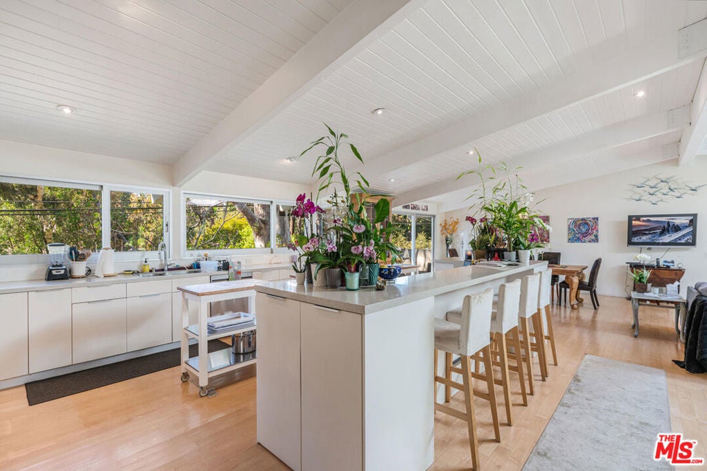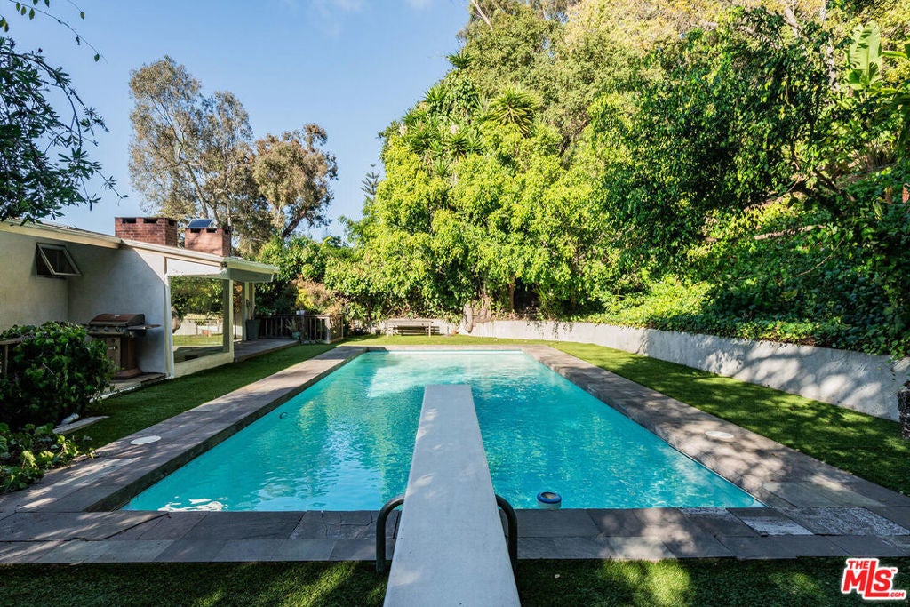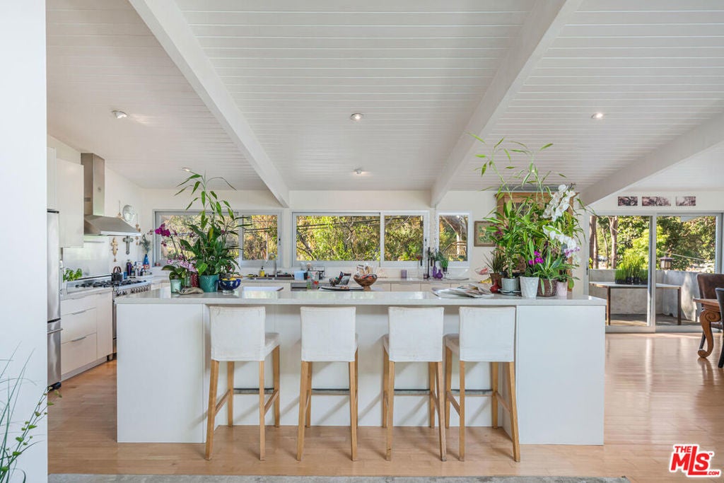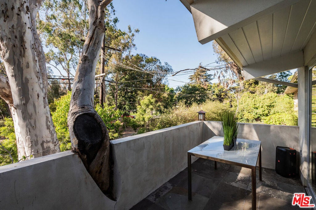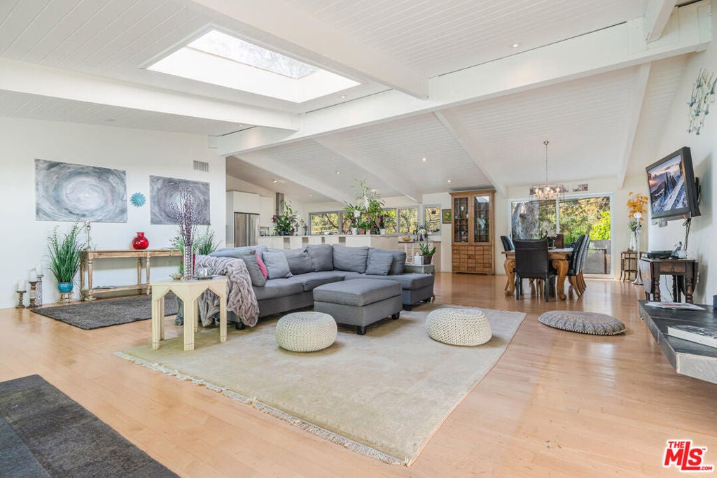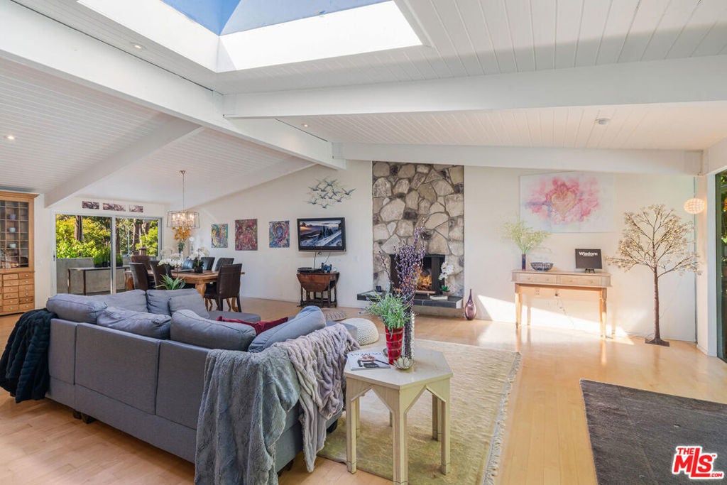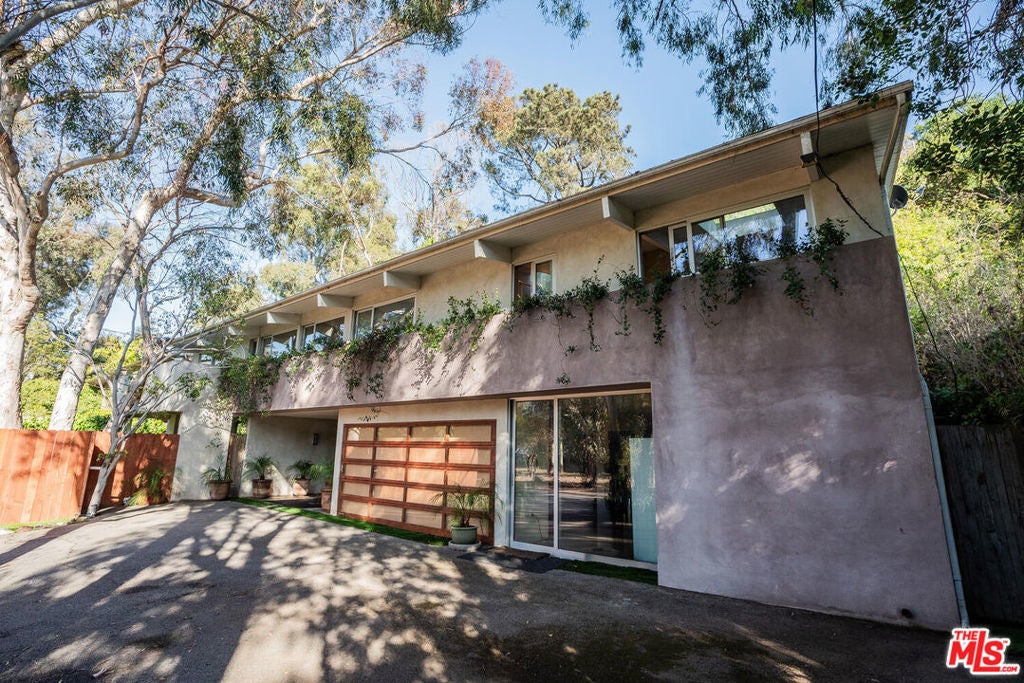 Beautiful midcentury architectural retreat in Rustic Canyon. Set on an expansive approximately 17,522 sq ft lot, this serene, light-filled four-bedroom, five-bath home showcases floor-to-ceiling glass for effortless indoor outdoor flow. Enter through a hand-carved wood door to a flexible lower level with a large bedroom or media room on the left and a three-car garage currently converted to bonus space on the right, ideal for studio, office, or gym. Warm natural finishes include a stone fireplace, skylights, and beamed ceilings. Upstairs, the sunlit kitchen and family room open to patios and a pool; three additional bedrooms, including the primary suite, are on this level, and all bedrooms feature ensuite baths. The bright kitchen overlooks a sunny pool framed by mature trees and lush landscaping. The property faces the protected historic Eucalyptus Grove and sits next to Rustic Canyon Park with twelve public tennis courts, a basketball court, playground, community center, and picnic lawns. Enjoy tranquil country living close in with ocean breezes and quiet tree-lined streets, minutes to the beach, Palisades Village, and Montana Avenue shops and dining.