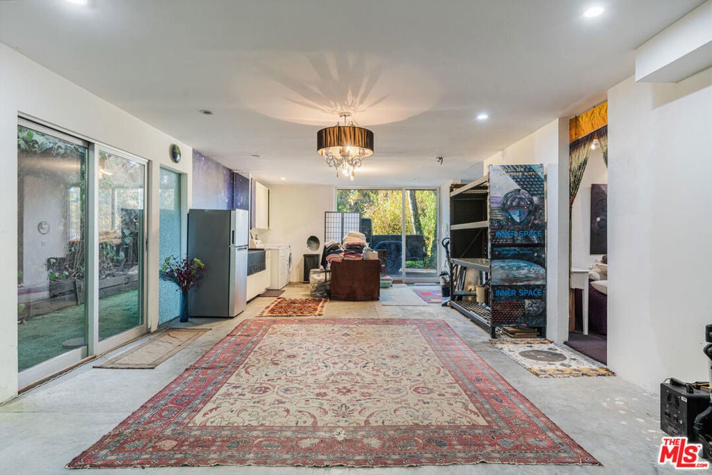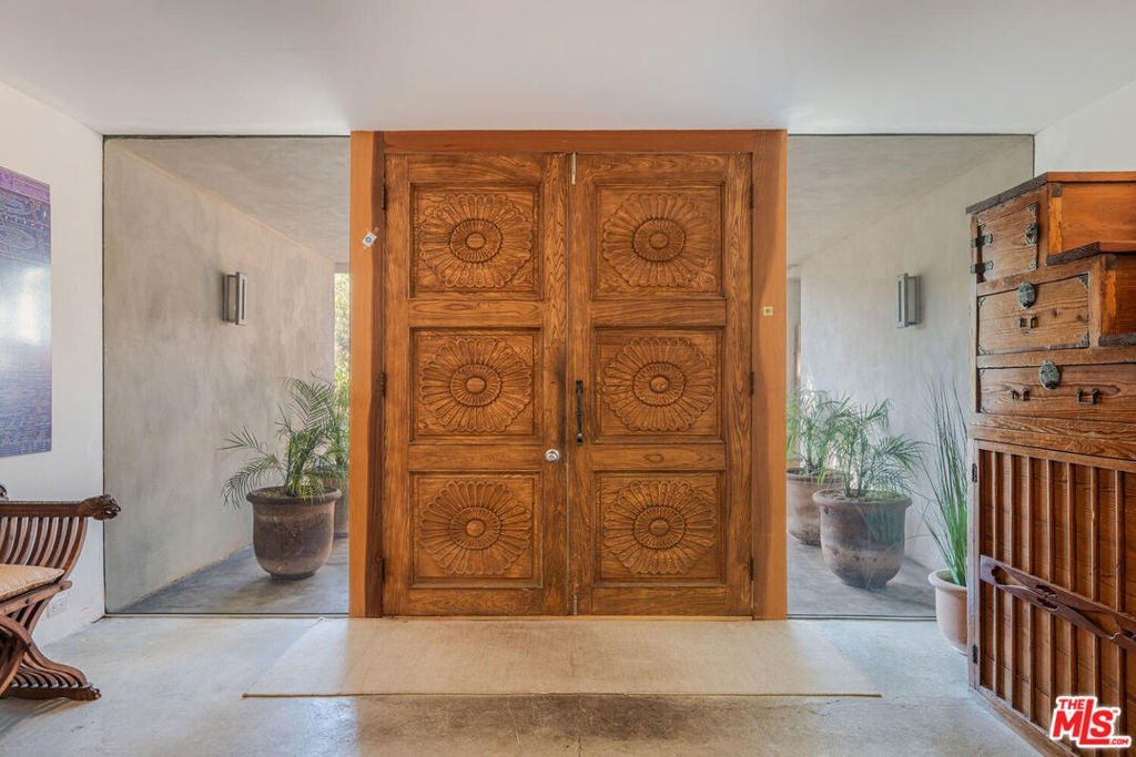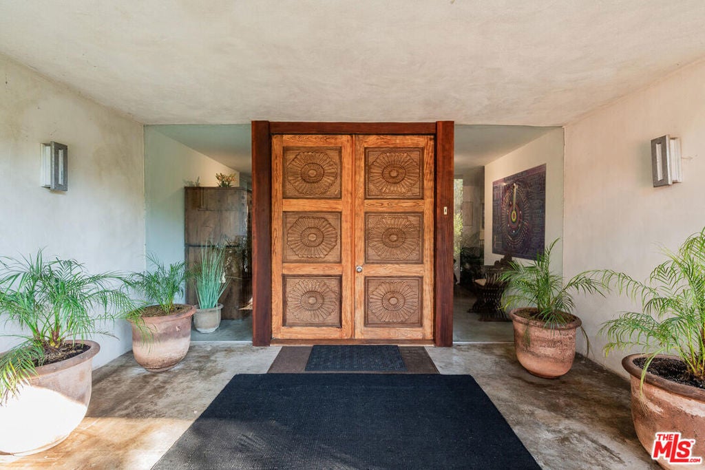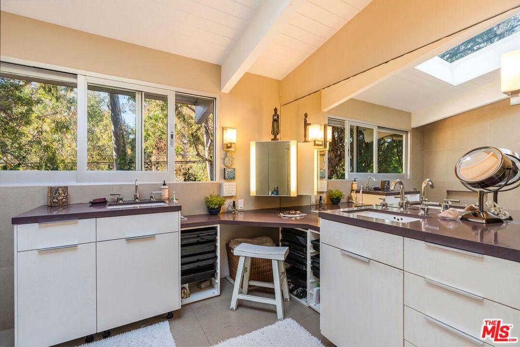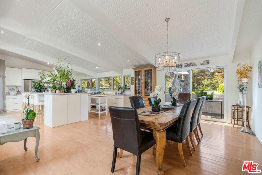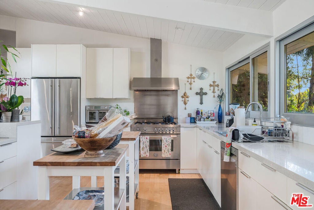 Beautiful midcentury architectural retreat in Rustic Canyon. Set on an expansive approximately 17,522 sq ft lot, this serene, light-filled four-bedroom, five-bath home showcases floor-to-ceiling glass for effortless indoor outdoor flow. Enter through a hand-carved wood door to a flexible lower level with a large bedroom or media room on the left and a three-car garage currently converted to bonus space on the right, ideal for studio, office, or gym. Warm natural finishes include a stone fireplace, skylights, and beamed ceilings. Upstairs, the sunlit kitchen and family room open to patios and a pool; three additional bedrooms, including the primary suite, are on this level, and all bedrooms feature ensuite baths. The bright kitchen overlooks a sunny pool framed by mature trees and lush landscaping. The property faces the protected historic Eucalyptus Grove and sits next to Rustic Canyon Park with twelve public tennis courts, a basketball court, playground, community center, and picnic lawns. Enjoy tranquil country living close in with ocean breezes and quiet tree-lined streets, minutes to the beach, Palisades Village, and Montana Avenue shops and dining.