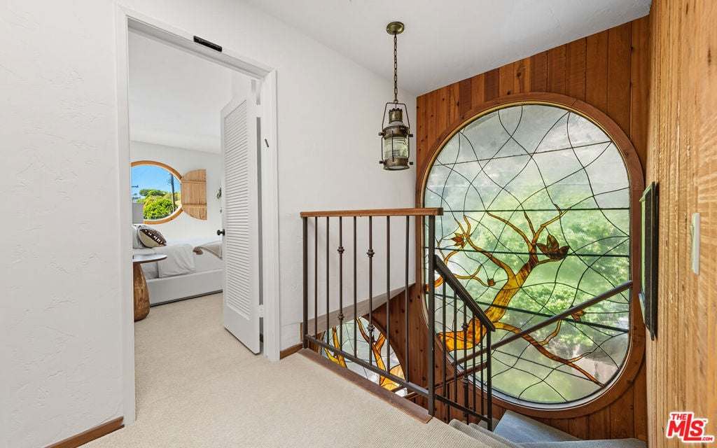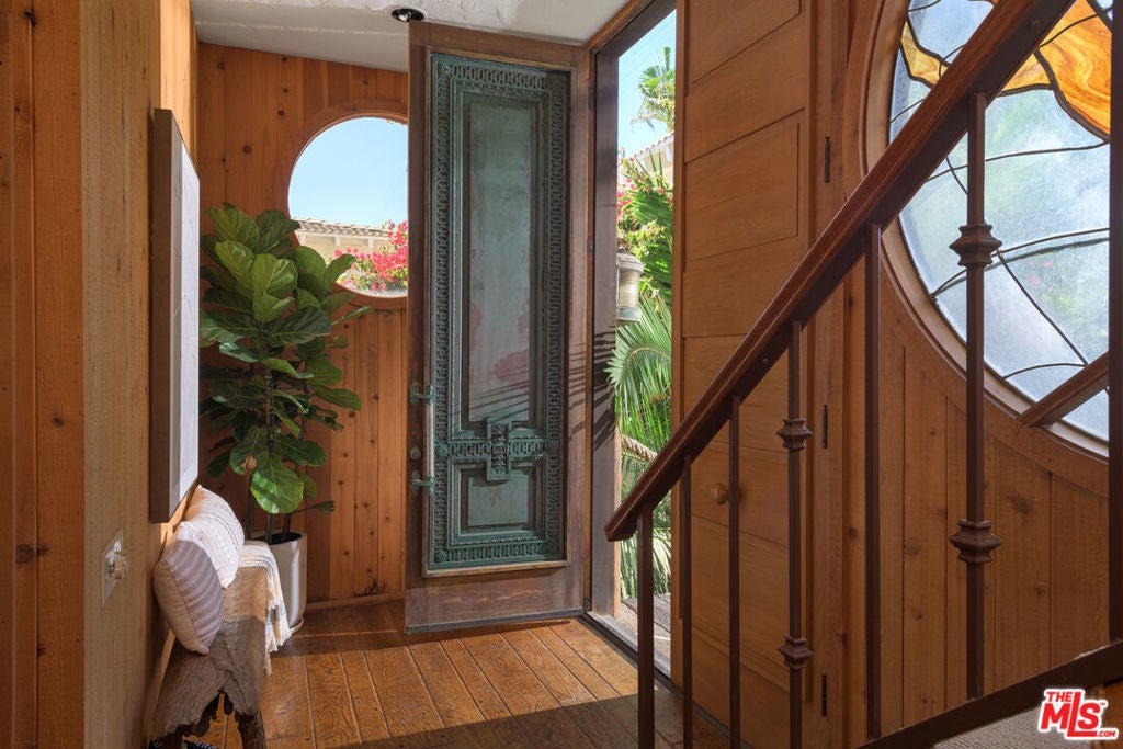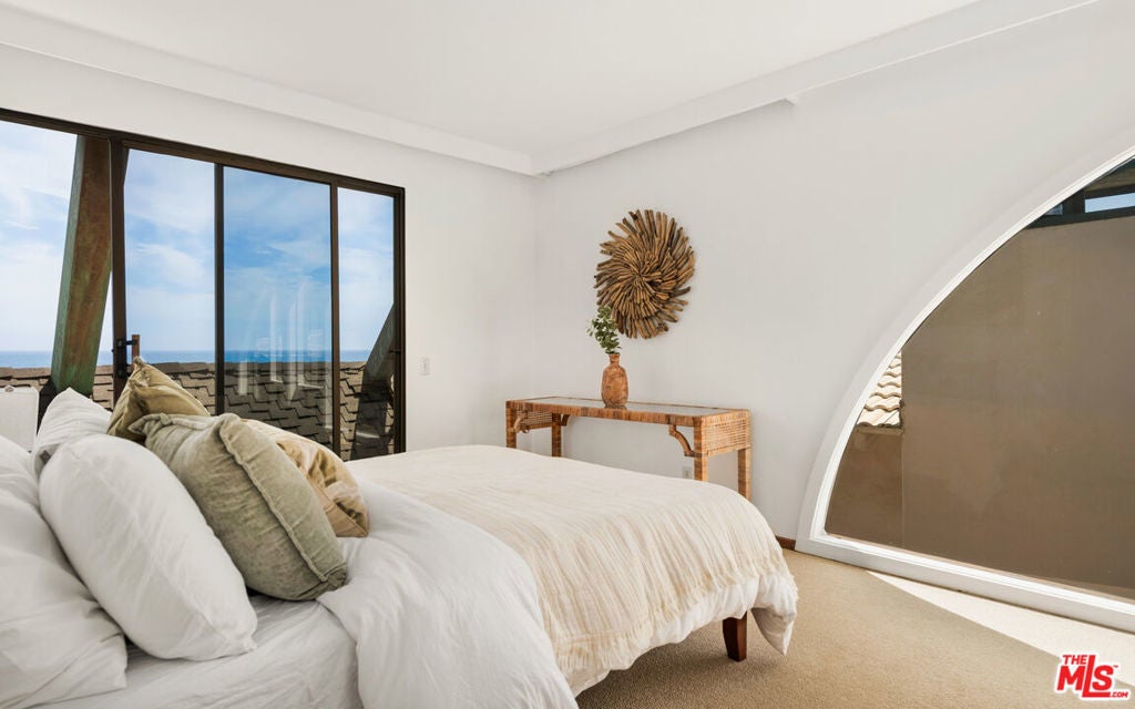 Poised on the quiet cul-de-sac end of Malibu Cove Colony's private road, this oceanfront estate is an extraordinary work of art by renowned architect Harry Gesner. With its soaring geometries, expressive woodwork, and walls of glass that frame the endless Pacific, the home reflects Gesner's signature blend of drama and intimacy. Approached by a wooden bridge detailed with nautical rope, the residence begins with monumental double doors salvaged from the historic San Francisco Mint, an entry that immediately signals rarity and provenance. Inside, a world of handcrafted artistry unfolds, illuminated by sunlight streaming through skylights and stained-glass windows reclaimed from a historic church. The interiors are a celebration of natural materials and timeless design. Wood-beam ceilings, wide-plank floors, and five fireplaces create warmth and character, while sweeping walls of glass open to panoramic views stretching down the coast to Point Dume. The main level embraces open concept living, where the family room flows seamlessly into a window-lined dining area and onward to an ocean-view kitchen featuring custom cabinetry, bar seating, a butcher block island, double Thermador ovens, and hand-tiled counters. On the level below, the living room serves as a dramatic gathering space with soaring ceilings, another grand brick fireplace, a stained-glass rose window, and sliding doors that open to a broad oceanfront deck designed for dining, lounging, and effortless indoor-outdoor living. Upstairs, three of the four bedrooms boast sweeping ocean views, capturing the artistry and serenity of this one-of-a-kind residence. The primary suite is a private sanctuary with wood beam ceilings, a fireplace with artisan tile detailing, and sliding doors to its own oceanfront balcony. A loft retreat, accessed by ladder, overlooks the coastline with extraordinary views. The primary bath continues the artistry with double vanities, a walk-in shower, an in-ground vintage tiled tub, and access to a second private terrace overlooking the lush hillside. Additional bedrooms feature sliding glass doors to ocean-view decks and stained-glass accents that enhance the home's singular character. Everywhere, bespoke craftsmanship abounds from custom built-ins to nautical-inspired railings underscoring the home's authenticity and artistry.With direct beach access and expansive decks hovering above the sand, this is more than a residence: it is a piece of California architectural history. A rare chance to own a Harry Gesner original in Malibu Cove Colony, where art, history, and coastal living converge in perfect harmony.