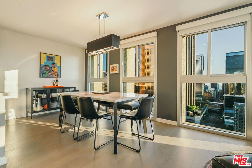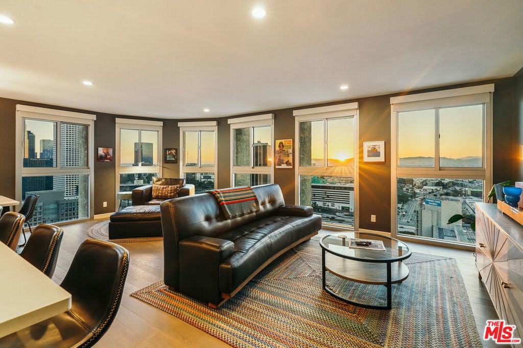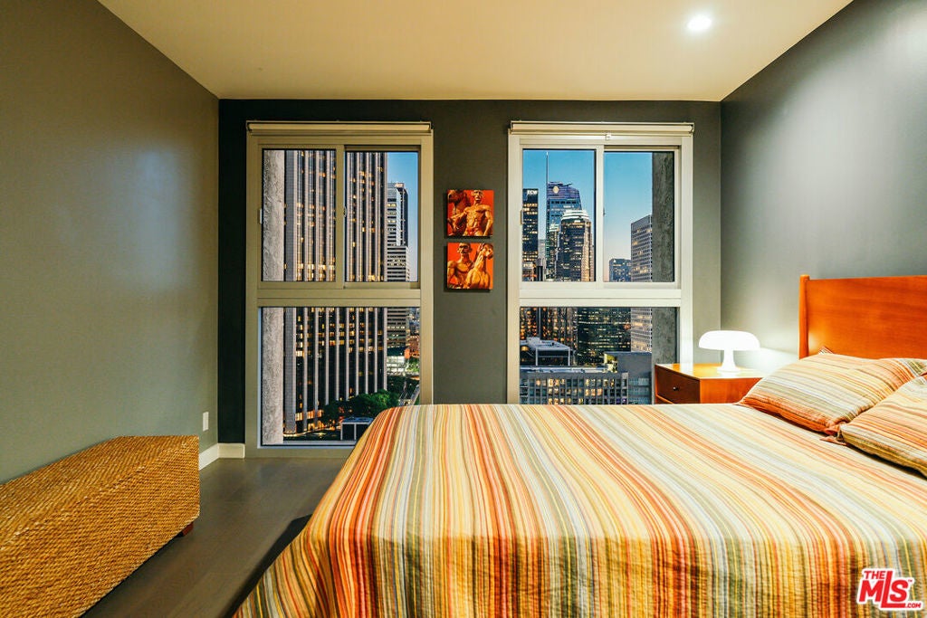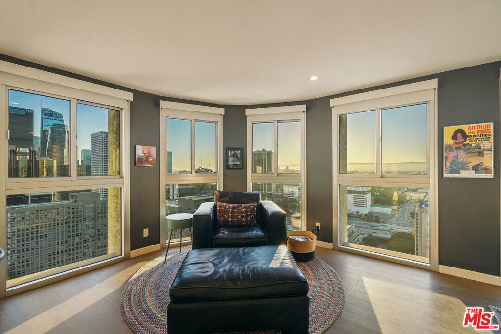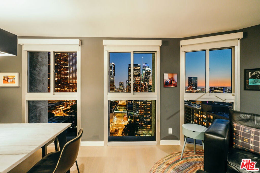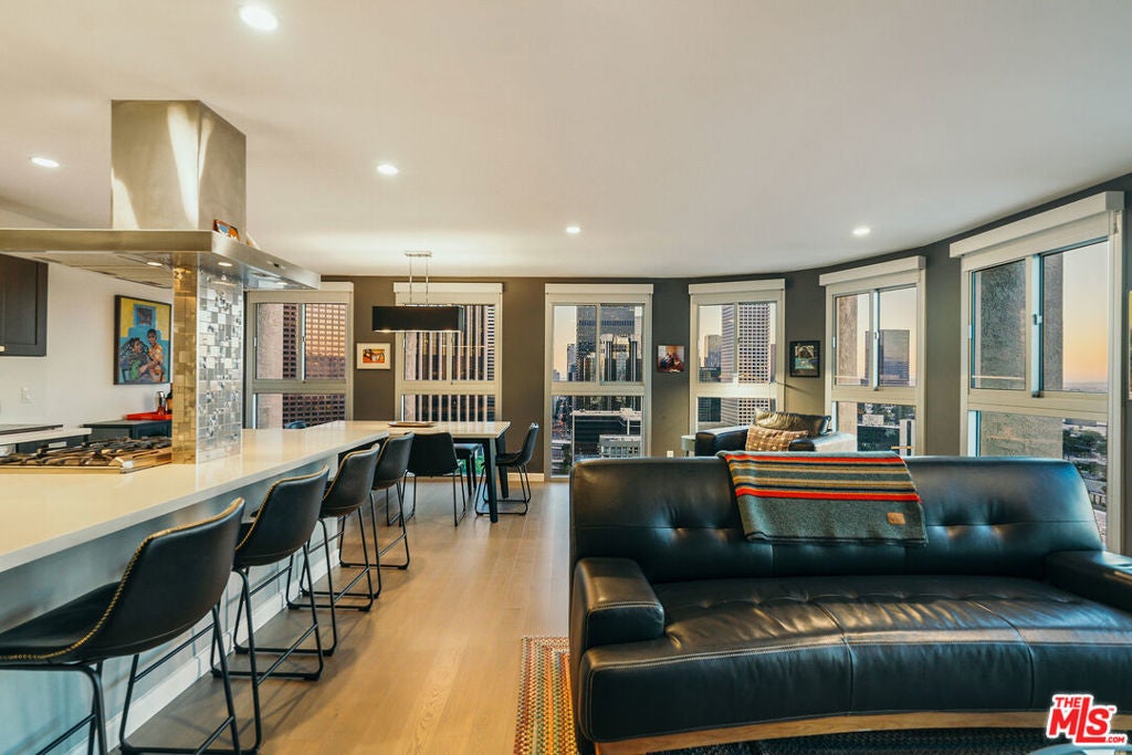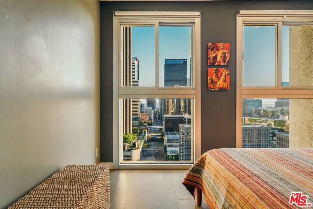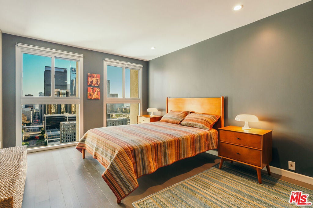 Experience this stylishly reimagined corner unit at the renowned Bunker Hill Tower, Downtown LA's premier full-service high-rise. From sweeping city lights to the Pacific Ocean, enjoy dramatic panoramic vistas that also showcase landmarks such as the Hollywood Sign and Griffith Observatory. Inside, newly installed wood flooring pairs beautifully with floor-to-ceiling double-paned windows, filling the home with natural light. Two generous bedrooms and two spa-like bathrooms reflect meticulous attention to detail. The open-concept kitchen blends sleek design with everyday functionality. Perfectly situated in the cultural hub of DTLA, you'll be just steps from the Disney Concert Hall, Music Center, Broad Museum, MOCA, and the Frank Gehry-designed Grand LA. The recently opened Grand Avenue Arts/Bunker Hill Metro Station places the entire city within easy reach. Residents of Bunker Hill Tower enjoy unmatched amenities: 24/7 concierge and security, gated guest parking, an Olympic-sized heated pool, two spas, tennis and pickleball courts, BBQ and picnic areas, playground, and two fully outfitted fitness centers. On-site conveniences include a market, beauty salon, and chiropractic office. HOA fees simplify city living by covering all essential utilities (electricity, gas, water, internet, trash, and secure parking) making this the ultimate lock-and-leave urban retreat.
