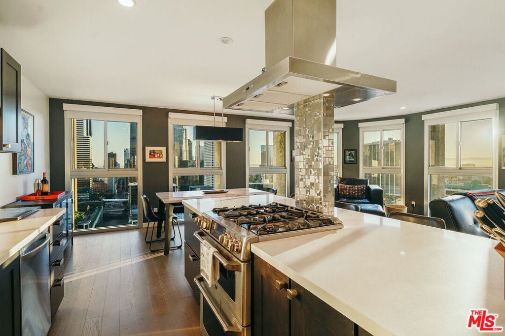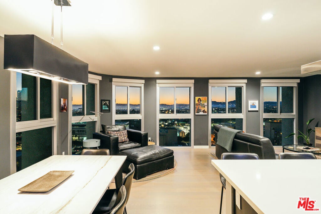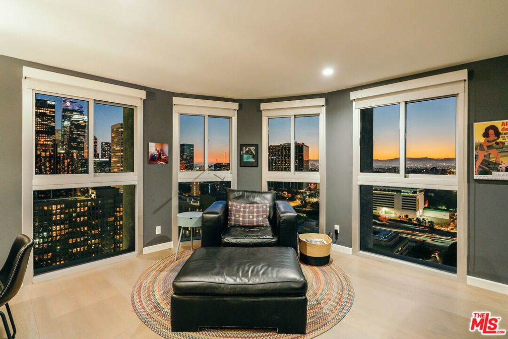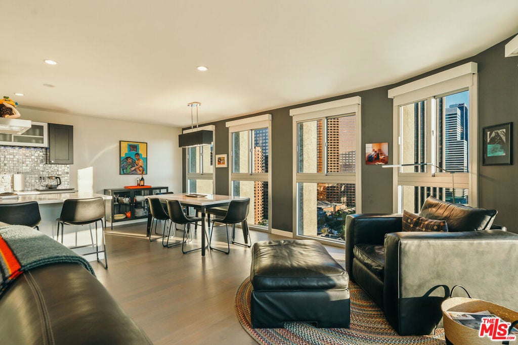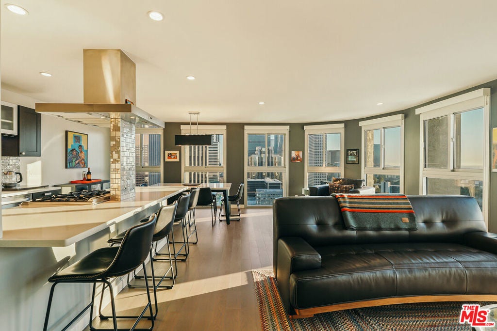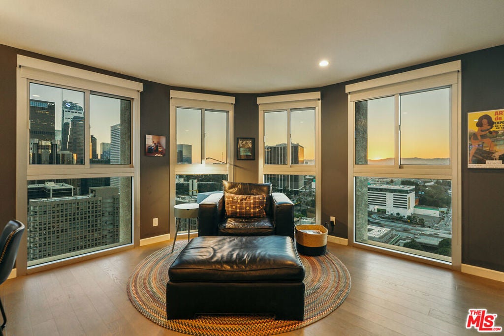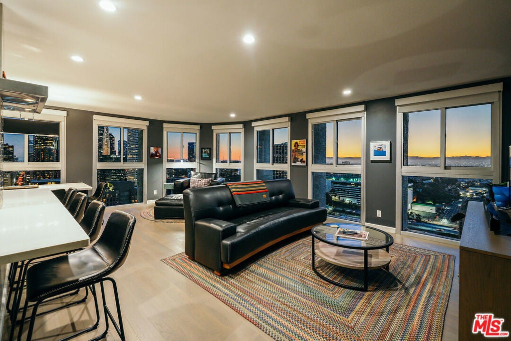Experience this stylishly reimagined corner unit at the renowned Bunker Hill Tower, Downtown LA's premier full-service high-rise. From sweeping city lights to the Pacific Ocean, enjoy dramatic panoramic vistas that also showcase landmarks such as the Hollywood Sign and Griffith Observatory. Inside, newly installed wood flooring pairs beautifully with floor-to-ceiling double-paned windows, filling the home with natural light. Two generous bedrooms and two spa-like bathrooms reflect meticulous attention to detail. The open-concept kitchen blends sleek design with everyday functionality. Perfectly situated in the cultural hub of DTLA, you'll be just steps from the Disney Concert Hall, Music Center, Broad Museum, MOCA, and the Frank Gehry-designed Grand LA. The recently opened Grand Avenue Arts/Bunker Hill Metro Station places the entire city within easy reach. Residents of Bunker Hill Tower enjoy unmatched amenities: 24/7 concierge and security, gated guest parking, an Olympic-sized heated pool, two spas, tennis and pickleball courts, BBQ and picnic areas, playground, and two fully outfitted fitness centers. On-site conveniences include a market, beauty salon, and chiropractic office. HOA fees simplify city living by covering all essential utilities (electricity, gas, water, internet, trash, and secure parking) making this the ultimate lock-and-leave urban retreat.