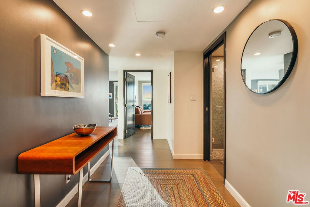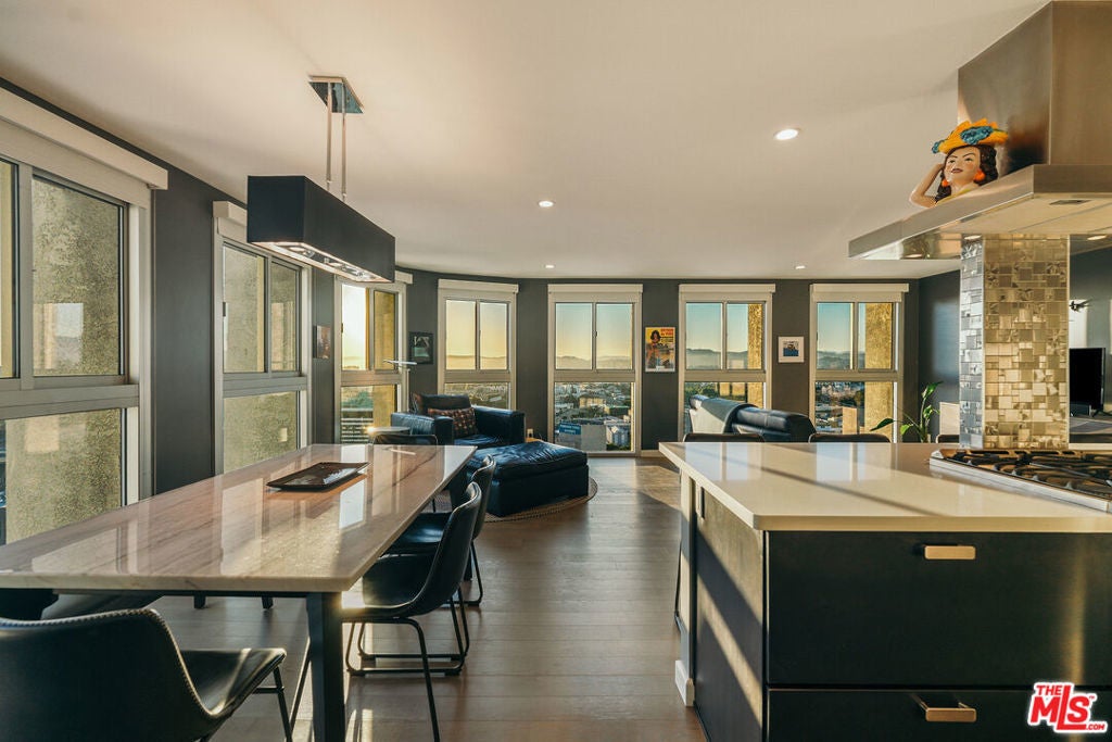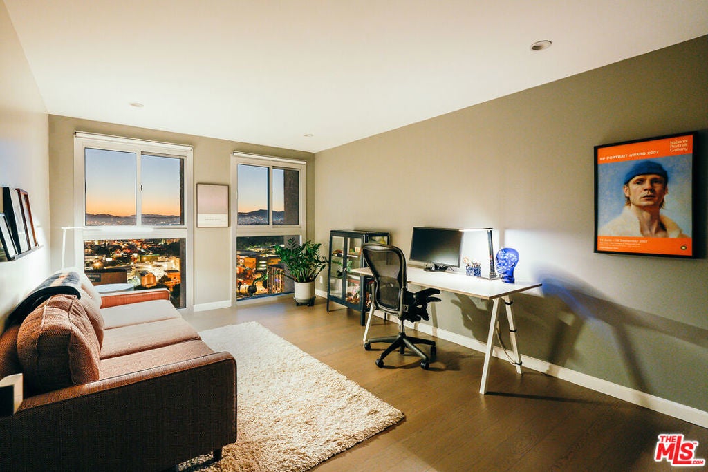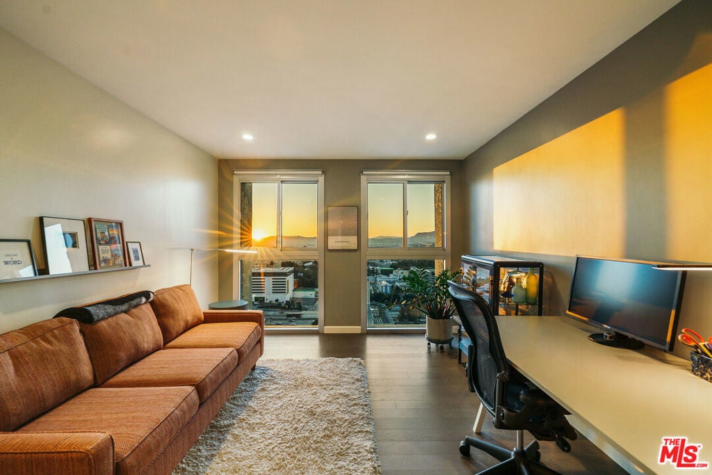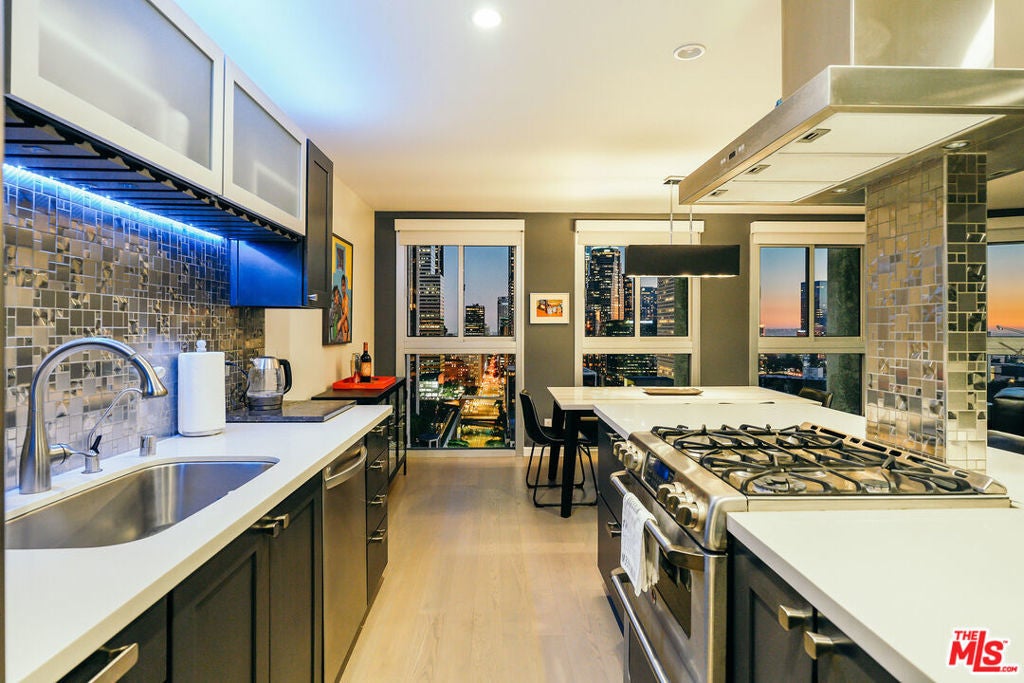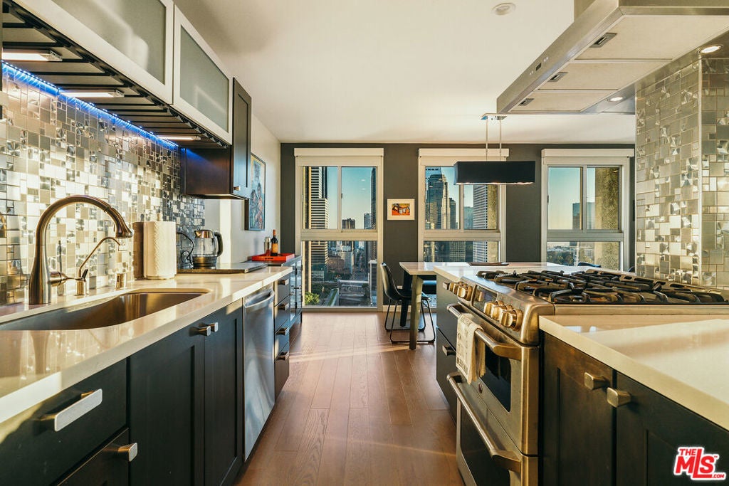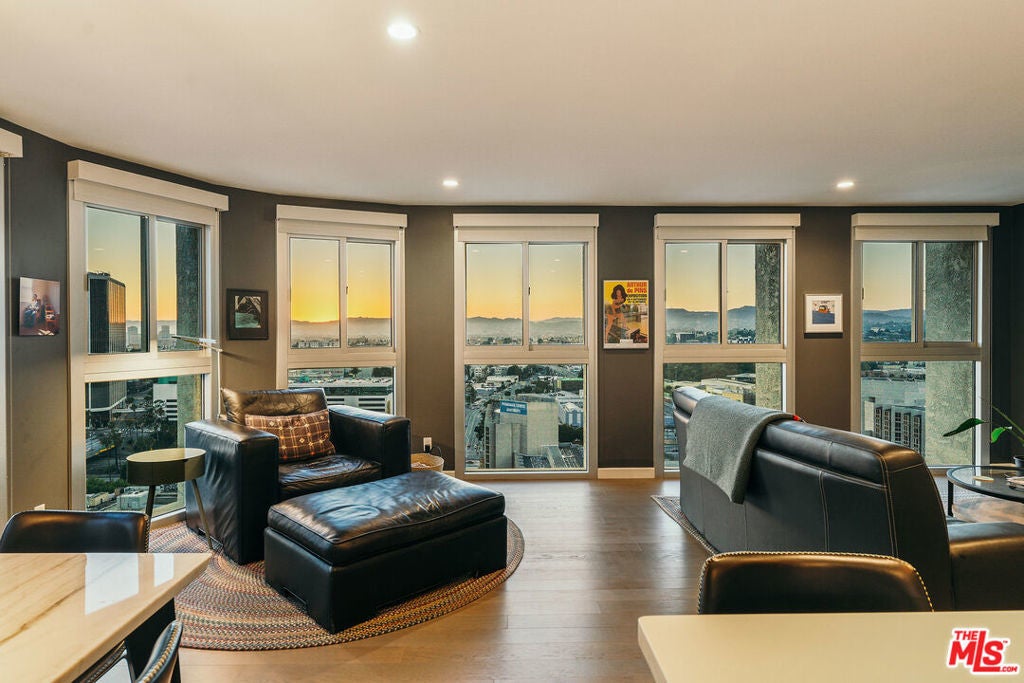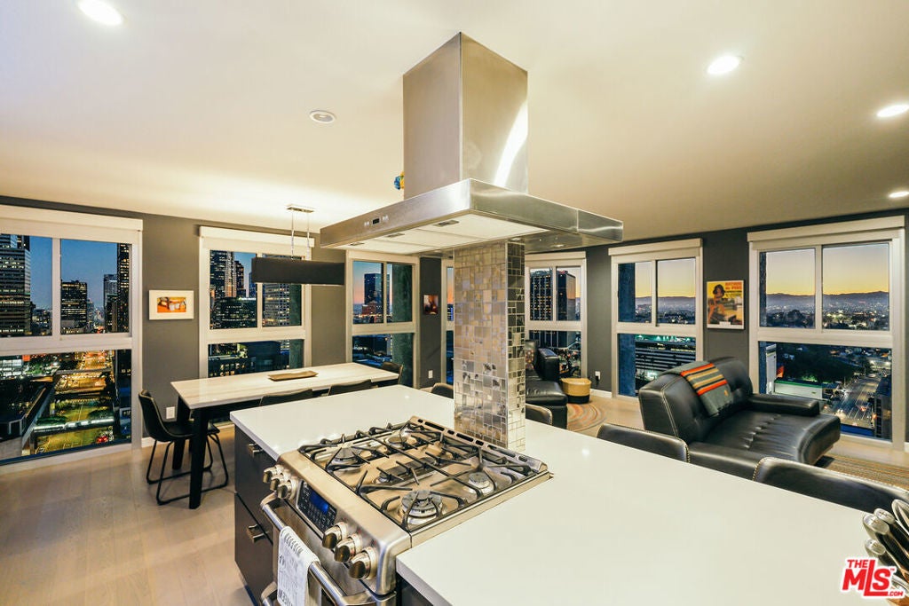 Experience this stylishly reimagined corner unit at the renowned Bunker Hill Tower, Downtown LA's premier full-service high-rise. From sweeping city lights to the Pacific Ocean, enjoy dramatic panoramic vistas that also showcase landmarks such as the Hollywood Sign and Griffith Observatory. Inside, newly installed wood flooring pairs beautifully with floor-to-ceiling double-paned windows, filling the home with natural light. Two generous bedrooms and two spa-like bathrooms reflect meticulous attention to detail. The open-concept kitchen blends sleek design with everyday functionality. Perfectly situated in the cultural hub of DTLA, you'll be just steps from the Disney Concert Hall, Music Center, Broad Museum, MOCA, and the Frank Gehry-designed Grand LA. The recently opened Grand Avenue Arts/Bunker Hill Metro Station places the entire city within easy reach. Residents of Bunker Hill Tower enjoy unmatched amenities: 24/7 concierge and security, gated guest parking, an Olympic-sized heated pool, two spas, tennis and pickleball courts, BBQ and picnic areas, playground, and two fully outfitted fitness centers. On-site conveniences include a market, beauty salon, and chiropractic office. HOA fees simplify city living by covering all essential utilities (electricity, gas, water, internet, trash, and secure parking) making this the ultimate lock-and-leave urban retreat.
