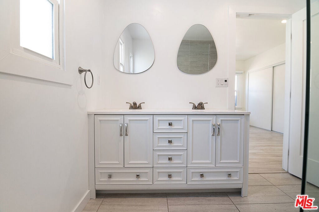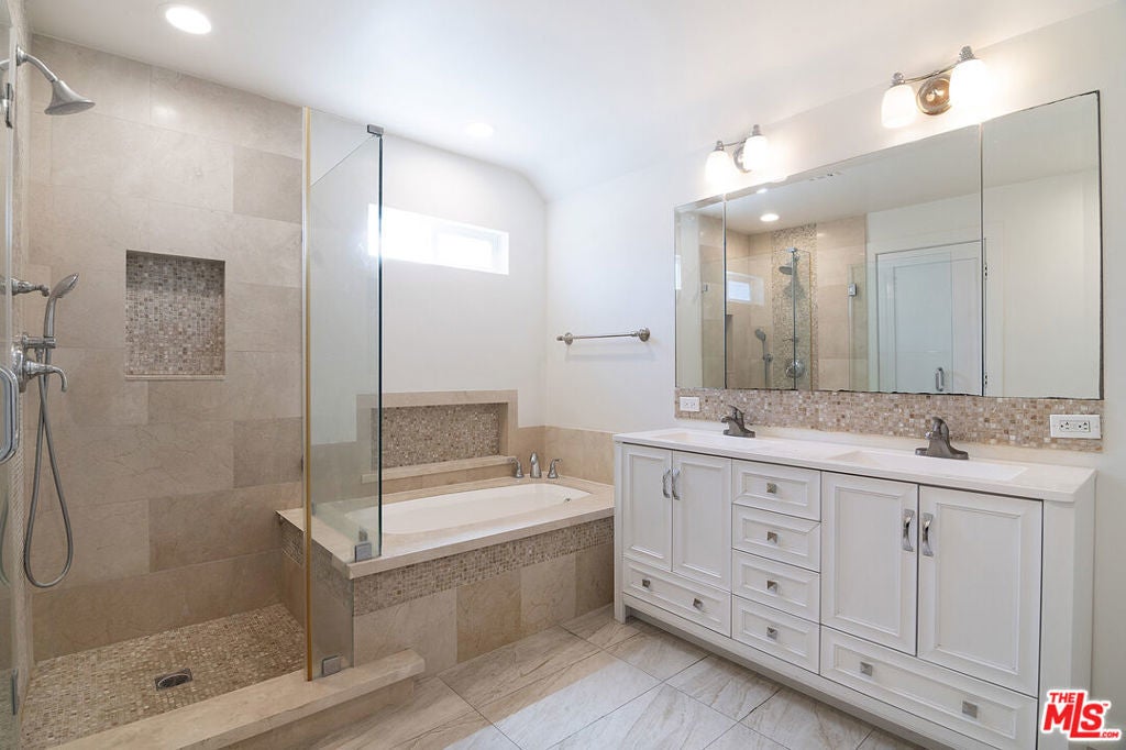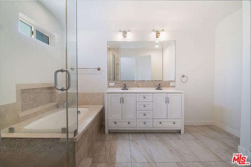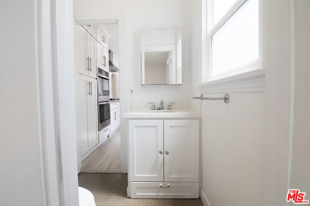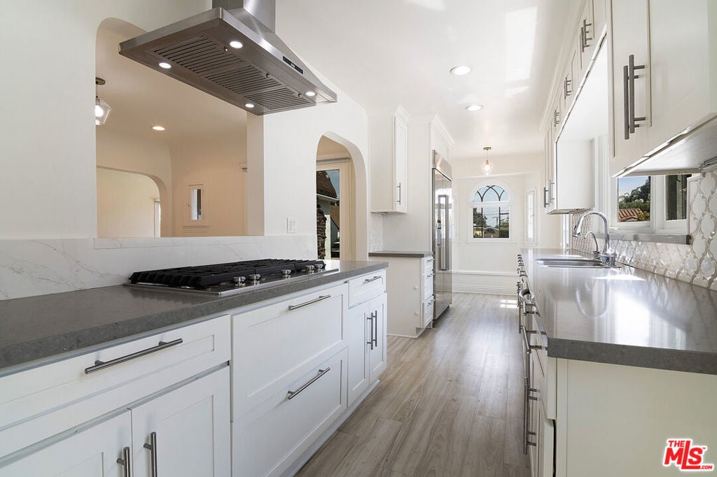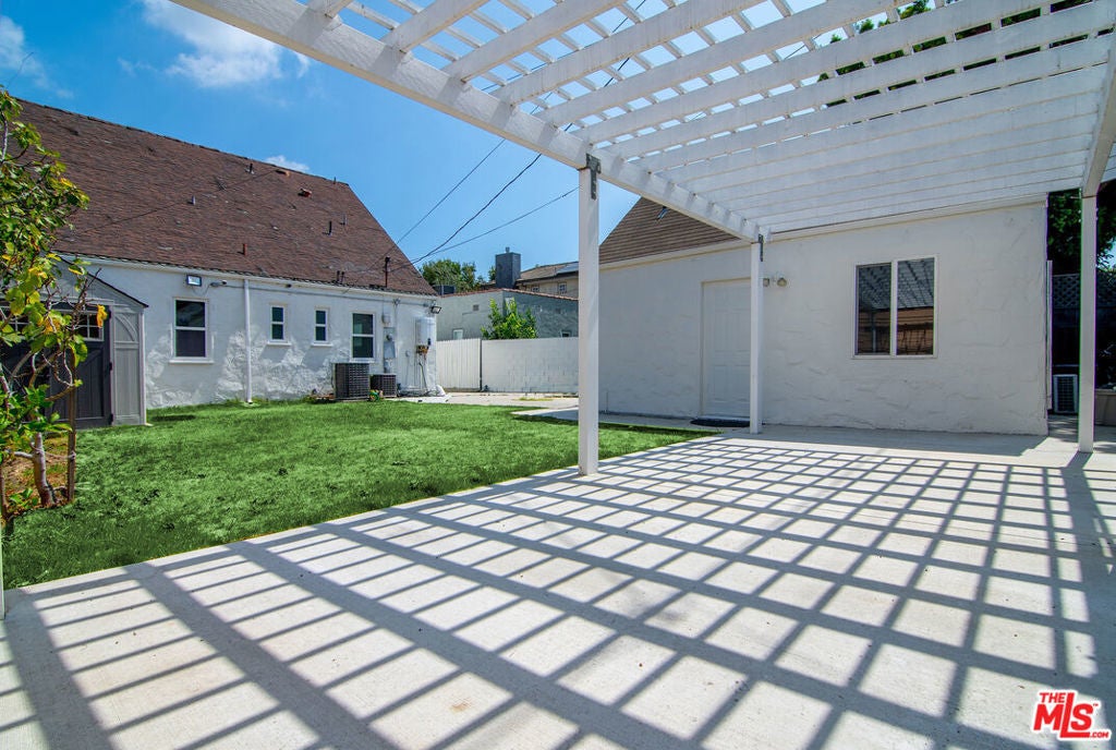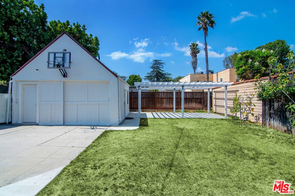 Charming, fully remodeled two-story California cottage in the heart of Pico-Robertson, offering 4 bedrooms, 3 bathrooms, and a versatile guest house. Step into a spacious great room, ideal for hosting, with seamless flow between living and dining areas. The adjacent family room, off the modern kitchen, doubles as a casual dining space. The updated kitchen boasts white arabesque tile, top-tier appliances including a built-in refrigerator, countertop range with hood, and double ovens and a built-in breakfast nook under a charming Victorian arched window with intricate mullions. The downstairs primary suite features dual vanities and a luxurious shower with river rock tile. A second downstairs bedroom connects to a guest bathroom with glass tile flooring. Upstairs, a landing with built-in bookshelves creates a cozy family retreat. One upstairs bedroom includes an attached playroom with charismatic angled ceilings, while another bedroom sits nearby. The upstairs full bathroom, with separate shower, tub, and dual vanity, offers ample space and style. Outside, a long gated driveway ensures privacy, complemented by a sprawling lawn perfect for outdoor activities. The converted garage studio, equipped with HVAC and a private bathroom, is ideal for guests or a home office. Recently renovated, this home is steps from Pico Boulevard, blending classic charm with modern upgrades in one of LA's most desirable neighborhoods.