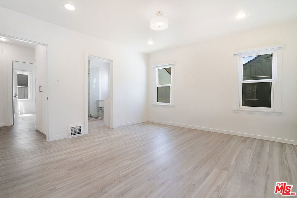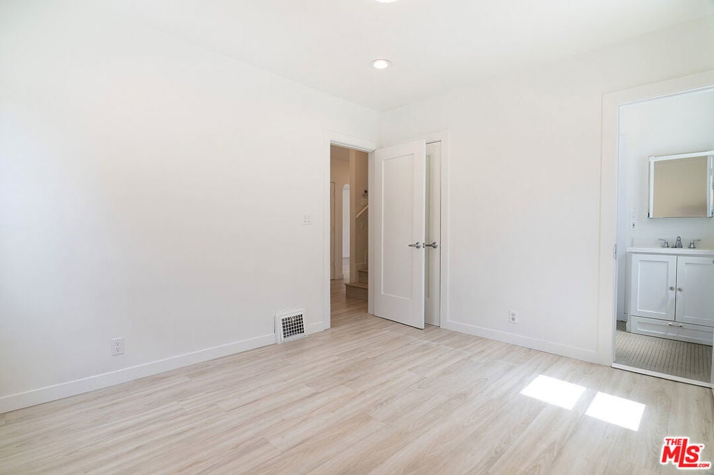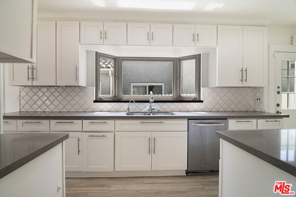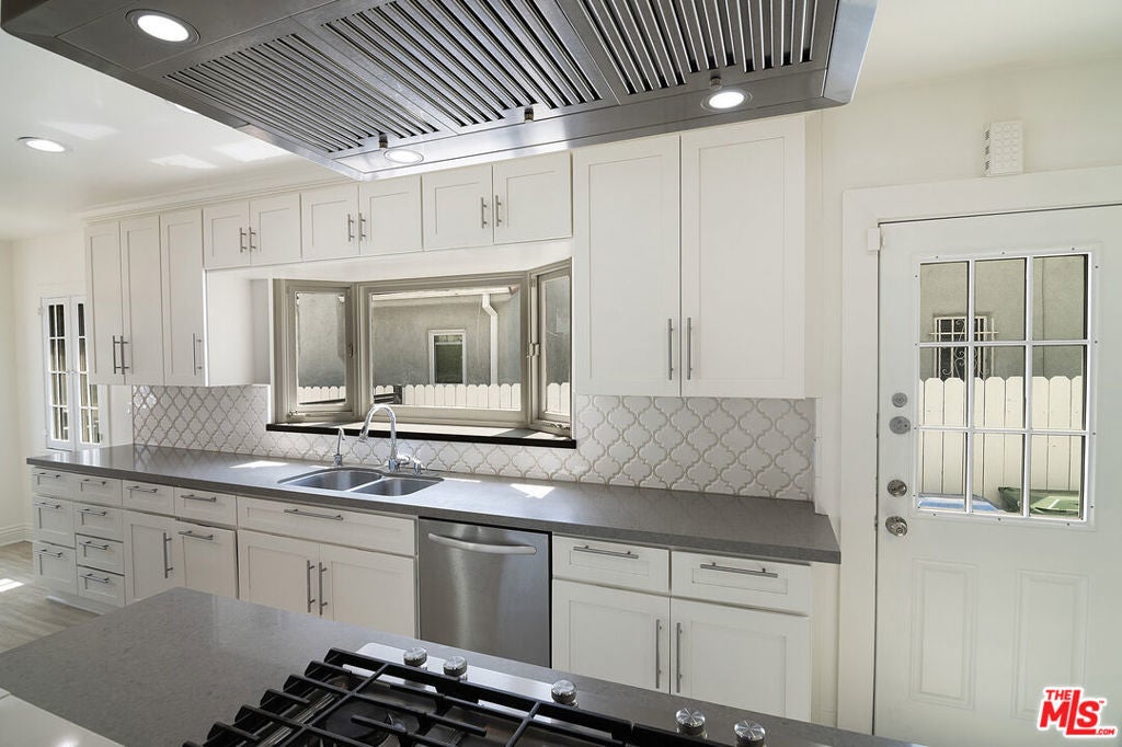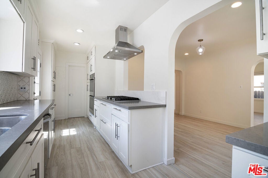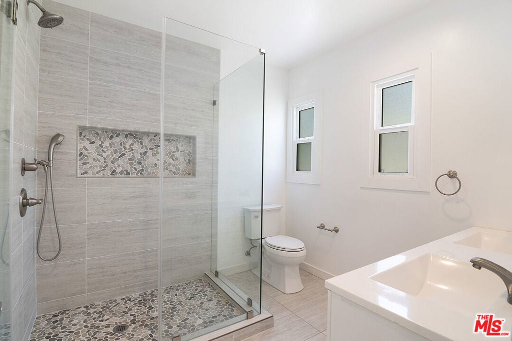 Charming, fully remodeled two-story California cottage in the heart of Pico-Robertson, offering 4 bedrooms, 3 bathrooms, and a versatile guest house. Step into a spacious great room, ideal for hosting, with seamless flow between living and dining areas. The adjacent family room, off the modern kitchen, doubles as a casual dining space. The updated kitchen boasts white arabesque tile, top-tier appliances including a built-in refrigerator, countertop range with hood, and double ovens and a built-in breakfast nook under a charming Victorian arched window with intricate mullions. The downstairs primary suite features dual vanities and a luxurious shower with river rock tile. A second downstairs bedroom connects to a guest bathroom with glass tile flooring. Upstairs, a landing with built-in bookshelves creates a cozy family retreat. One upstairs bedroom includes an attached playroom with charismatic angled ceilings, while another bedroom sits nearby. The upstairs full bathroom, with separate shower, tub, and dual vanity, offers ample space and style. Outside, a long gated driveway ensures privacy, complemented by a sprawling lawn perfect for outdoor activities. The converted garage studio, equipped with HVAC and a private bathroom, is ideal for guests or a home office. Recently renovated, this home is steps from Pico Boulevard, blending classic charm with modern upgrades in one of LA's most desirable neighborhoods.