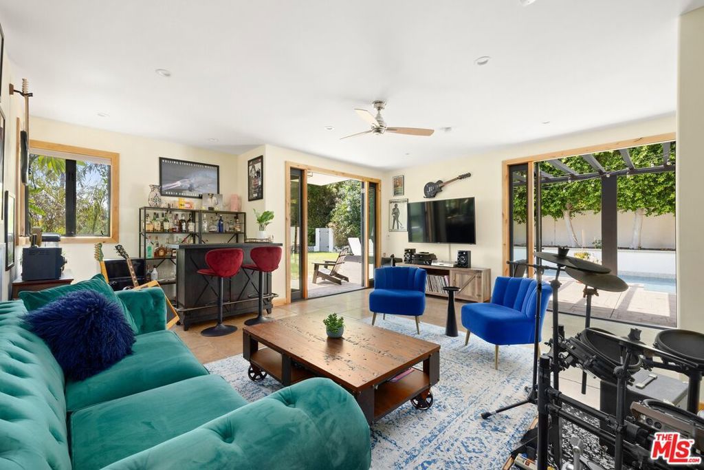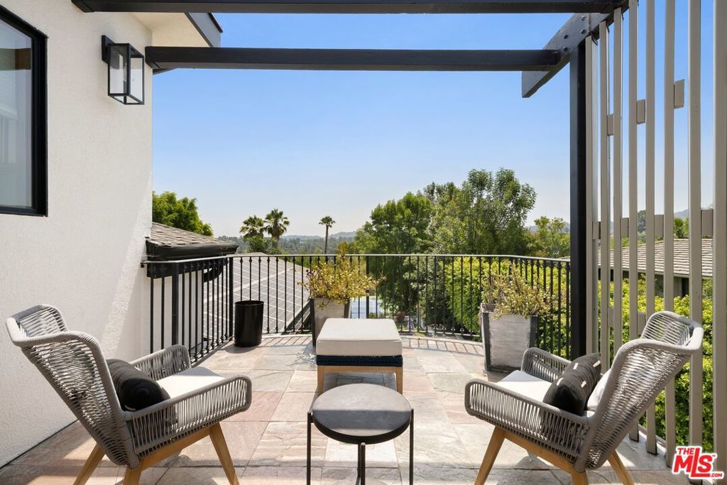Views, a tennis court, grassy sports field, and incredible value with tax savings! This gated and remodeled entertainer's compound is complete with tennis court, adjacent sports field, and fantastic views of the Valley and mountains beyond. Secured and set behind privacy hedges, the home offers an abundance of parking in its large motor court with porte-cochere and three-car garage. The living room has a sophisticated marble fireplace, exposed beams, vaulted ceilings, loft, and an open flow to the dining room. Nearby, the kitchen has been upgraded with beautiful finishes, fixtures, and top-of-the-line appliances, and the family room is complete with a bar area and multiple sets of French doors to the outside. The primary bedroom has an additional fireplace and opens to a large balcony with a stunning view, and its en-suite bathroom is updated and appointed with an oversized shower and soaking tub. Some secondary bedrooms also have their own private balconies, including the guest quarters. For exercise, yoga, and meditation, there is also a gym. Outside, enjoy multiple terraces, trellis-covered patios, outdoor barbecue, and viewing areas as well as a sparkling pool and spa, all surrounded by manicured landscaping. Enjoy this central location close to Gelson's, the Balboa Golf Course, the shops and restaurants along Ventura Boulevard, and the 101 and 405 Freeways. The home is also located within the attendance boundaries of top-rated Lanai Road Elementary School. Tennis court and sports field are shared with adjacent neighbors.