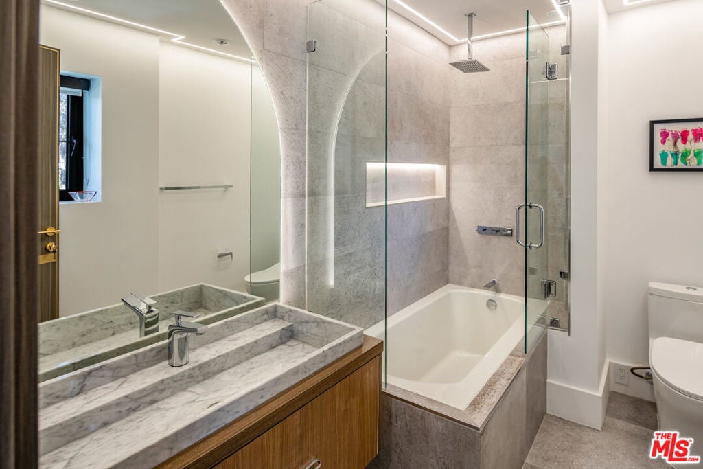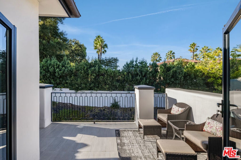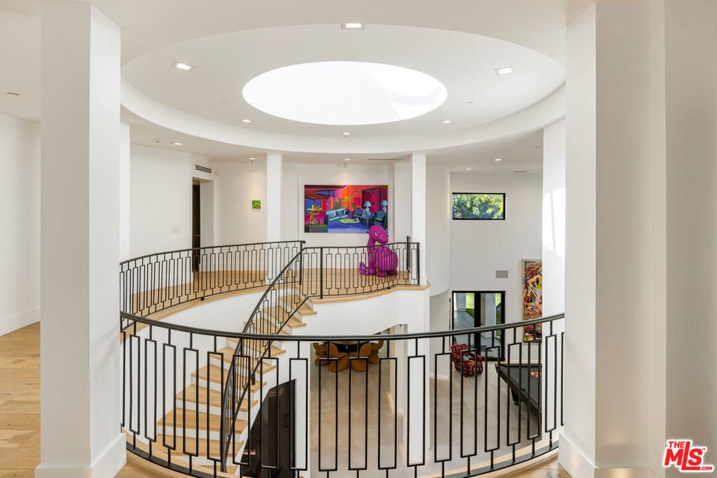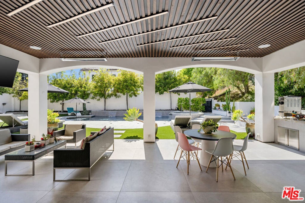 Nestled within the coveted guard-gated enclave of Monte Verde Estates and bordering the prestigious El Caballero Country Club, this Montecito-inspired Spanish estate blends timeless elegance with modern innovation. Behind an oversized metal front door, you're met with a dramatic rotunda foyer with a skylit stairwell and sweeping spiral staircase, illuminated by motion-activated LED stairs, offering a striking first impression. All interior doors feature magnetic locks with resting spots for a seamless and modern closure. Expansive metal windows and custom doors invite natural light and serene hillside views, reinforcing a seamless connection to nature. The main level is designed for both grand entertaining and everyday comfort. Two bedrooms flank the great room and formal living room, anchored by a 20-foot genuine Calcutta gold marble fireplace and a custom wet bar. A temperature-controlled wine cellar adds a refined touch for the wine enthusiast. The formal dining room, featuring a stunning Tom Dixon chandelier, overlooks a lush putting green and transitions effortlessly into the gourmet chef's kitchenappointed with Calcutta marble countertops, Porcelanosa tile, professional-grade stainless steel appliances, and sleek Leicht German cabinetry. The kitchen opens into a relaxed family room with a fireplace and extends outdoors through roll-away pocket doors to an expansive covered terrace, equipped with multiple heaters. Experience numerous lounge and dining areas that frame the outdoor kitchen, firepit, pool, spa, TV, and lighted sports court, creating a private resort-like sanctuary. Upstairs, a recreational room with an en-suite bath can easily be converted to a seventh bedroom and is complemented by three additional en suite bedrooms, each uniquely designed with Porcelanosa bathroom hardware and distinct finishes.The primary suite crowns the residence with a sitting area and fireplace, Tom Dixon chandelier, private viewing deck, and a spa-inspired bath featuring a jetted tub, steam shower, dual vanities, and two custom walk-in closets. Notably, the master bathroom also includes a heated floor and a dramatic backlit onyx entrance wall, blending spa-like comfort with contemporary style. This estate integrates state-of-the-art technology throughout, including a full Crestron system accessible via three wall-mounted iPads that allow you to walk the home and control lighting, climate, entertainment, security, and more. Additional features include LED baseboards, whole-home surround sound, and 23 security cameras for uncompromising safety. The garage features a security door and is outfitted with Omer Ferrari double lifts, perfect for the car enthusiast. Meticulously upgraded and designed to embody modern luxury, this estate stands as one of the finest offerings within a premier gated community. Just moments from fine dining, shopping, and top-rated schools, it captures the perfect balance of elegance, smart home innovation, and refined convenience.
