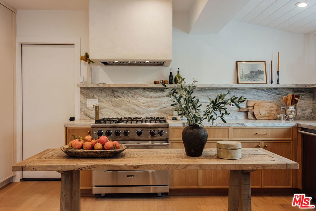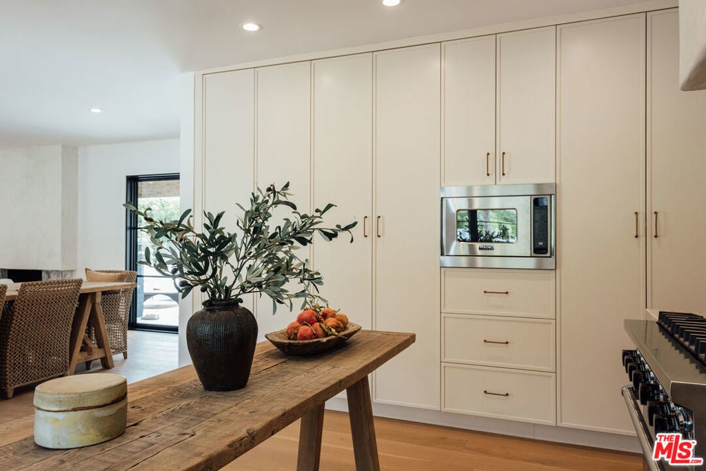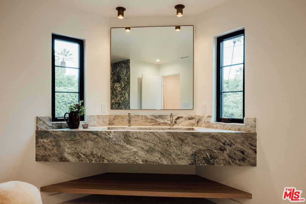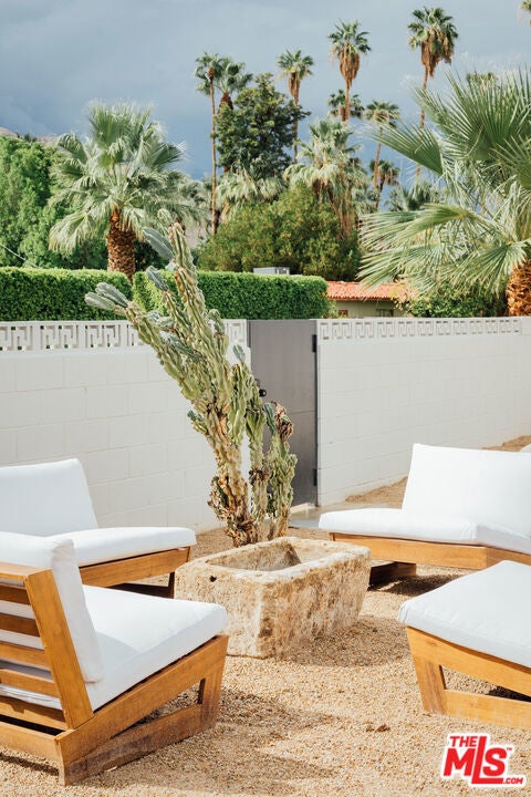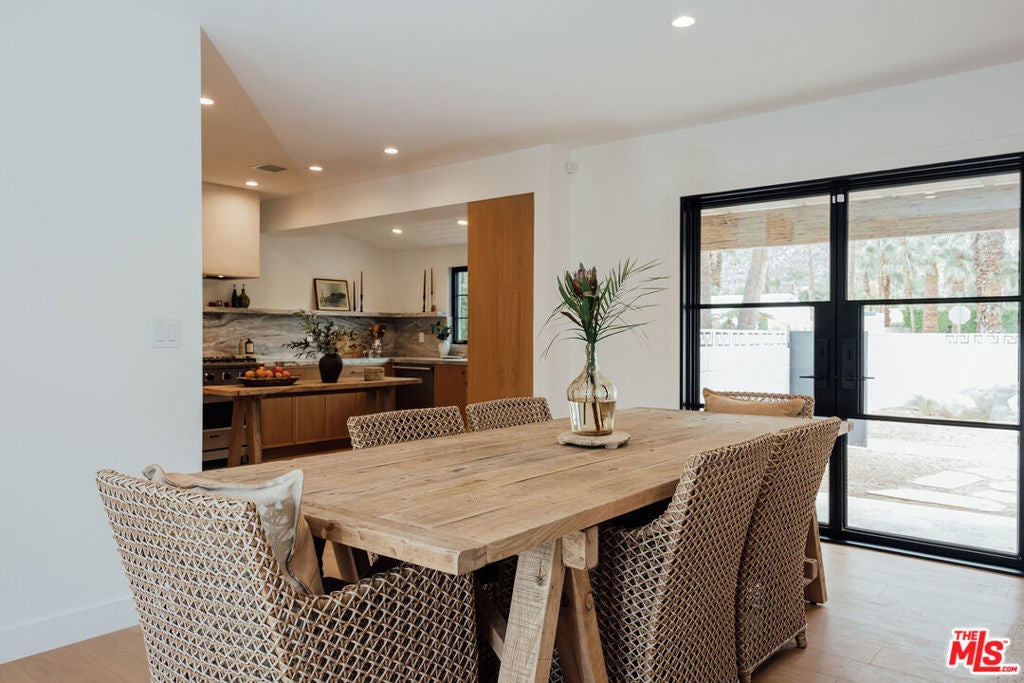 Experience the charmed neighborhood of Tahquitz River Estates luxury in this fully-renovated, picturesque California Ranch. One of the original ranch homes built in 1948 and located in the highly desired southern section of Tahquitz. This private, gated 4-bedroom, 3.5-bathroom estate has been transformed with every detail curated for the discerning buyer. Every inch of this property has been touched and improved with high-end finishes that define the home, featuring white oak flooring and custom cabinetry flowing throughout. Stunning black steel-framed glass doors and windows flood the space with light and fully open the living area front-to-back, creating an airy indoor/outdoor California lifestyle perfect for entertaining around the custom stone fireplace. The gourmet kitchen boasts luxury Viking appliances and exquisite stonework. Retreat to the spectacular master suite featuring a bath with white marble floors, dramatic Calacatta Viola shower walls, and a floating stone double vanity. Step outside to your tranquil oasis: a newly built pool and spa with waterfall, built-in BBQ, and a cozy fireplace hearth lounge all set against sweeping mountain views. Complete with a fully owned solar system and a finished 2-car garage with a 220V dedicated EV charger. All systems are upgraded or brand new such as HVAC, Pool/Spa, New electrical wiring throughout the home, bathrooms and kitchen were gutted and plumbing fully replaced. This is Southern California living at its best. Rental permits in Tahquitz River Estates are still available and have not reached 20% cap. Buyer to confirm.