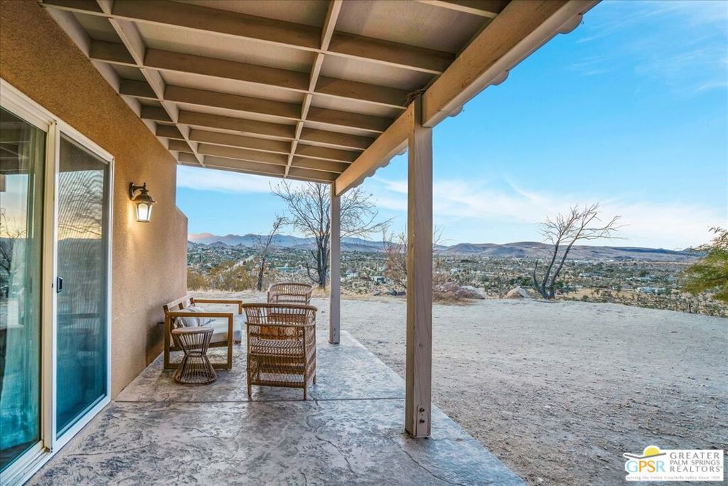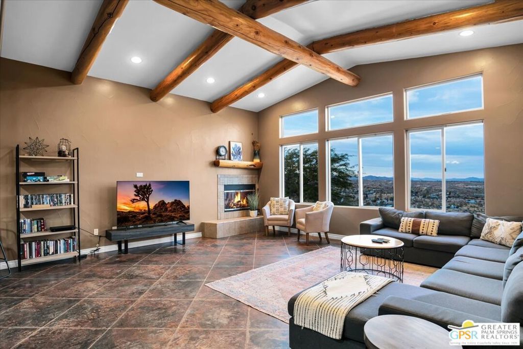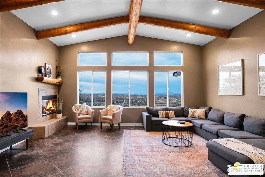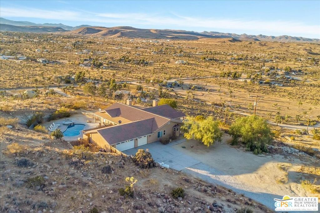 HILLTOP RETREAT on more than 5 acres in Yucca Valley. A private drive leads to this striking architectural property with panoramic views over The Mesa and Flamingo Heights. The private pool and spa with waterfall sparkle by day and come alive at night under the desert stars. Inside, beamed and vaulted ceilings crown the main living areas, where living, dining, and the gourmet kitchen flow seamlessly together. Polished concrete floors add style, while walls of glass showcase endless views. The kitchen is designed for entertaining with two side by side islands, counter seating, and a breakfast area. The primary ensuite features dual walk in closets, a fireplace, dual vanities, separate tub and shower, and direct access to a private patio. Two guest bedrooms each enjoy their own full bath, and a utility room sits along the central hall. Additional highlights include garage parking for three cars, abundant guest parking, and RV parking. The home has also enjoyed a successful vacation rental history, appealing to both investors and part time residents, and is just minutes from Pioneertown, Joshua Tree National Park, and the best of Yucca Valley, combining privacy, views, and desert lifestyle in one remarkable package.
