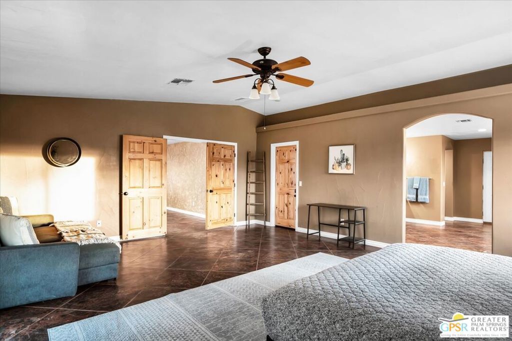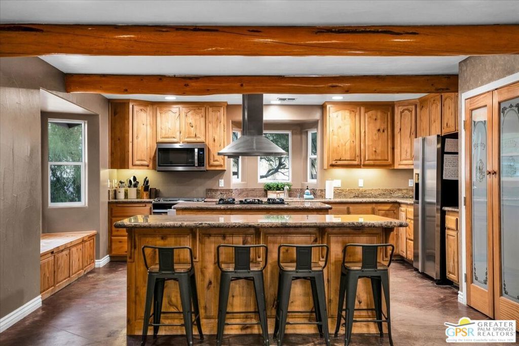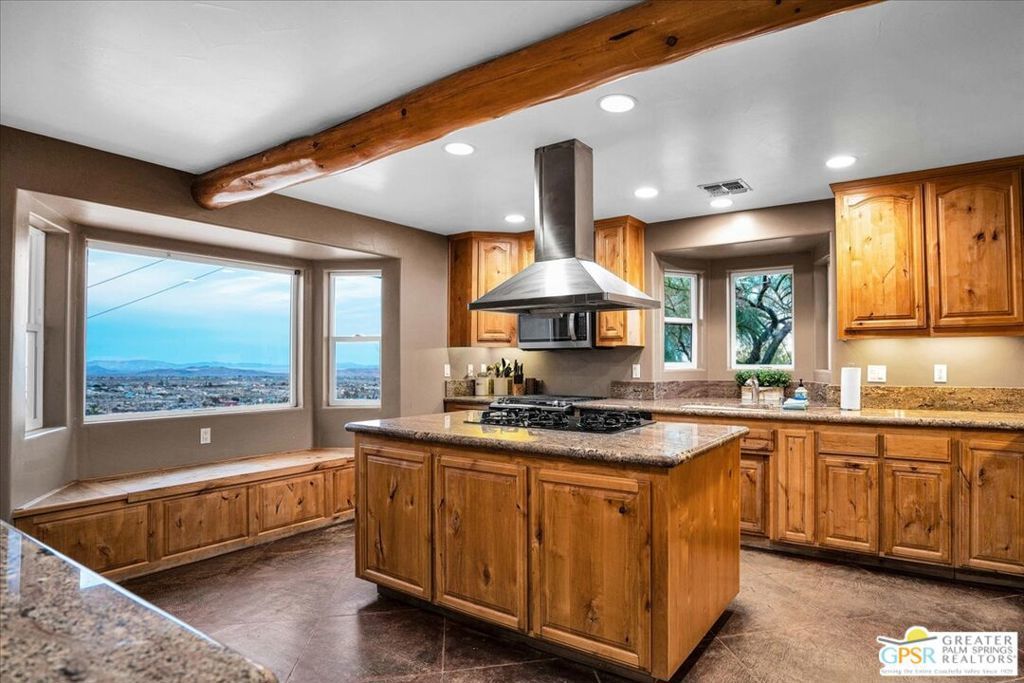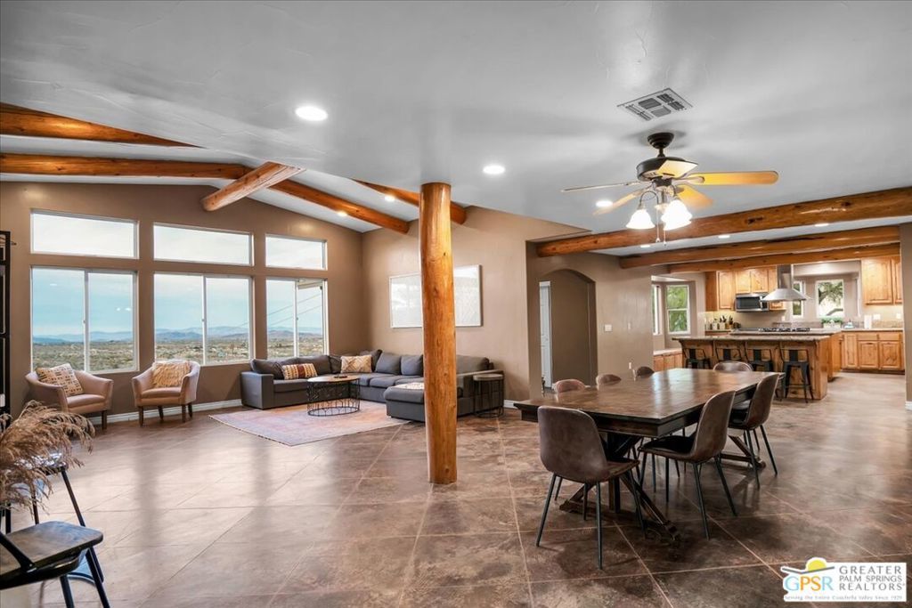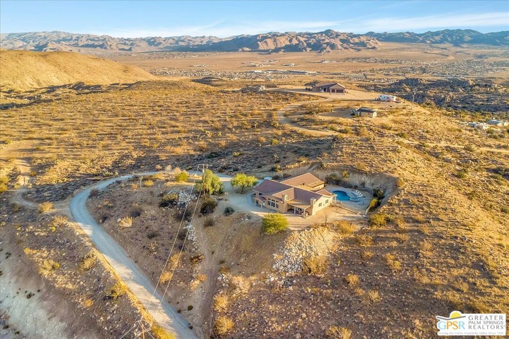 HILLTOP RETREAT on more than 5 acres in Yucca Valley. A private drive leads to this striking architectural property with panoramic views over The Mesa and Flamingo Heights. The private pool and spa with waterfall sparkle by day and come alive at night under the desert stars. Inside, beamed and vaulted ceilings crown the main living areas, where living, dining, and the gourmet kitchen flow seamlessly together. Polished concrete floors add style, while walls of glass showcase endless views. The kitchen is designed for entertaining with two side by side islands, counter seating, and a breakfast area. The primary ensuite features dual walk in closets, a fireplace, dual vanities, separate tub and shower, and direct access to a private patio. Two guest bedrooms each enjoy their own full bath, and a utility room sits along the central hall. Additional highlights include garage parking for three cars, abundant guest parking, and RV parking. The home has also enjoyed a successful vacation rental history, appealing to both investors and part time residents, and is just minutes from Pioneertown, Joshua Tree National Park, and the best of Yucca Valley, combining privacy, views, and desert lifestyle in one remarkable package.