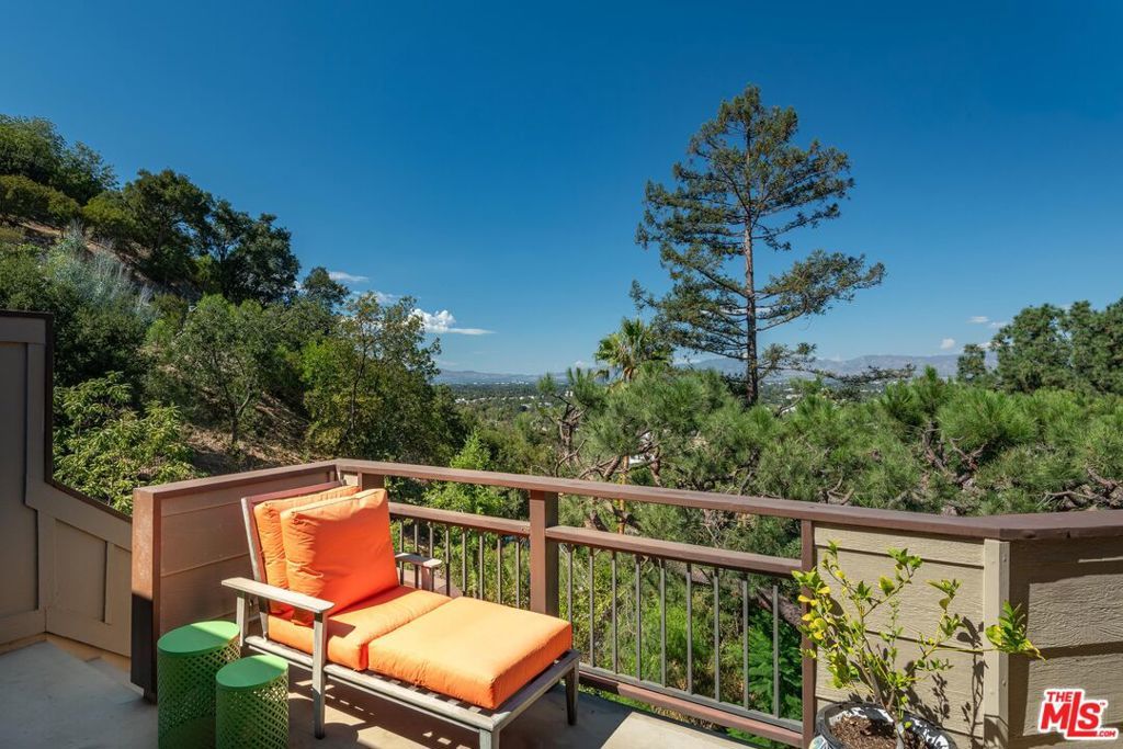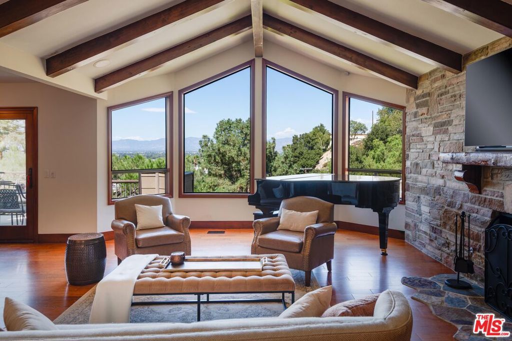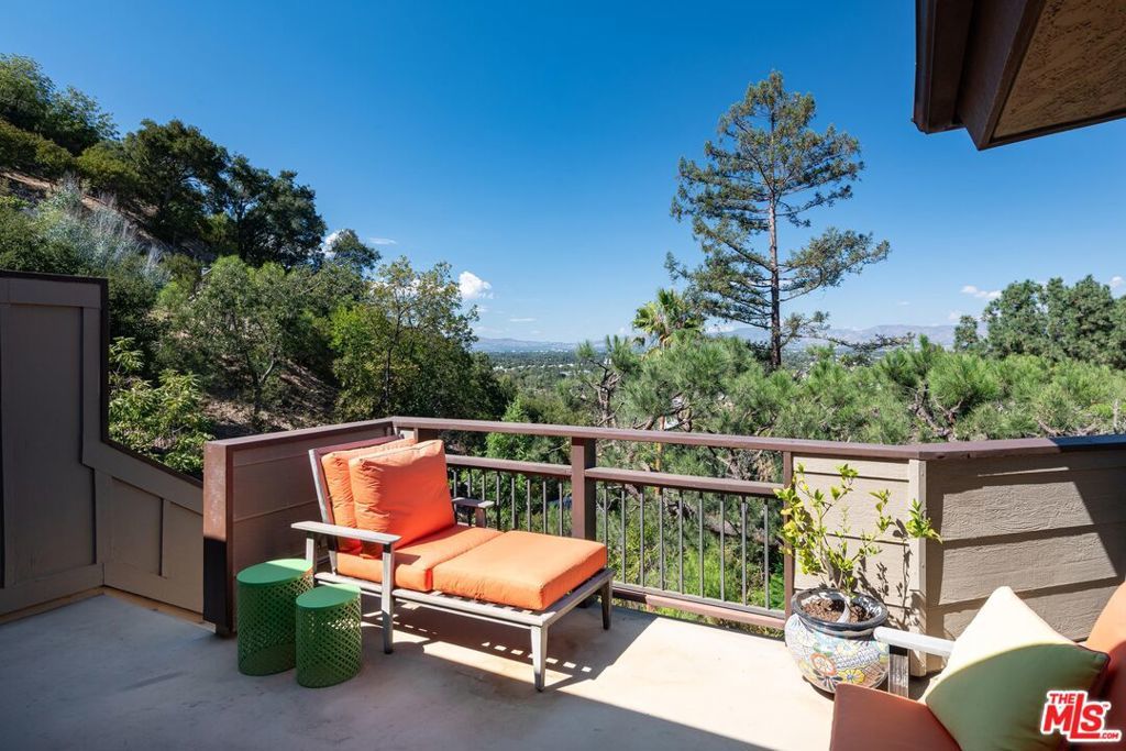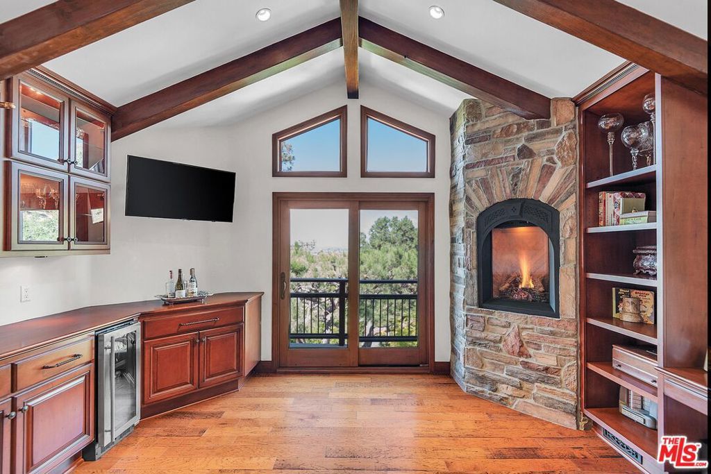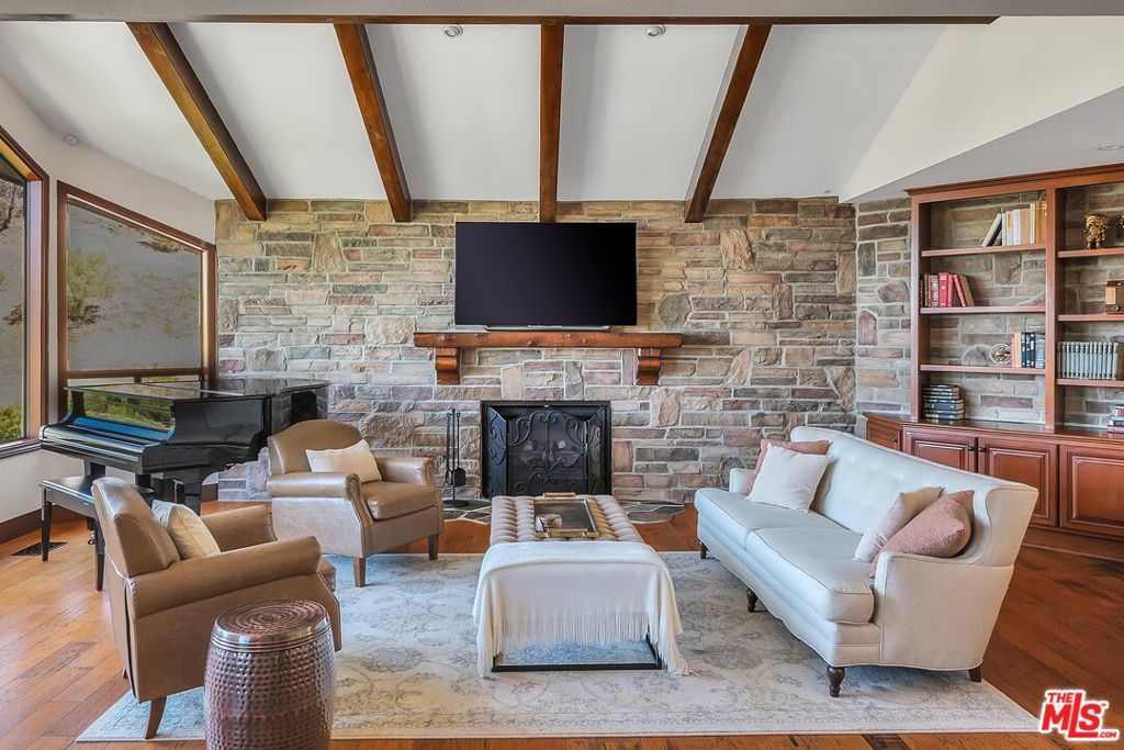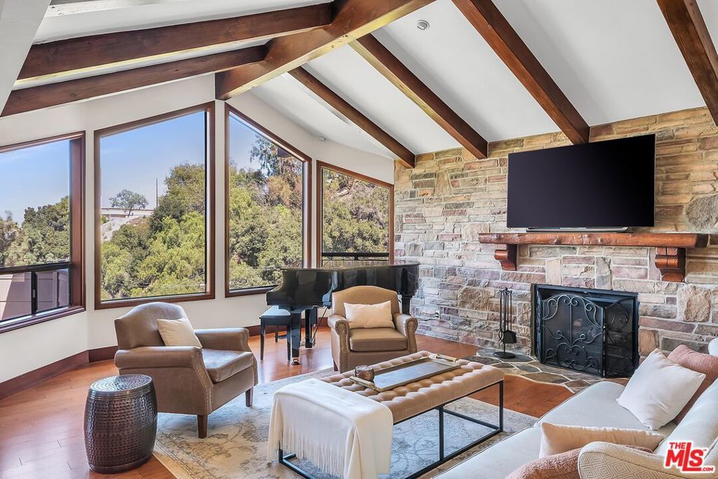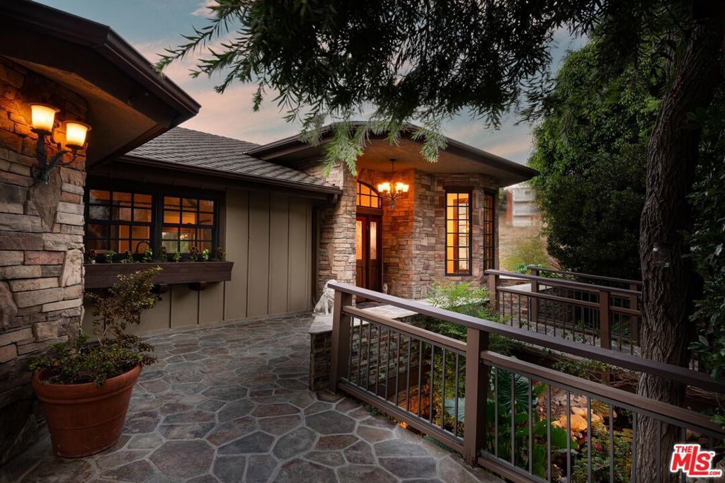 Set on a quiet cul-de-sac, this four bedroom, three and a half bath Studio City estate feels like a Lake Tahoe escape while offering LA convenience. Surrounded by sweeping unobstructed views and lush greenery, the home is designed for seamless indoor outdoor living with floor to ceiling glass doors opening to expansive wraparound decks. Inside, warmth and character abound with four fireplaces, a sprawling wine cellar, and a spa inspired primary suite featuring a rock pebble steam shower and soaking tub. The chef's kitchen is a true centerpiece, outfitted with Viking Professional appliances, handcrafted cabinetry, hammered copper sinks, dual pantries, two dishwashers, and a hand hewn granite island with a distinctive roped edge. The grounds feel like a private mountain retreat with a footbridge spanning a cascading waterfall and tranquil patios tucked into the landscape, while a lower level unfinished space offers flexibility for a future guest suite or ADU. Just minutes from major studios, Harvard Westlake, the Westside, and Ventura Boulevard's premier shopping and dining, this rare hideaway offers the perfect blend of Tahoe style serenity and Los Angeles lifestyle.