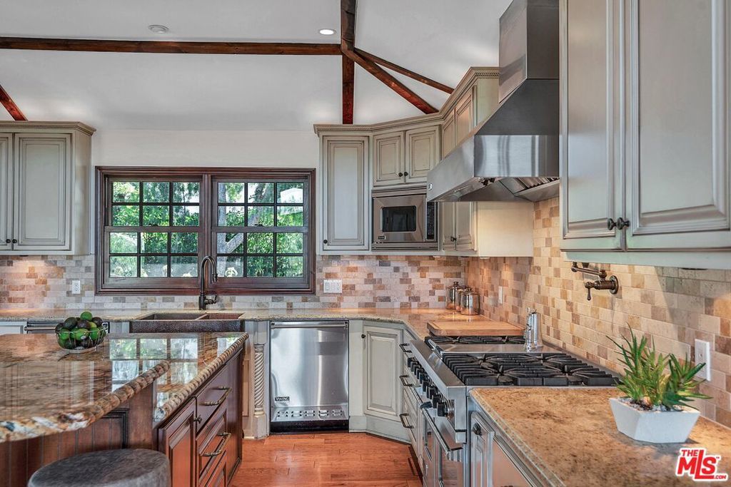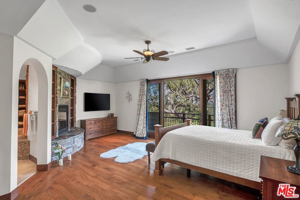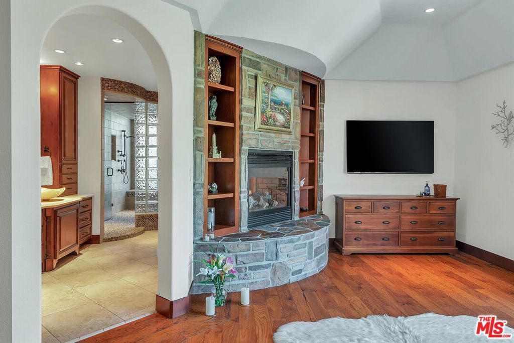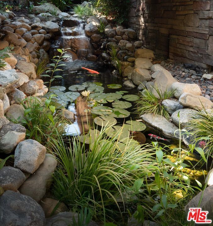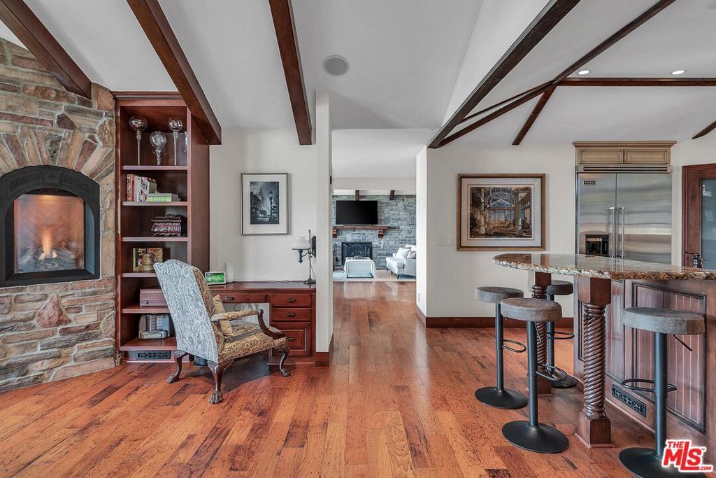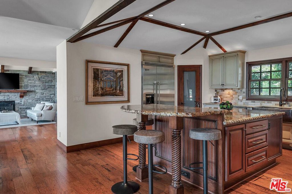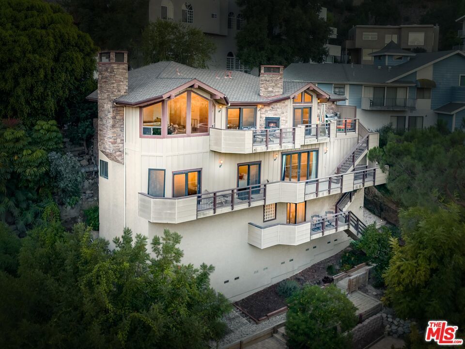Set on a quiet cul-de-sac, this four bedroom, three and a half bath Studio City estate feels like a Lake Tahoe escape while offering LA convenience. Surrounded by sweeping unobstructed views and lush greenery, the home is designed for seamless indoor outdoor living with floor to ceiling glass doors opening to expansive wraparound decks. Inside, warmth and character abound with four fireplaces, a sprawling wine cellar, and a spa inspired primary suite featuring a rock pebble steam shower and soaking tub. The chef's kitchen is a true centerpiece, outfitted with Viking Professional appliances, handcrafted cabinetry, hammered copper sinks, dual pantries, two dishwashers, and a hand hewn granite island with a distinctive roped edge. The grounds feel like a private mountain retreat with a footbridge spanning a cascading waterfall and tranquil patios tucked into the landscape, while a lower level unfinished space offers flexibility for a future guest suite or ADU. Just minutes from major studios, Harvard Westlake, the Westside, and Ventura Boulevard's premier shopping and dining, this rare hideaway offers the perfect blend of Tahoe style serenity and Los Angeles lifestyle.