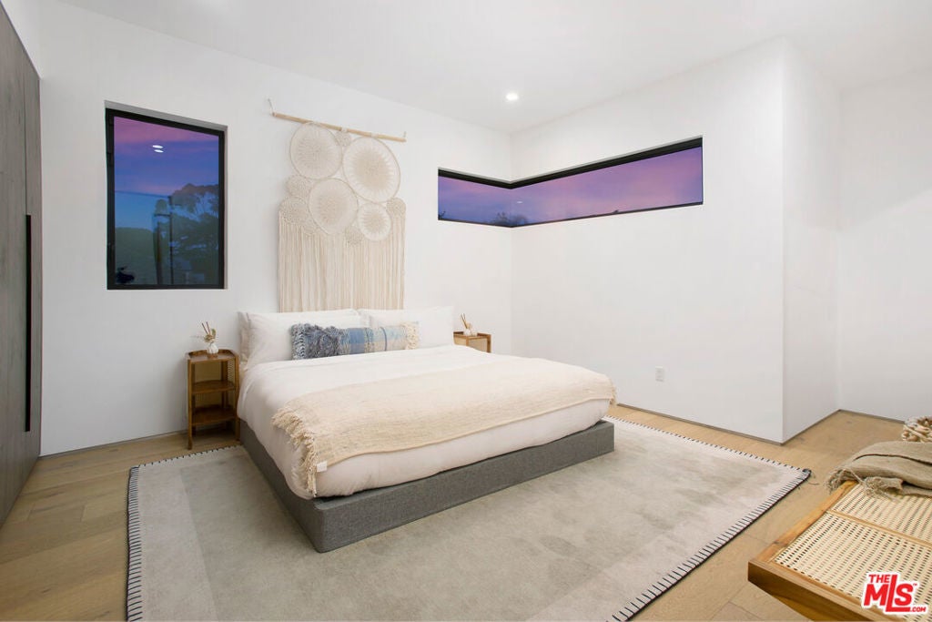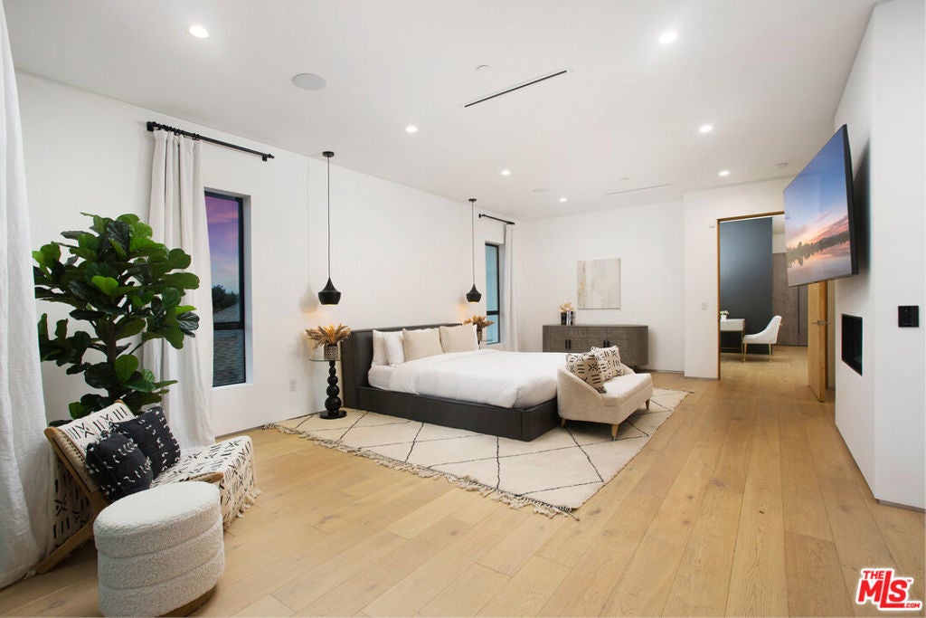 Located on a quiet street in Studio City, this stunning contemporary residence is privately nestled behind gates and mature hedges. Spanning almost 4,000 square feet, the 4-bed, 5-bath home showcases clean lines, curated materials, and high-end finishes throughout. Designed with both comfort and entertaining in mind, the main level features expansive living, dining, and kitchen areas that flow seamlessly outdoors through oversized aluminum sliding glass doors. Soaring ceilings, sleek fixtures, and designer details create a refined yet welcoming ambiance. The gourmet kitchen is equipped with premium appliances, custom cabinetry, a large island, and an adjoining breakfast nook. Upstairs, the primary suite offers a spacious walk-in closet, balcony lounge, and spa-like bath with a steam shower, Italian-designed vanities, and a dedicated make-up vanity. A water softener system enhances daily living by filtering out hard metals to nourish skin and hair. Each additional bedroom includes its own en-suite bath and generous proportions, ensuring both privacy and luxury for family and guests. The private backyard oasis is ideal for entertaining, complete with a sparkling pool and spa, built-in BBQ, low-maintenance turf, and multiple lounge areas. The home is fully outfitted as a smart residence, with integrated controls for music, lighting, spa, climate, and security systems. Located within the top-rated Colfax School District and just moments from shops, restaurants, and the newly opened Sportsmen's Lodge, this residence perfectly blends modern design, functionality, and convenience.