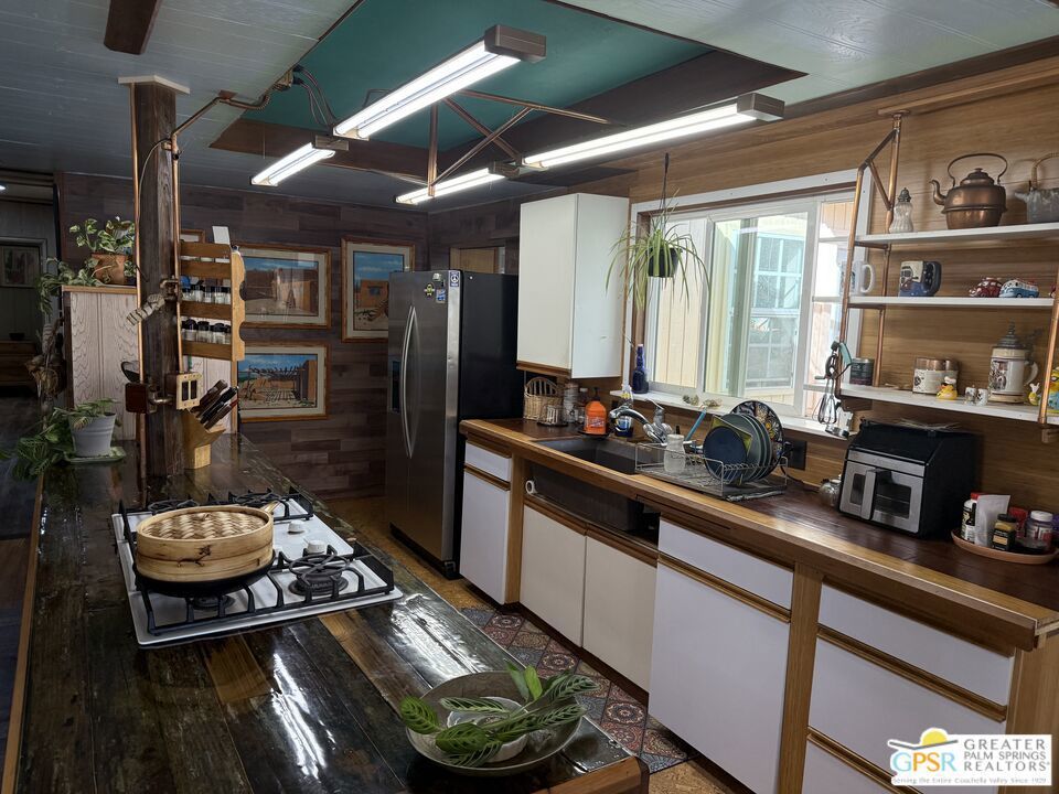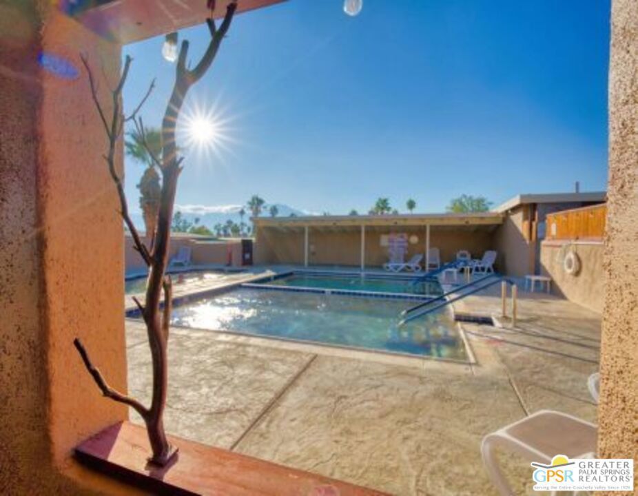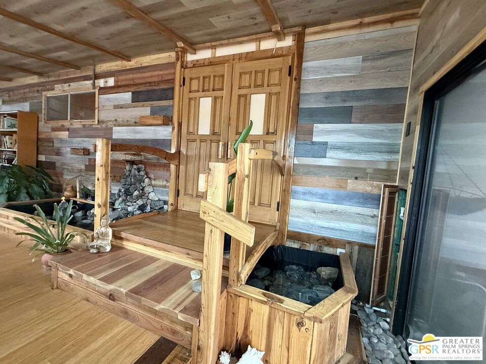 Don't miss your opportunity to own this unique, one of a kind home in Healing Waters Mobile Home & RV Park, a 55+ active community located in Desert Hot Springs. As you enter the covered indoor serenity garden, you will be awestruck by the waterfall and rock pond (ready for the fish of your choice if desired), and a Japanese inspired wooden bridge leads you to the dramatic entry doors. Artistic remodeling is highlighted throughout the home with the primary focus on repurposing, recycling and reusing. The kitchen counter tops, island, and walls boast reclaimed redwood and cedar from several parts of the state. The sink is recycled from England. Cork floors are cool in the summer and warm in the winter. There is an amazing oversized pantry, and access to the equally oversized attached workshop which also can be used for storage or a golf cart enclosure. The inclosed patio and and pantry add an approximate 500 sq. ft of usable space. Numerous creative touches abound in this 3 bed/2 bath double wide unit. The tranquil ambiance continues outside as you relax on the back deck and take in breathtaking mountain, desert and amazing sunset views. Park amenities include a large mineral spring pool, 3 mineral springs spas all open 24/7, plus wet and dry saunas, large clubhouse with banquet room, game room, library, and billards. There are also pickleball and shuffleboard courts. Hurry, you have to check this treasure out!