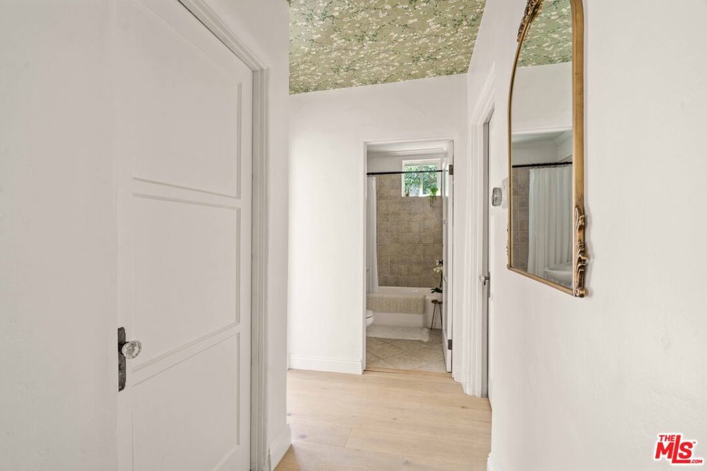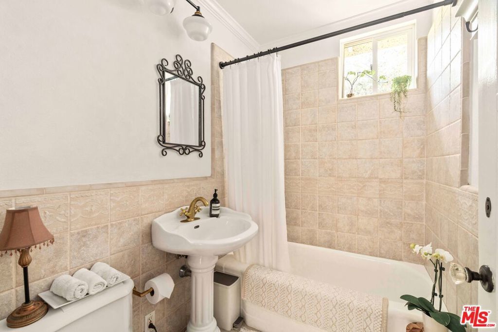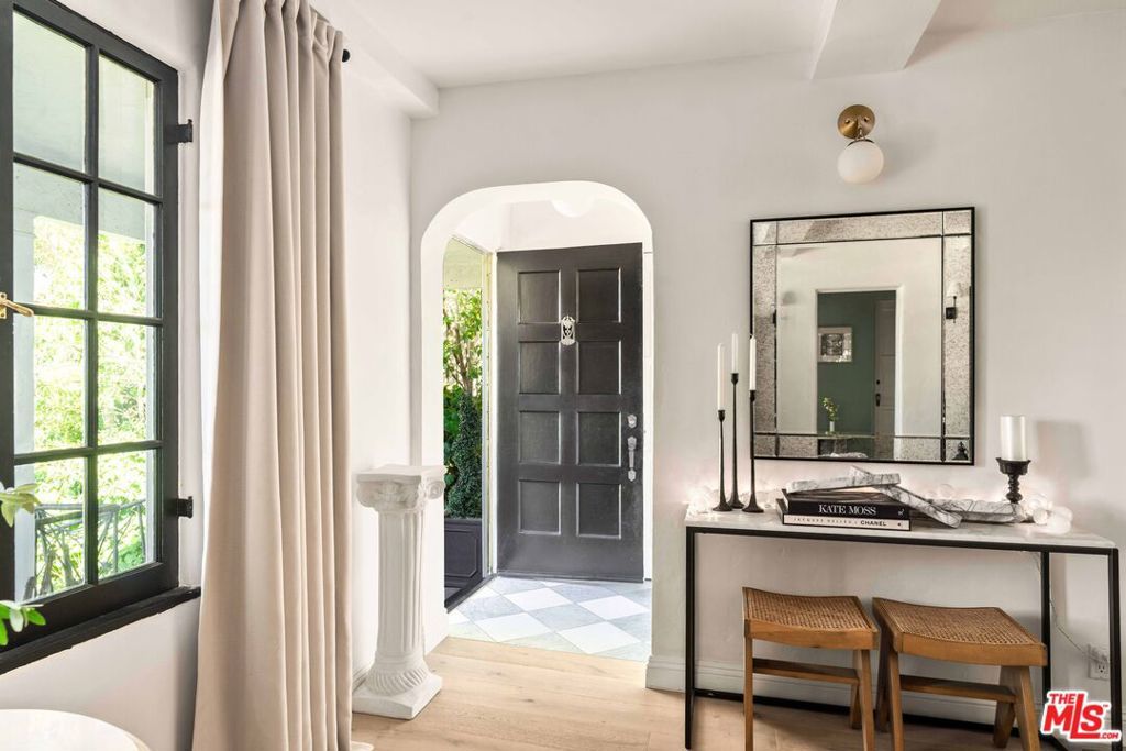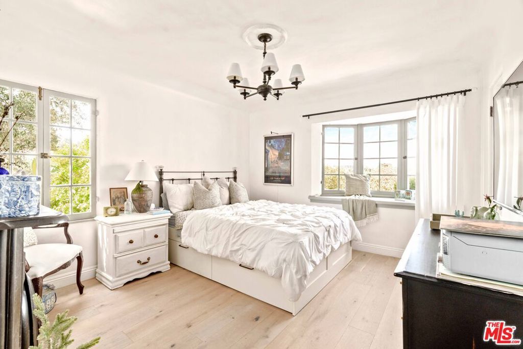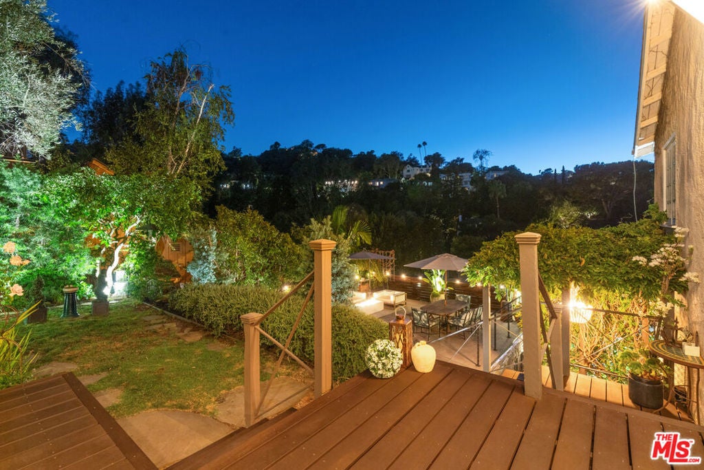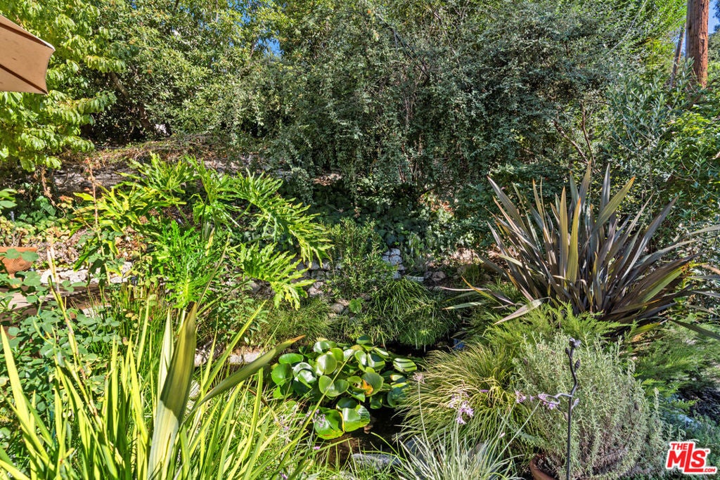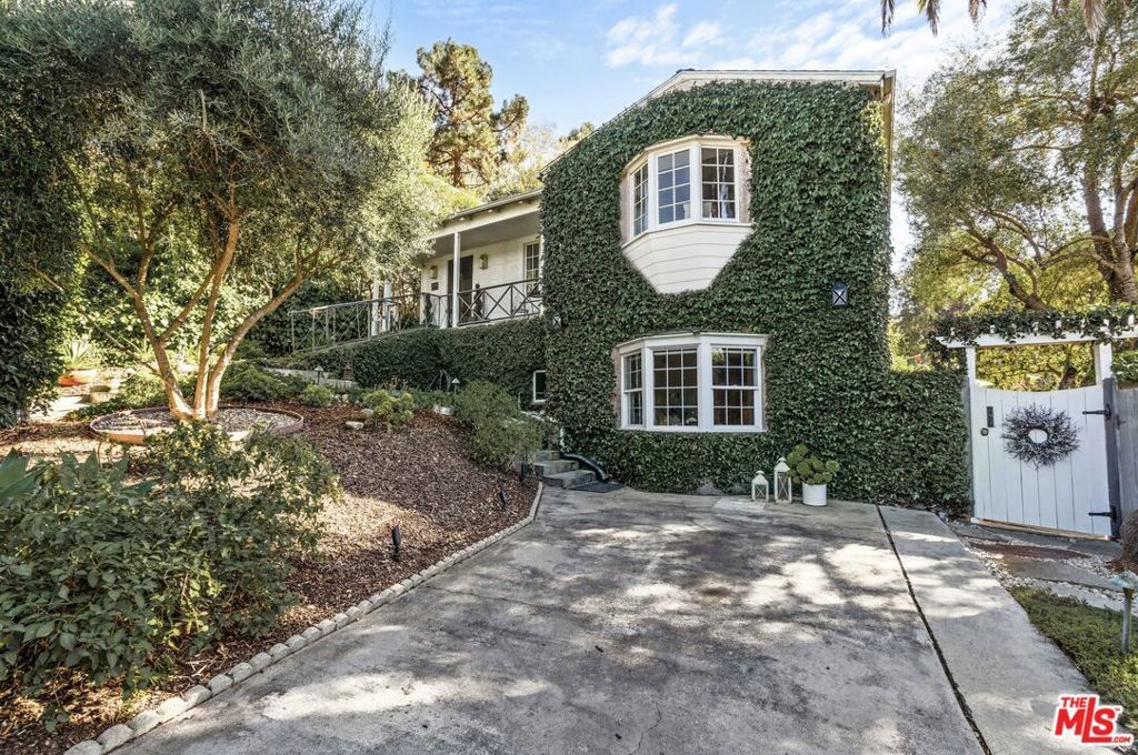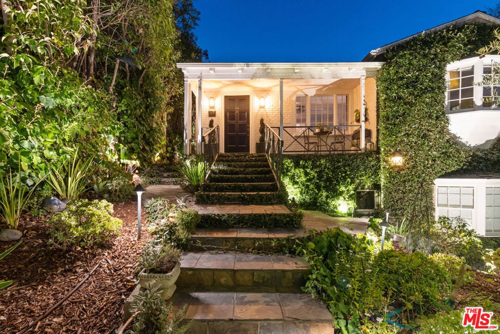 Nestled in the Hollywood Hills on a corner lot is this elegant 1934 traditional gated home surrounded by serene canyon vistas offering 4 bedrooms and 3 bathrooms with 2,352 of interior square footage spanning over two-stories. This sophisticated residence tastefully combines the modern conveniences of today and timeless old-world charm that will have you feeling like you're on a European getaway. Beamed ceilings, decorative archways, new hardwood floors, Mullion windows, original doors and imported hardware seamlessly meld together to create an alluring ambience. The main level is comprised of a reimagined open living space that includes a newly remodeled eat-in kitchen with an oversized waterfall island accommodating seating for four, top of the line stainless steel appliances including a wine fridge, wood paneled ceilings, custom lighting and pantry. Adjacent to the kitchen is an inviting den featuring an adobe fireplace, and French doors that open to lush gardens, meandering pathways, lily pad dotted pond, mature fruit trees, multiple seating and dining areas plus an expansive roof top deck perfect al fresco dining or hosting a lavish party under the stars on the magical sprawling grounds. All three guest bedrooms also on the main level are drenched in sunlight and enjoy beautiful vistas of the hills. The lower level offers its own separate entrance and consists entirely of a spacious primary suite with new Chevron white oak floors, a chic updated bathroom with dual vanity, separate shower and tub, a flexible office/sitting area, built-in vanity area and extra storage. Conveniently located near Universal Studios, the iconic Hollywood Bowl, hiking trails, popular restaurants and shops in both Studio City and Hollywood with several neighborhood eateries just blocks away. A detached three-car garage, hot tub and gated driveway with keypad security entrance complete this private Hollywood Hills oasis.