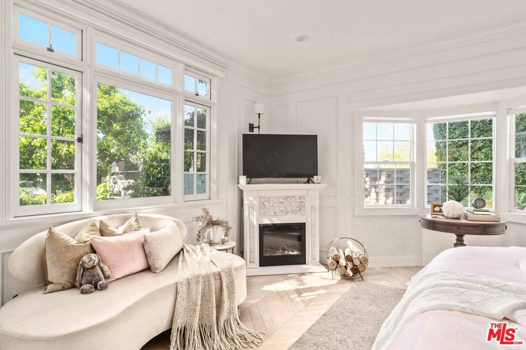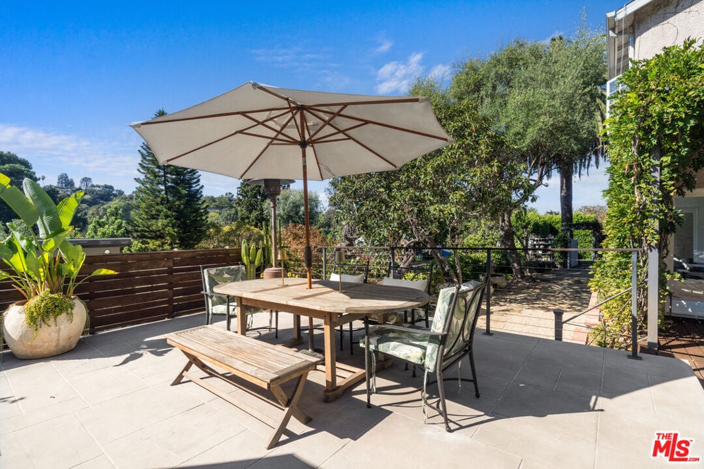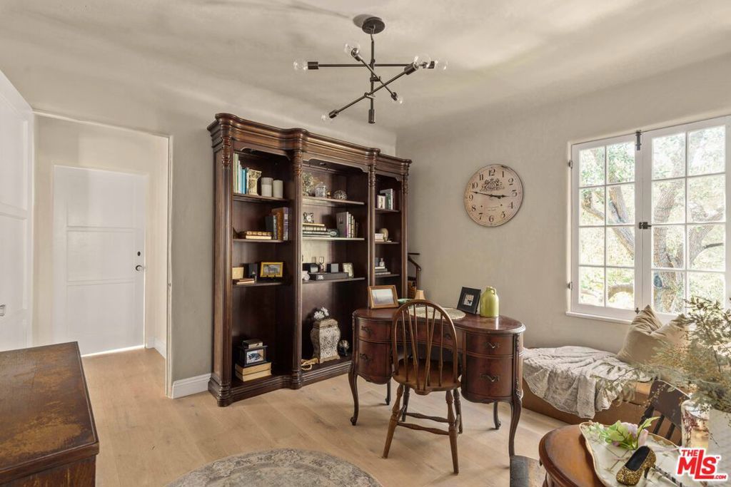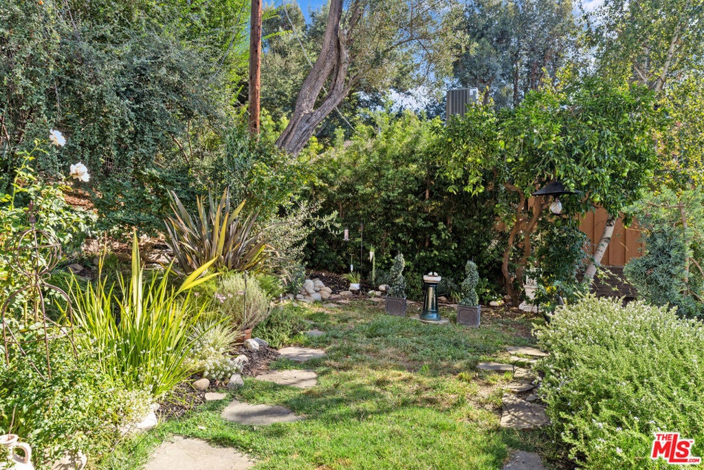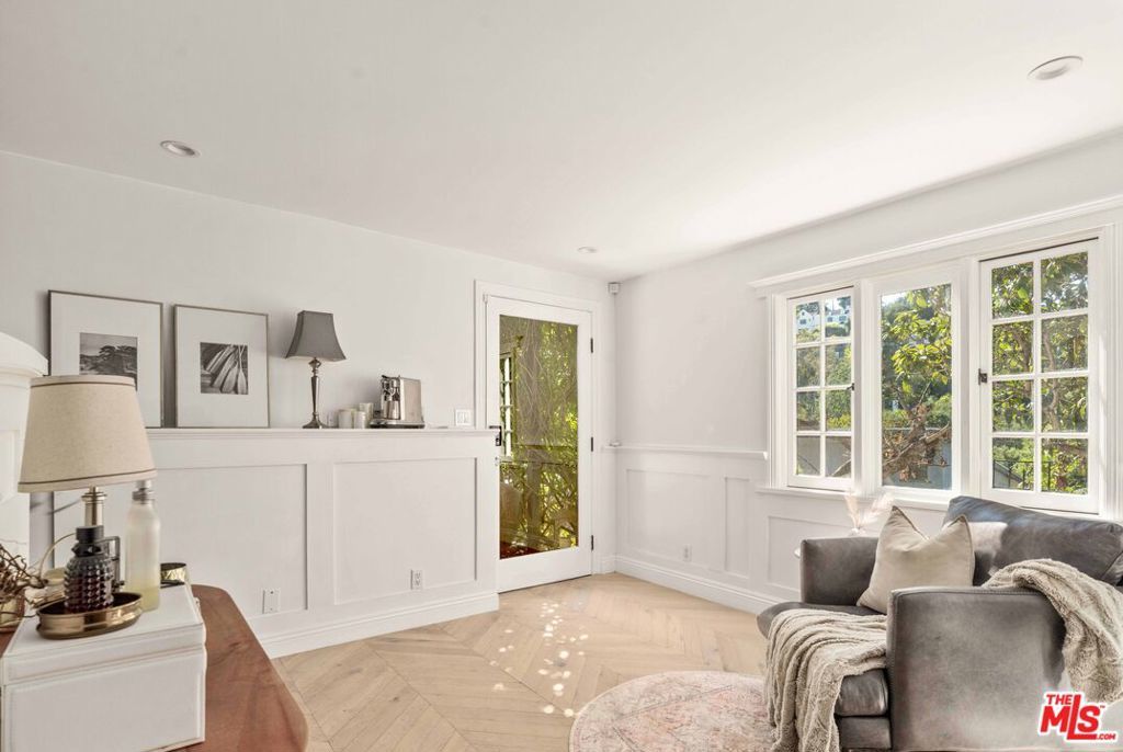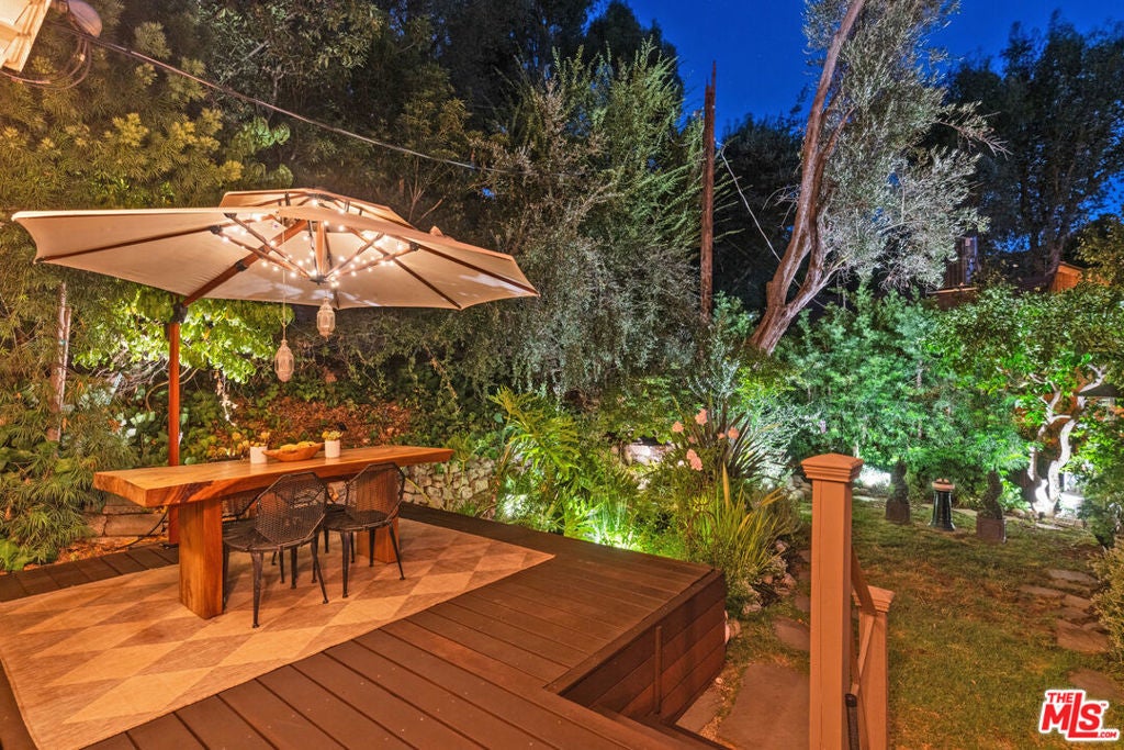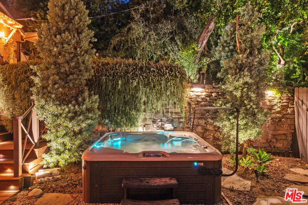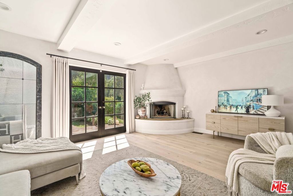 Nestled in the Hollywood Hills on a corner lot is this elegant 1934 traditional gated home surrounded by serene canyon vistas offering 4 bedrooms and 3 bathrooms with 2,352 of interior square footage spanning over two-stories. This sophisticated residence tastefully combines the modern conveniences of today and timeless old-world charm that will have you feeling like you're on a European getaway. Beamed ceilings, decorative archways, new hardwood floors, Mullion windows, original doors and imported hardware seamlessly meld together to create an alluring ambience. The main level is comprised of a reimagined open living space that includes a newly remodeled eat-in kitchen with an oversized waterfall island accommodating seating for four, top of the line stainless steel appliances including a wine fridge, wood paneled ceilings, custom lighting and pantry. Adjacent to the kitchen is an inviting den featuring an adobe fireplace, and French doors that open to lush gardens, meandering pathways, lily pad dotted pond, mature fruit trees, multiple seating and dining areas plus an expansive roof top deck perfect al fresco dining or hosting a lavish party under the stars on the magical sprawling grounds. All three guest bedrooms also on the main level are drenched in sunlight and enjoy beautiful vistas of the hills. The lower level offers its own separate entrance and consists entirely of a spacious primary suite with new Chevron white oak floors, a chic updated bathroom with dual vanity, separate shower and tub, a flexible office/sitting area, built-in vanity area and extra storage. Conveniently located near Universal Studios, the iconic Hollywood Bowl, hiking trails, popular restaurants and shops in both Studio City and Hollywood with several neighborhood eateries just blocks away. A detached three-car garage, hot tub and gated driveway with keypad security entrance complete this private Hollywood Hills oasis.