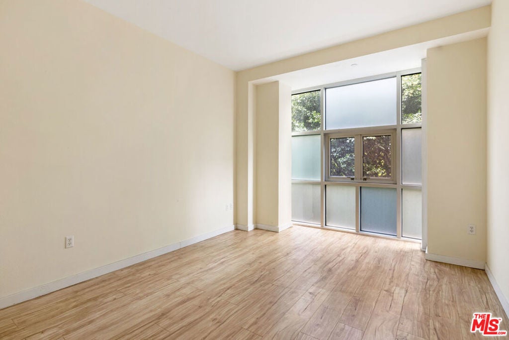 In the heart of Downtown LA, this bright one-bedroom condo at Library Court puts you close to museums and parks, with the Financial District at your doorstep and no commute required. The open layout feels spacious with high ceilings, wood flooring, and oversized windows framing views of tree-lined Sixth Street. The kitchen is finished with stainless appliances, blond cabinetry, and generous counter space. An enclosed bedroom provides privacy with room for a desk or larger furnishings; the bathroom includes a ceramic tiled floor and ample storage. Conveniences include in-unit laundry, central air, and a deeded parking space. Community amenities feature a zen garden, lounge, and a recently renovated gym. You're just minutes from Grand Central Market, MOCA, The Broad, and Crypto Arena, with Whole Foods, Spring Street Park, Pershing Square, and Little Tokyo all within easy reach, plus endless nightlife and shopping right outside your door.