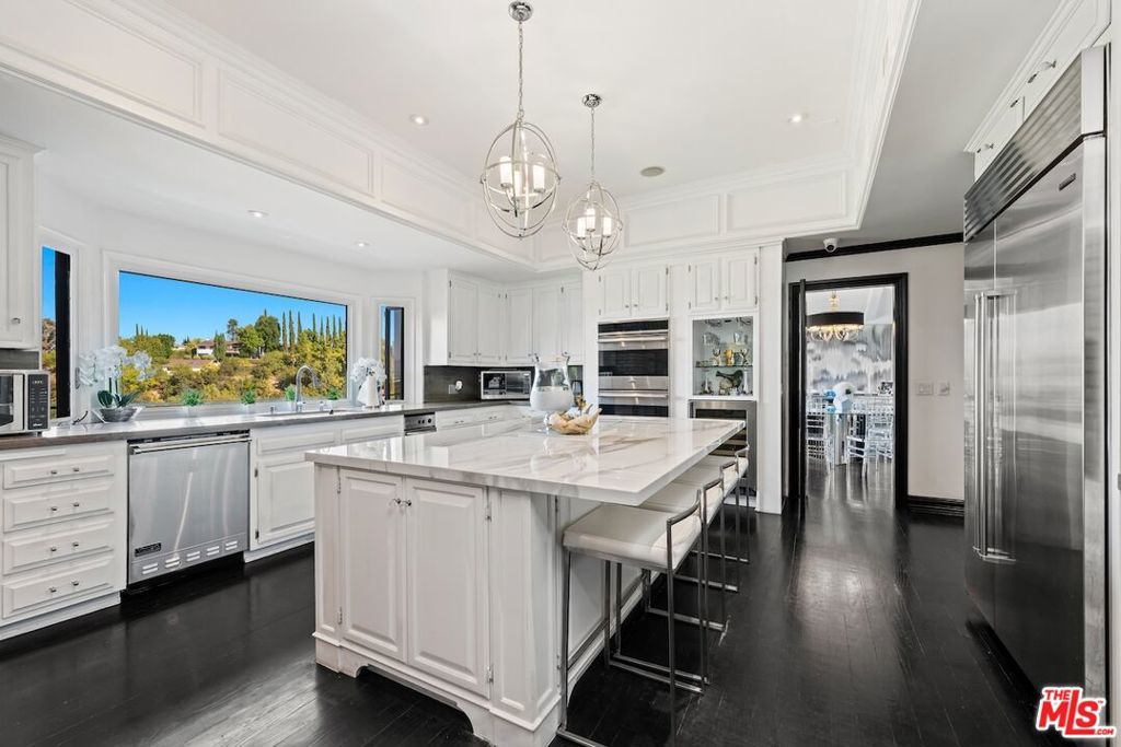 Experience everyday luxury living in this gated French Manor Estate, nestled in one of the most coveted neighborhoods of Encino Hills South of the Blvd. This exceptional residence captures sweeping city-light views and spans over 11,000 square feet of exquisite living space, featuring six bedrooms and eight bathrooms. Completely remodeled, the home blends elevated design with meticulously curated upgrades for comfort, style, and effortless entertaining. Upon arrival, guests are welcomed through a spacious courtyard into a grand entry filled with natural light and soaring ceilings. The great room showcases custom built-ins and coffered ceilings, while the living room's exposed beams create a warm, sophisticated ambiance. The private formal dining room, framed by expansive French windows, seamlessly connects to a butler's kitchen for ease of service. The gourmet kitchen is a chef's dream, appointed with top-tier appliances, a generous island, and a farmhouse sink overlooking tranquil city views. Upstairs, the expansive primary suite serves as a private sanctuary with a spa inspired bathroom featuring an oversized jet shower, double vanities, a fireplace, a large walk-in closet, and a private terrace framing the spectacular views. Three additional en-suite bedrooms complete the top level. Descending to the third level reveals an entertainer's haven with a state-of-the-art theater, an elegant billiards room with terrace access, a sauna, a library, and a climate controlled wine cellar. The outdoor spaces are equally impressive, featuring a sparkling pool, fireplace, basketball court, and pool house perfect for year-round gatherings. This is a residence of unmatched caliber that must be experienced in person to be truly appreciated. Schedule a private showing today and witness its beauty firsthand.