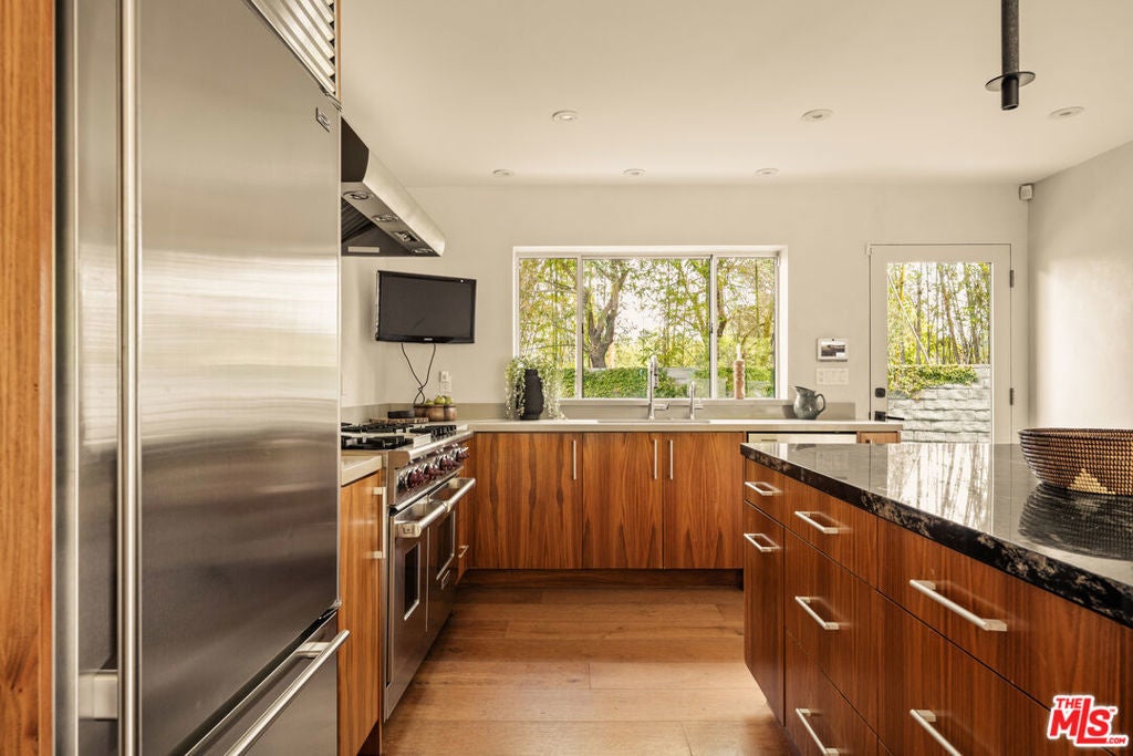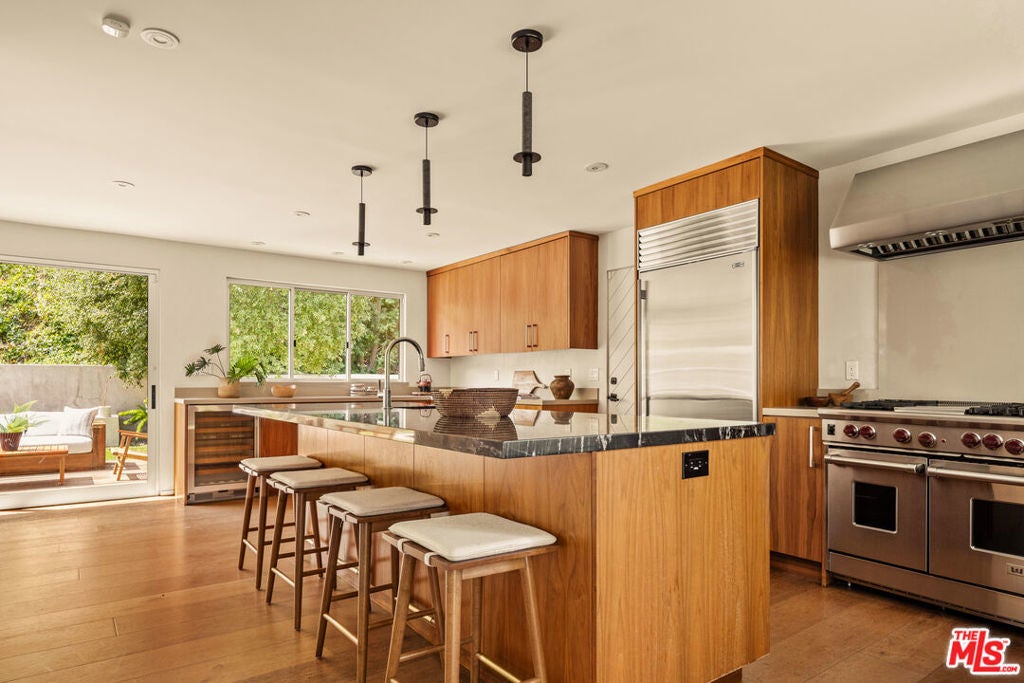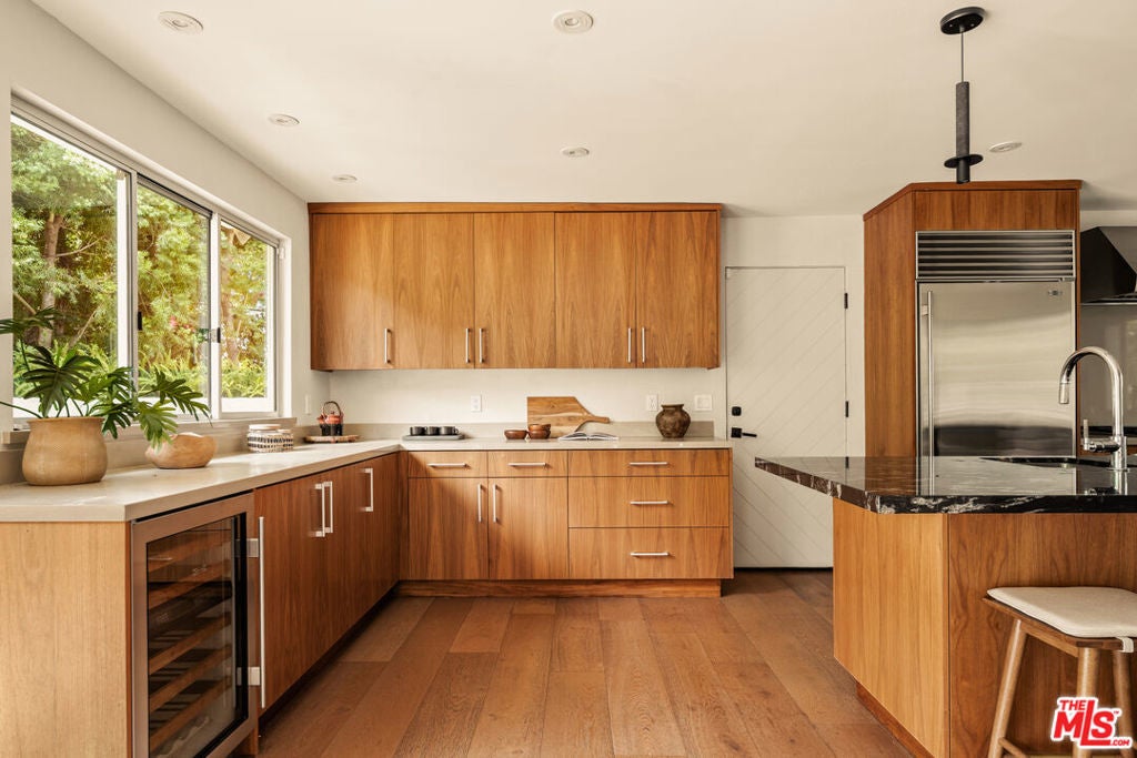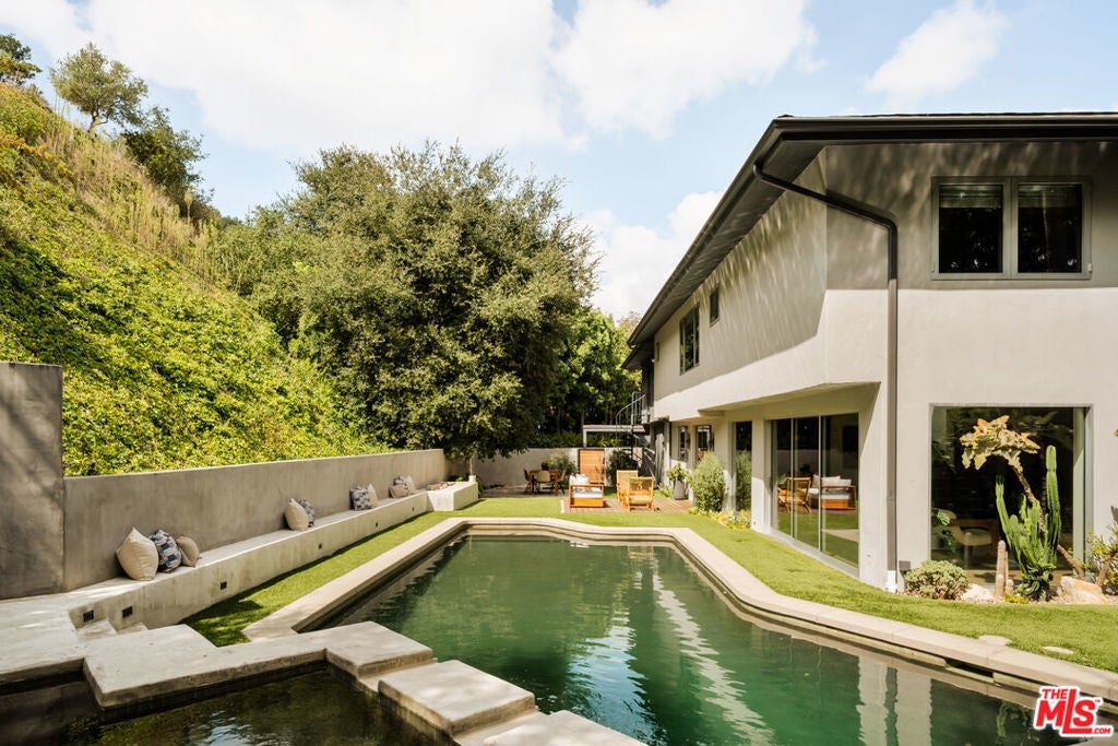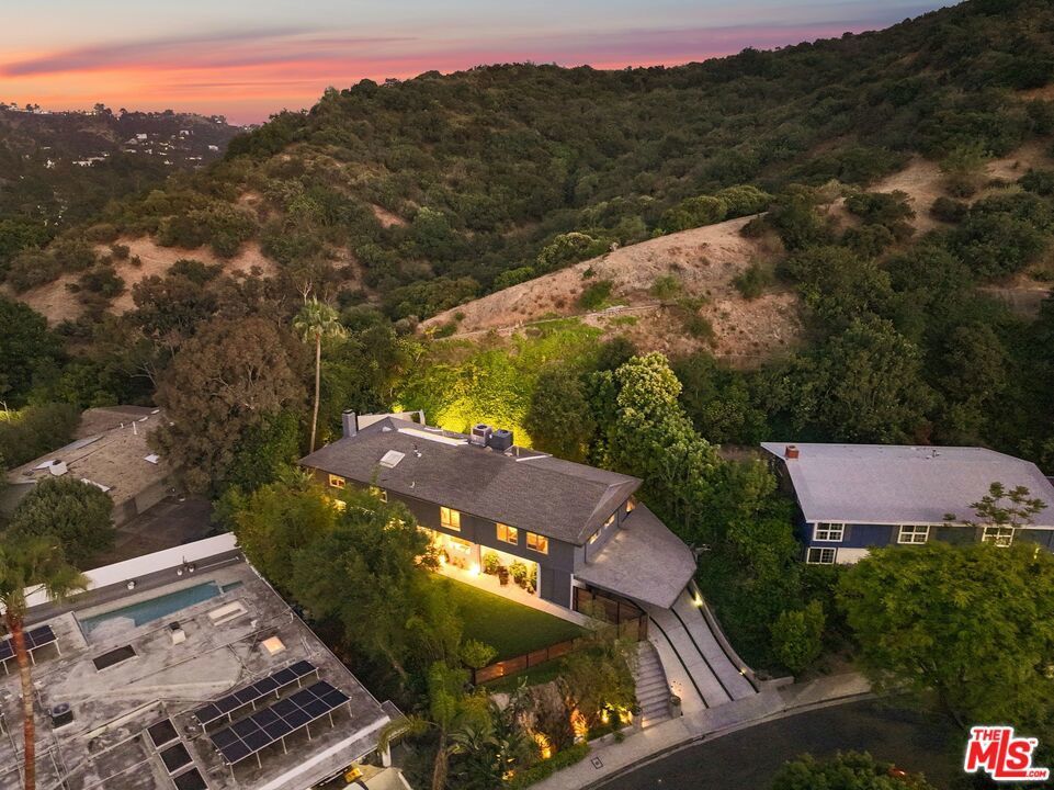 Tucked away on a quiet, private street in picturesque Nichols Canyon, this beautifully updated home is a sanctuary in the Hollywood Hills. With remodeled bathrooms, a newer roof, updated electrical, plenty of easy parking, and an EV charger already installed, every detail has been thoughtfully considered for modern living. Step inside to find stylish finishes, a bright kitchen with new counters, and a seamless indoor-outdoor flow perfect for entertaining. The home's standout feature: two expansive flat yards - ideal for pool parties, al fresco dining, or a dedicated play area under the California sun. The flat yard space, private cul-de-sac, and easy street parking for guests are a rare treat in the hills! The oversized primary bedroom & bathroom are remodeled but maintain the mid-century charm. With hillside & pool views and plenty of storage space the suite combines canyon tranquility with modern comforts. A converted garage offers flexible bonus space for a home gym, creative studio, or guest retreat, while ample parking ensures convenience for both everyday life and gatherings. Enjoy the peace and privacy of canyon living just minutes from the excitement of West Hollywood, Runyon Canyon, and the Sunset Strip. A true gem offering space, style, and versatility in one of LA's most coveted neighborhoods.