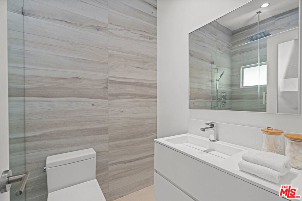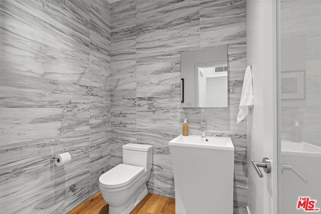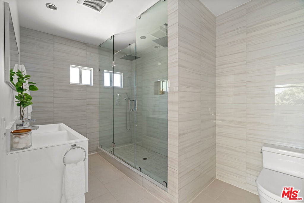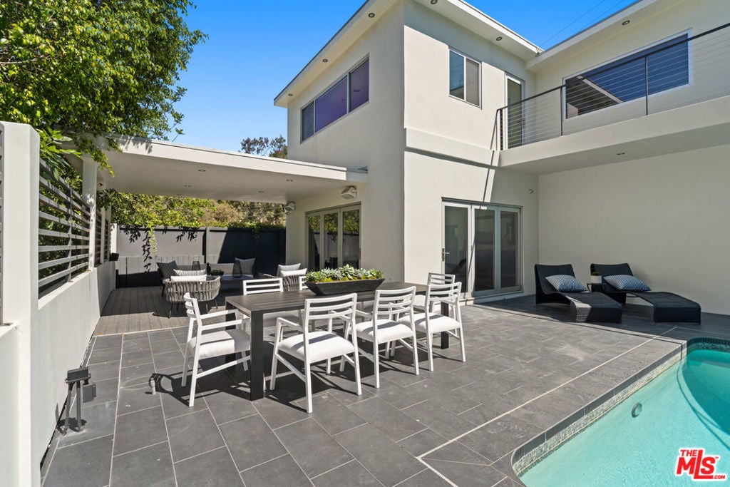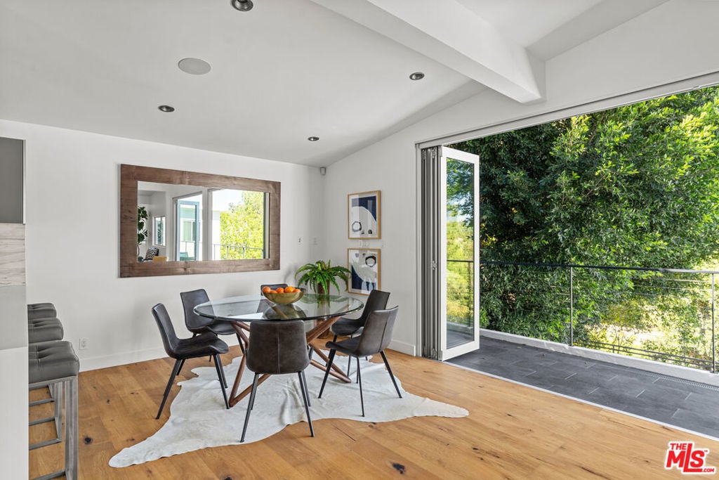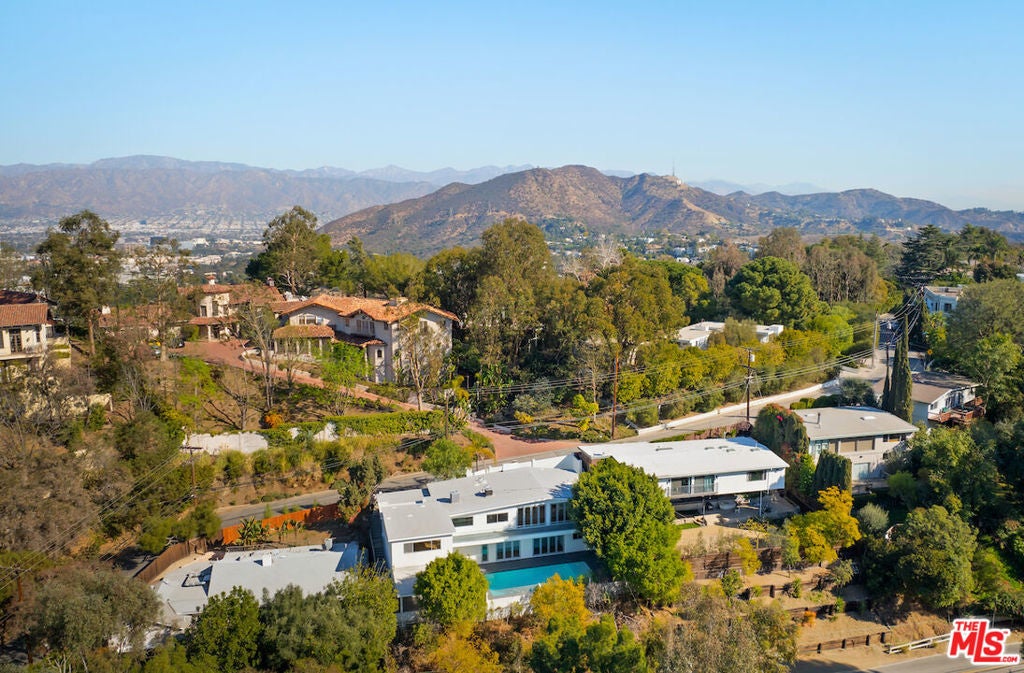 Nestled in the iconic Hollywood Hills on Woodrow Wilson Drive's "celebrity row", this stunning mid-century home with pool offers a harmonious balance of indoor and outdoor quintessential Southern California living. Spanning over 3,400 square feet, the residence includes 4 spacious bedrooms and 4.5 bathrooms with an expansive open layout and oak floors throughout. The main level features a sleek modern living space including a Chef's gourmet kitchen fitted with Modulo Cucine cabinets, Thermador appliances and island with breakfast bar that is perfect for entertaining. Adjoining dining and living areas are framed by large folding glass doors opening to a newly constructed second level patio showcasing the serene surroundings and sweeping treetop vistas. The lower level is a private haven, featuring a luxurious primary suite with a spa-like bathroom, walk-in closet, and direct access to the patio and heated in-ground pool. Additional rooms include an office and ensuite bedroom, providing ample space for work, guests, or family. Private outdoor area is designed for relaxation and entertaining, with the potential to add an outdoor kitchen for alfresco dining. This thoughtfully designed home is equipped with integrated speakers, a security system, and an electric vehicle charging station in the attached two-car garage. Situated in one of the most sought-after neighborhoods in the Hollywood Hills offering unparalleled privacy while remaining conveniently close to hiking trails, world-class dining, shopping, and entertainment including Universal Studios, The Hollywood Bowl, and the Hollywood Walk of Fame.