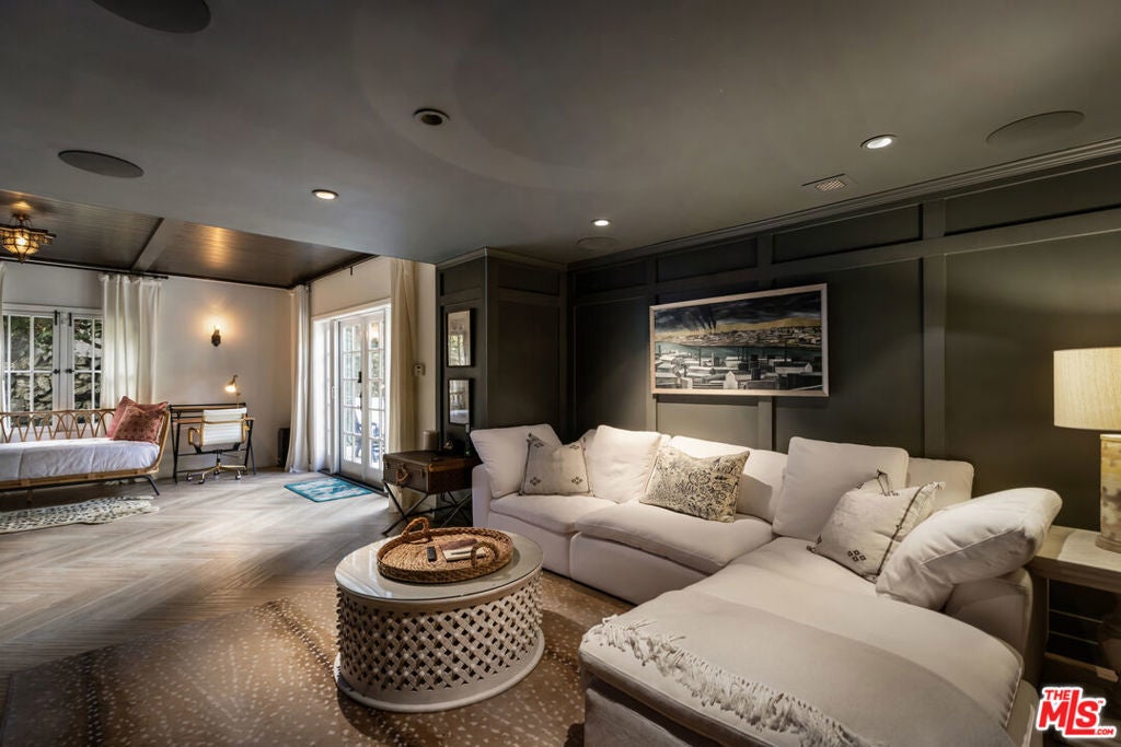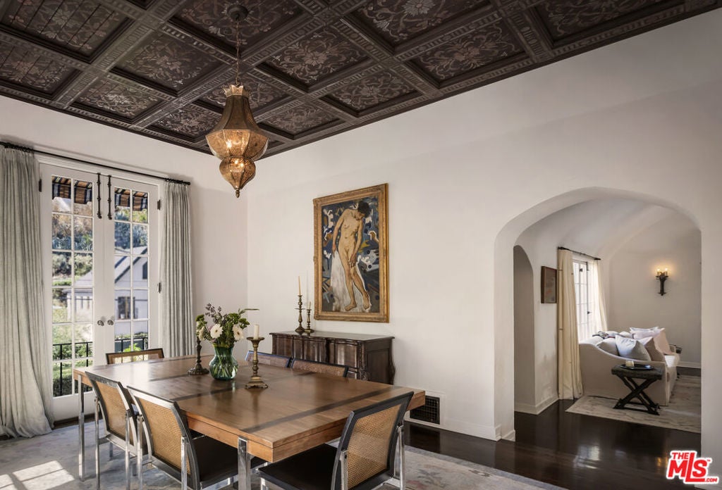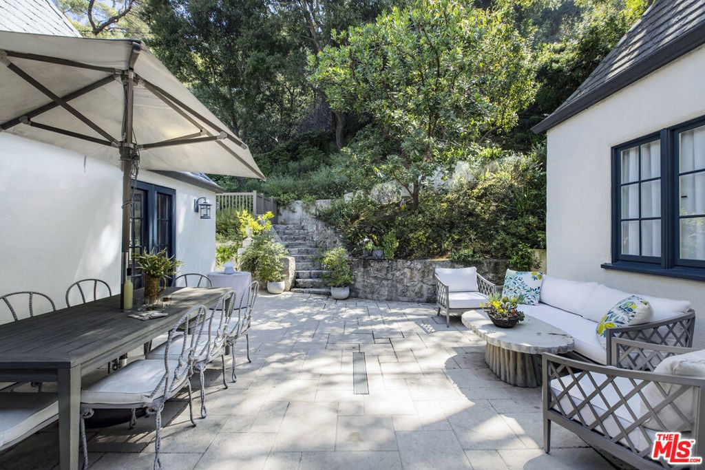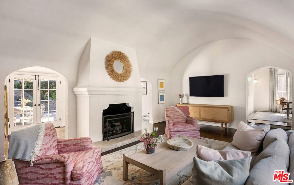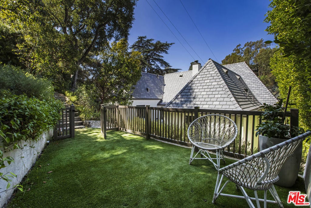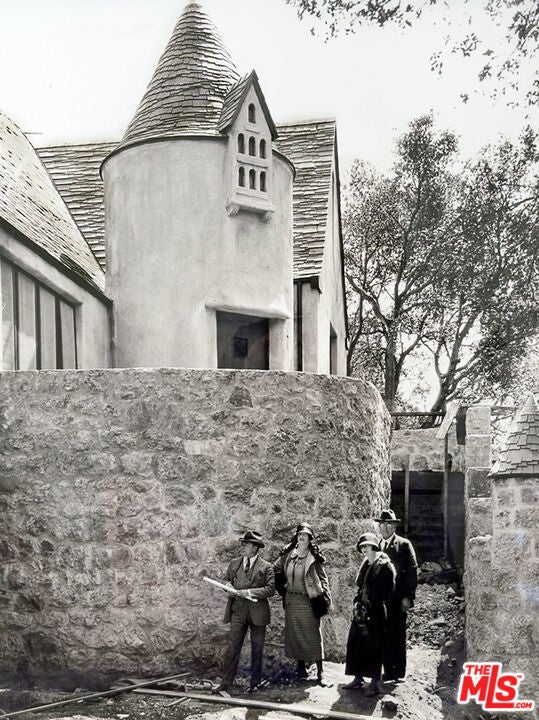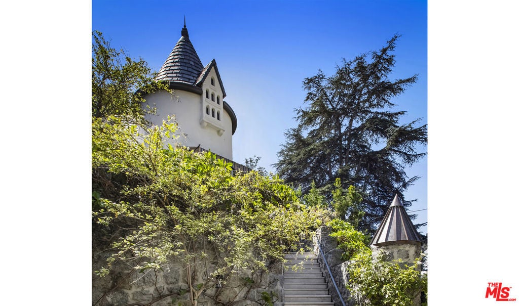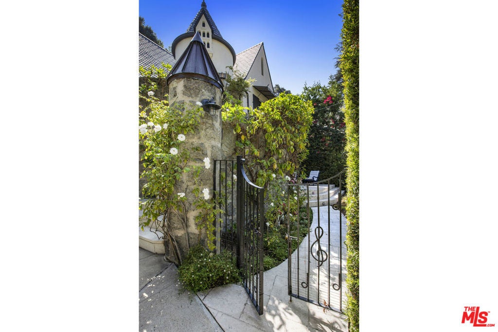 c.1924 JOHN DeLARIO, ARCHITECT. LEGENDARY chief designer of HOLLYWOODLAND and creator of some of Beachwood Canyon's most iconic residences, including the signature stone entry gates, left his visionary mark on this pedigree French Norman storybook home, as well as on landmarks like Castillo Del Lago, (c.1926) among Southern California's most significant Spanish estates. PRIVATE Entertainment home. 4-bed, 3-bath; formal dining room beneath hand-painted coffered ceilings that open to the canyon, an adjoining living room with sculpted coved ceiling, rich hardwood floors, and striking fireplace, all exemplifies DeLario's craftsmanship where Hollywood romance meets architectural precision. Entertainers home: French doors along the main level flow to the courtyard and terraced lawn, evoking the grace of a petite European villa. A stone patio invites slow afternoons, whether savoring a meal or a book whose pages turn slowly. The classic kitchen pairs connoisseurs' appliances with pretty custom shaker cabinetry. Three boutique-inspired bedrooms occupy private corners of the home, while a fourth suite with a private musical-entry nod and a memorable media room forms a garden-wrapped retreat. Interiors layered by Kathryn Ireland and Brittany Bromley infuse warmth and character throughout, and direct access adds ease. The hand-hewn stone exterior, a signature of DeLario's artistry, endures as a rare and distinguished fragment of Hollywoodland's architectural Beachwood legacy. --Public records show 2550sqft. Vendor measurements are 2760sqft. Buyer to verify.