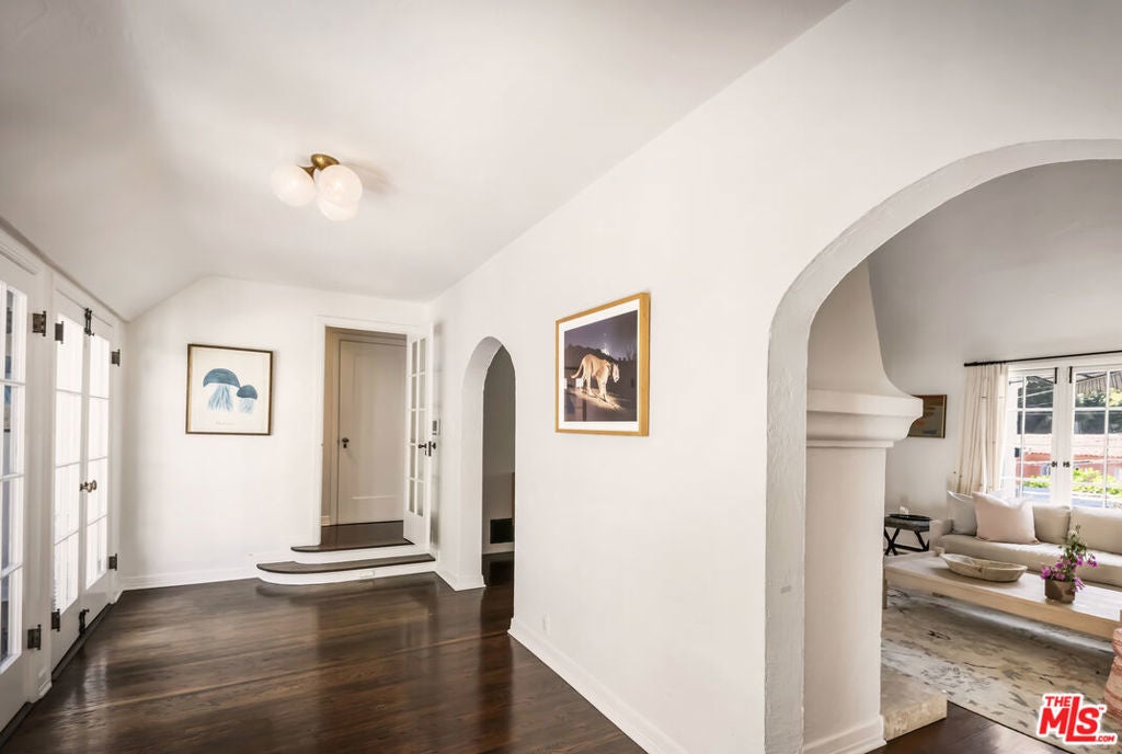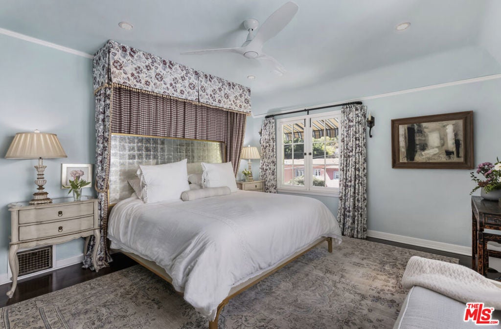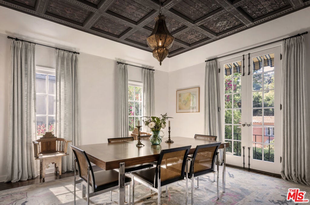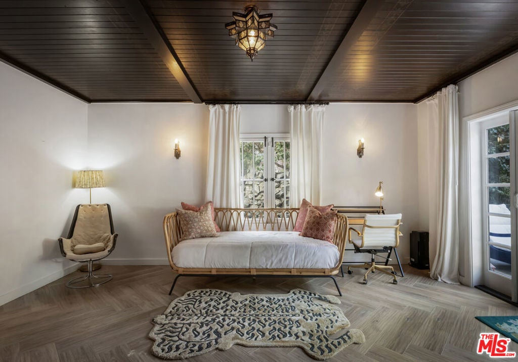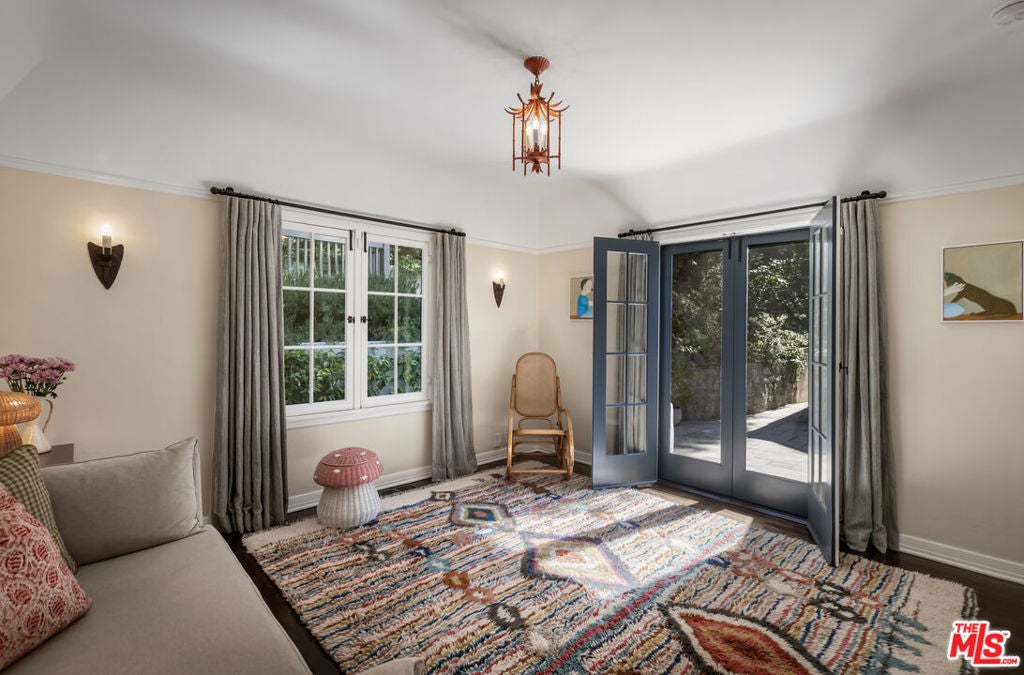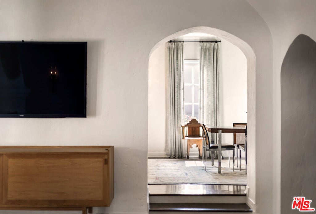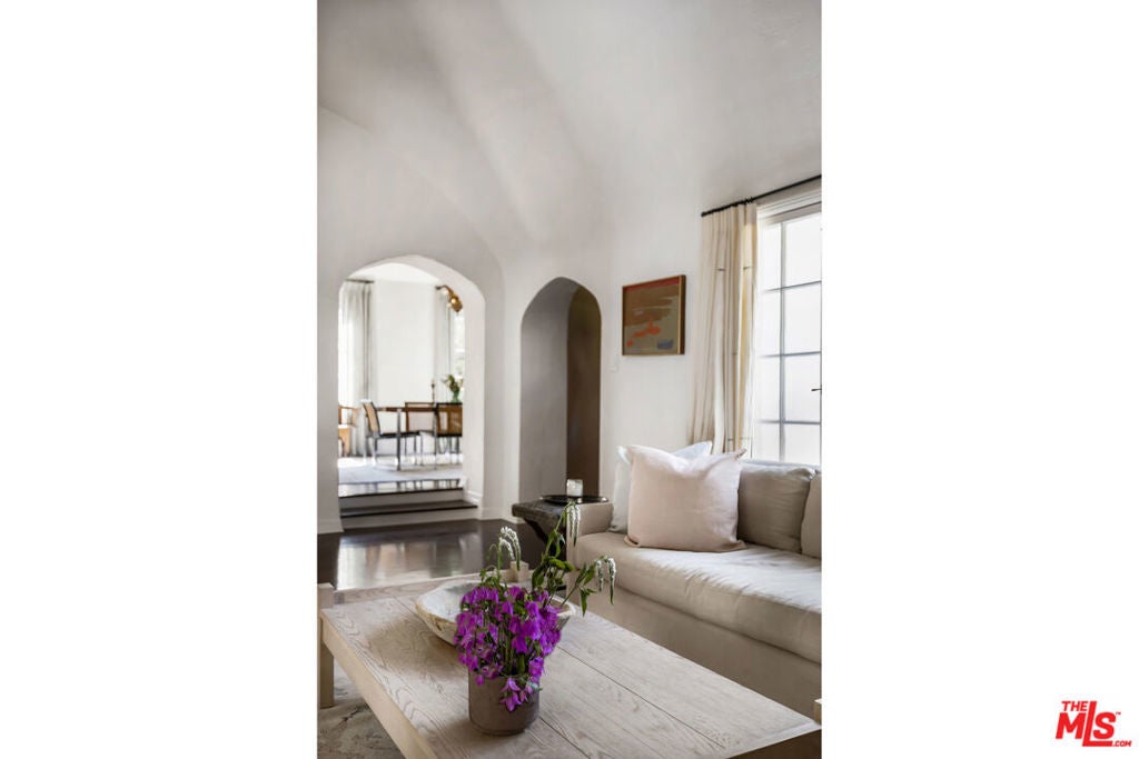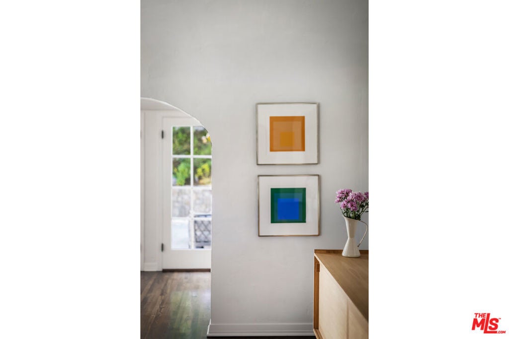 c.1924 JOHN DeLARIO, ARCHITECT. LEGENDARY chief designer of HOLLYWOODLAND and creator of some of Beachwood Canyon's most iconic residences, including the signature stone entry gates, left his visionary mark on this pedigree French Norman storybook home, as well as on landmarks like Castillo Del Lago, (c.1926) among Southern California's most significant Spanish estates. PRIVATE Entertainment home. 4-bed, 3-bath; formal dining room beneath hand-painted coffered ceilings that open to the canyon, an adjoining living room with sculpted coved ceiling, rich hardwood floors, and striking fireplace, all exemplifies DeLario's craftsmanship where Hollywood romance meets architectural precision. Entertainers home: French doors along the main level flow to the courtyard and terraced lawn, evoking the grace of a petite European villa. A stone patio invites slow afternoons, whether savoring a meal or a book whose pages turn slowly. The classic kitchen pairs connoisseurs' appliances with pretty custom shaker cabinetry. Three boutique-inspired bedrooms occupy private corners of the home, while a fourth suite with a private musical-entry nod and a memorable media room forms a garden-wrapped retreat. Interiors layered by Kathryn Ireland and Brittany Bromley infuse warmth and character throughout, and direct access adds ease. The hand-hewn stone exterior, a signature of DeLario's artistry, endures as a rare and distinguished fragment of Hollywoodland's architectural Beachwood legacy. --Public records show 2550sqft. Vendor measurements are 2760sqft. Buyer to verify.