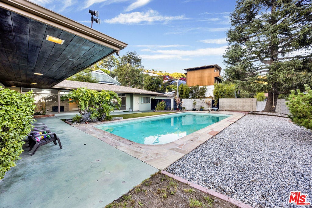 Perched above the city in one of Hollywood's most storied enclaves, this gated mid-century retreat feels like a secret whispered only to those who know where to look. Nestled at the top of a quiet cul-de-sac in Outpost Estates, it sits on an exceptionally rare, extra-large flat lot a true rarity in the hills blending timeless California cool with Frank Sinatra-era allure. Inside, the sprawling single-story design unfolds with wood-beamed ceilings, walls of glass, and an effortless indoor-outdoor rhythm that defines classic Los Angeles living. The sun-drenched living room, anchored by a dramatic mid-century fireplace, opens directly to the shimmering pool, while the primary suite offers that same cinematic view perfect for moonlit swims and stolen moments under the stars. With 4 bedrooms and 4 baths, including vaulted guest suites with exposed beams, the home offers pedigree, privacy, and untapped potential. The expansive grounds can easily host grand-scale entertaining think sunset soires, poolside receptions, and lively gatherings for hundreds beneath the open sky. Whether you restore its 1951 mid-century soul or craft a new modern masterpiece, this is where Hollywood dreams still shimmer with possibilities.