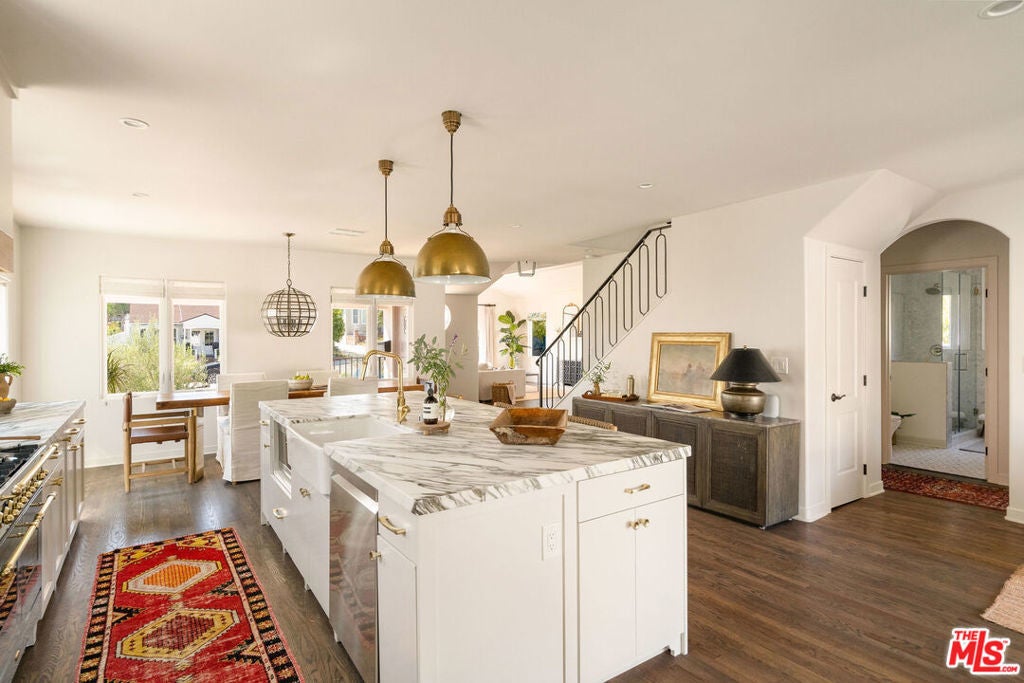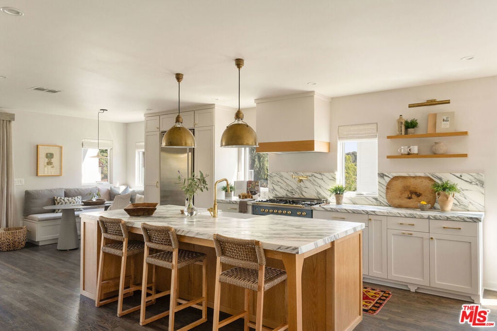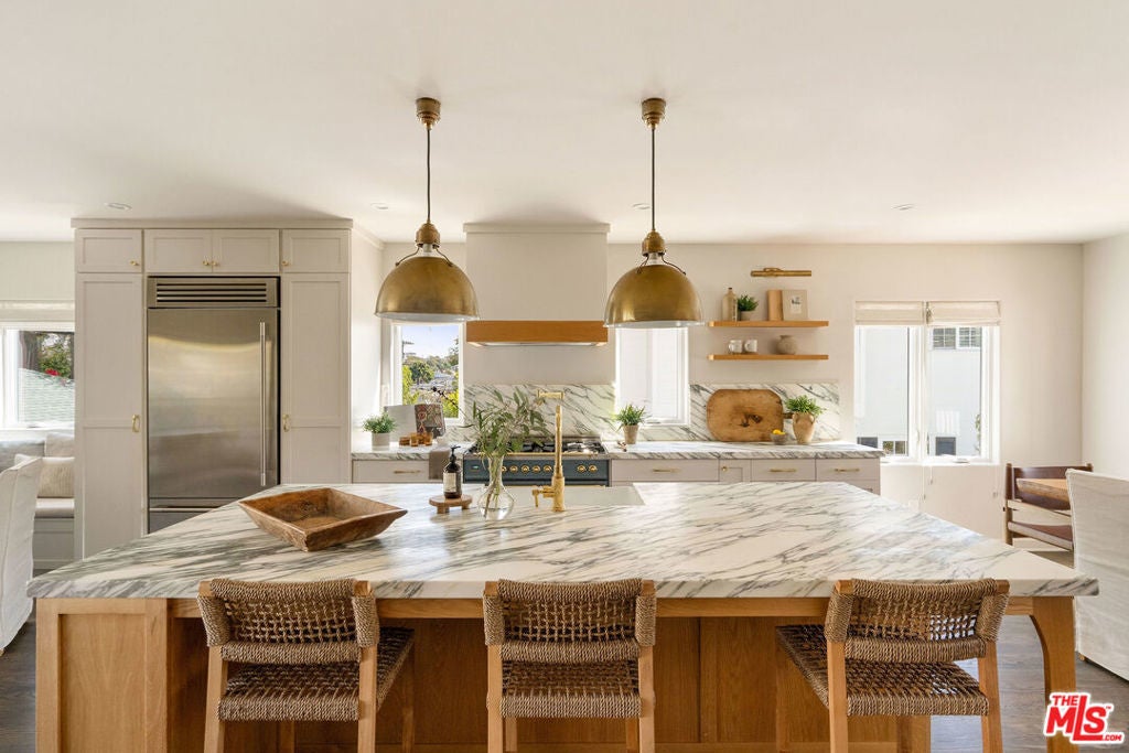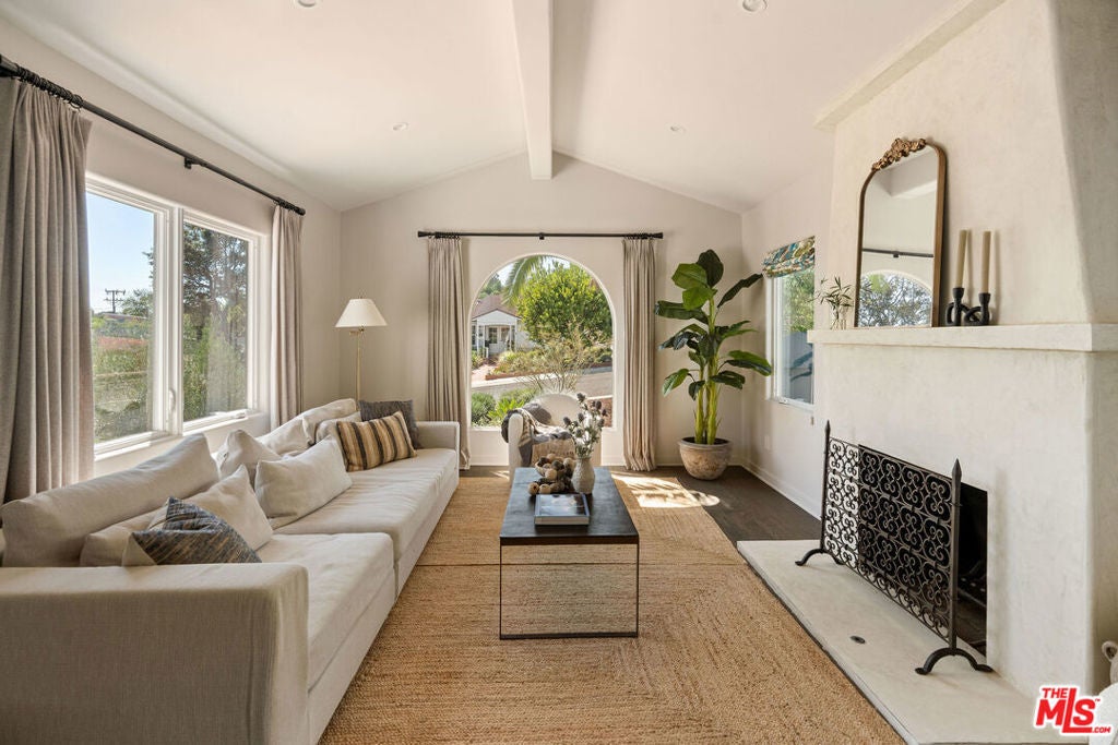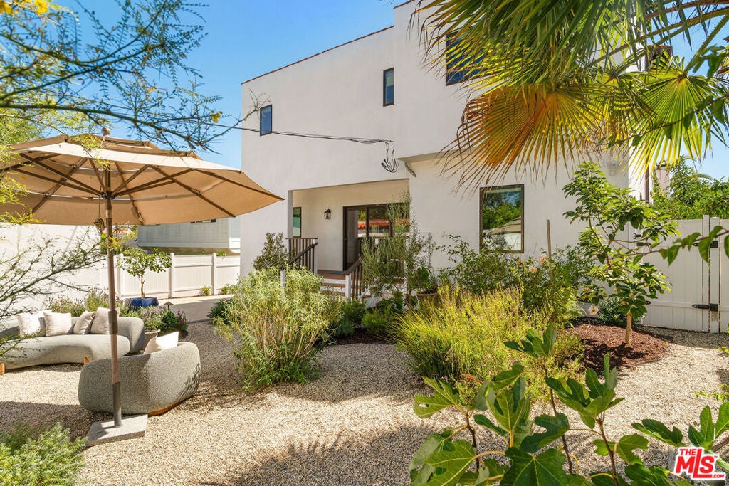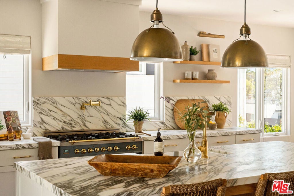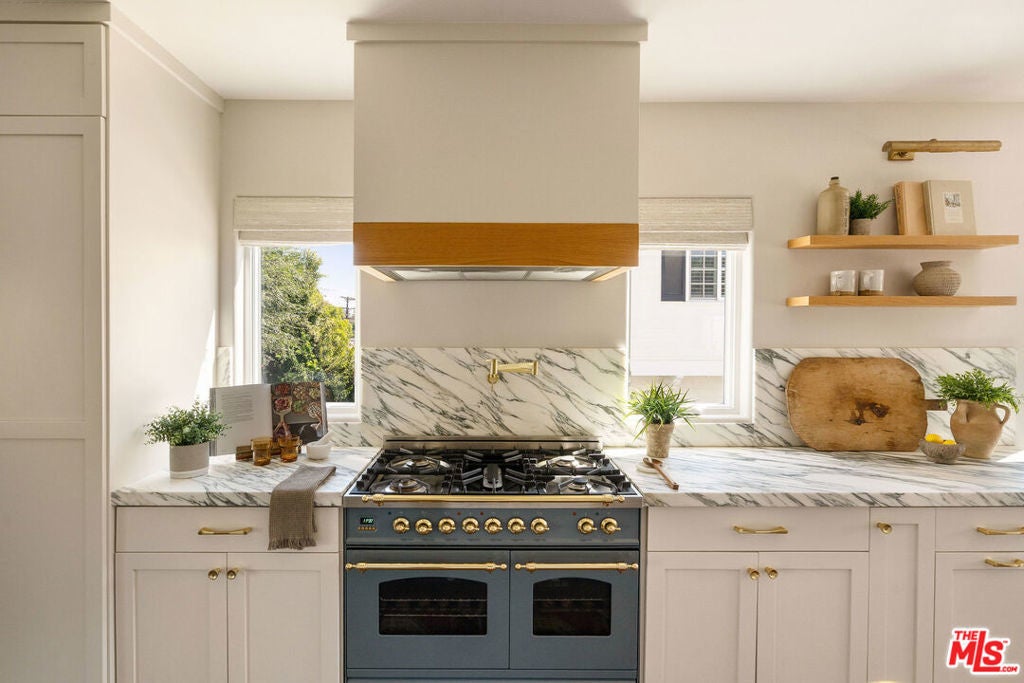 This Spanish-style Westchester residence was taken down to the studs and fully reimagined by a seasoned interior designer, completed in 2022 with impeccable attention to detail. Every space blends modern luxury with timeless character, from the wood-burning fireplace with a gas starter to custom ironwork railings and hardwood floors. The chef's kitchen is a showpiece, featuring custom wood cabinetry with Rejuvenation hardware, Arabescato marble counters, and top-tier European appliances including an ILVE 40" range, brass pot filler, and Fulgor Milano built-ins. The spa-like primary suite boasts a double vanity with Arabescato marble, a freestanding soaking tub, and an oversized shower with Kallista rain fixtures. Designer window treatments and curated finishes throughout underscore the home's elevated design. Outside, drought-tolerant landscaping, automatic lighting, and citrus and fruit trees create a private backyard retreat. A finished garage with 200v EV charging outlet completes this turnkey offering. Ideally located on a quiet, welcoming street, just minutes from Playa del Rey, Playa Vista, Silicon Beach, and LAX, this home delivers a rare blend of coastal convenience, Spanish character, and true designer pedigree.