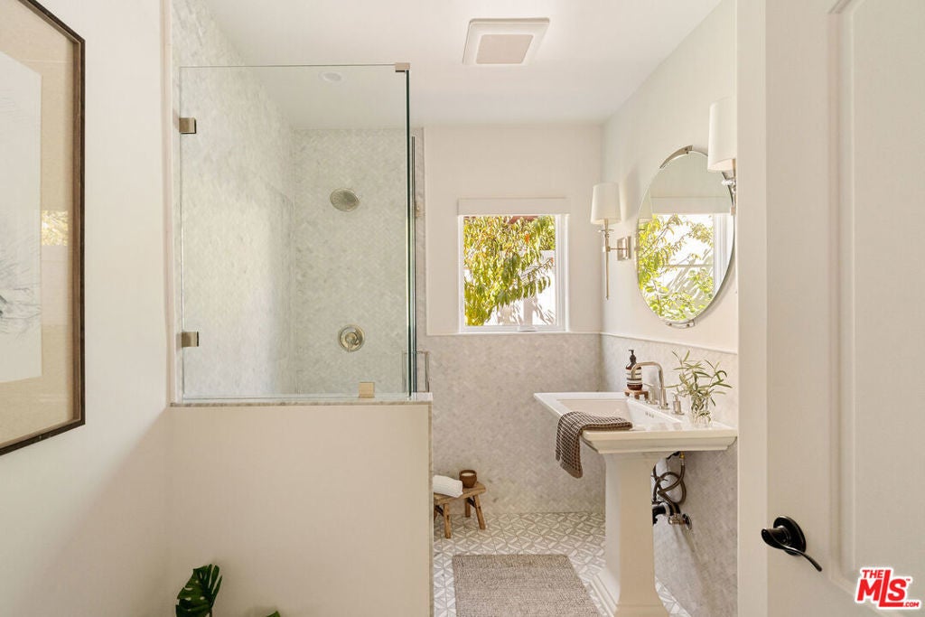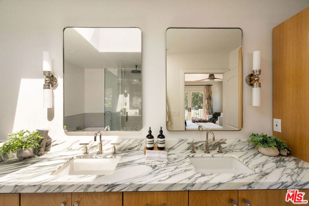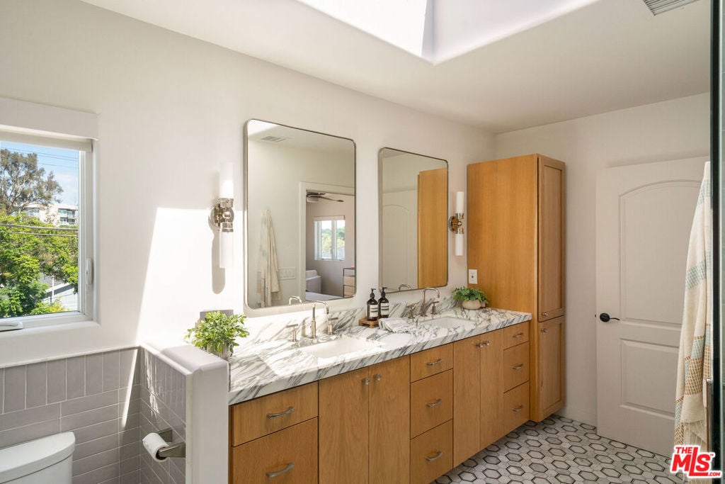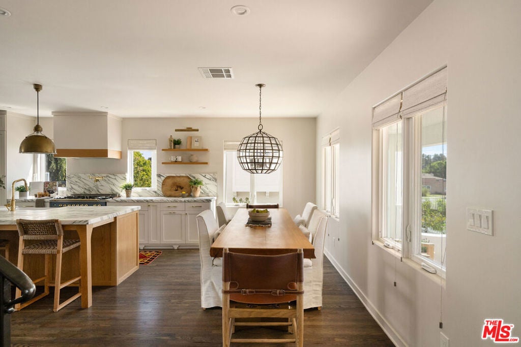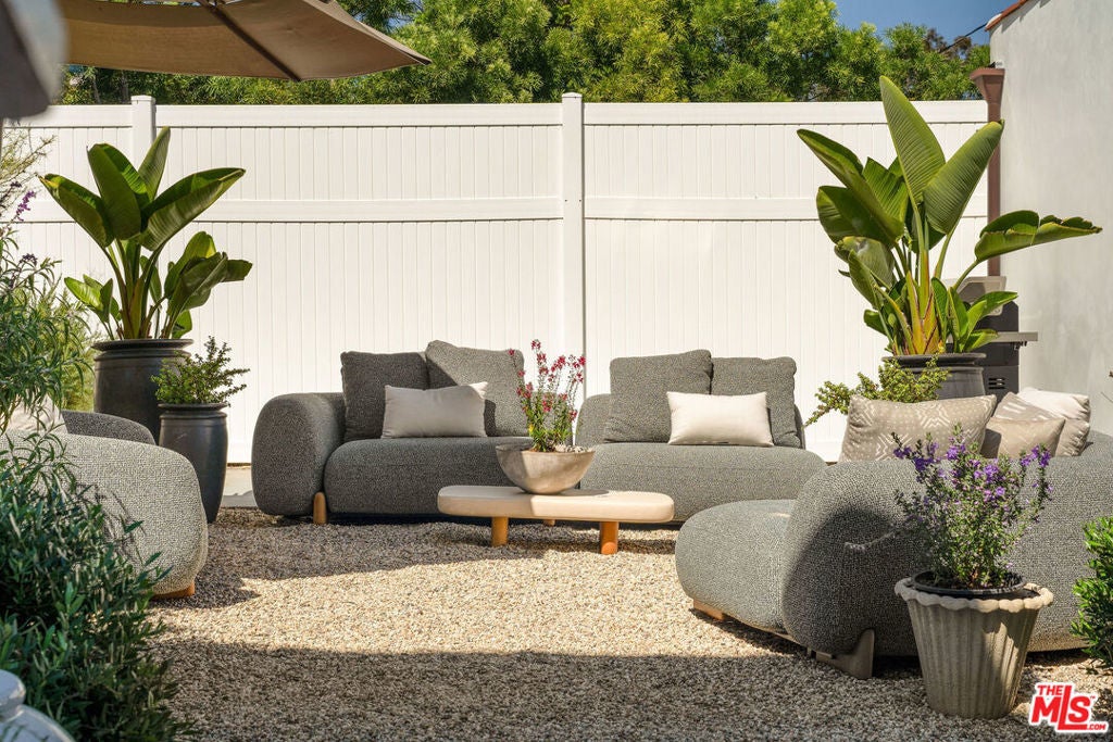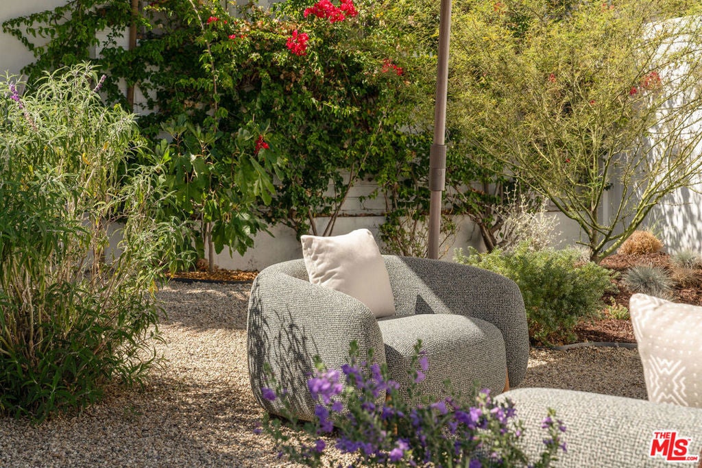 This Spanish-style Westchester residence was taken down to the studs and fully reimagined by a seasoned interior designer, completed in 2022 with impeccable attention to detail. Every space blends modern luxury with timeless character, from the wood-burning fireplace with a gas starter to custom ironwork railings and hardwood floors. The chef's kitchen is a showpiece, featuring custom wood cabinetry with Rejuvenation hardware, Arabescato marble counters, and top-tier European appliances including an ILVE 40" range, brass pot filler, and Fulgor Milano built-ins. The spa-like primary suite boasts a double vanity with Arabescato marble, a freestanding soaking tub, and an oversized shower with Kallista rain fixtures. Designer window treatments and curated finishes throughout underscore the home's elevated design. Outside, drought-tolerant landscaping, automatic lighting, and citrus and fruit trees create a private backyard retreat. A finished garage with 200v EV charging outlet completes this turnkey offering. Ideally located on a quiet, welcoming street, just minutes from Playa del Rey, Playa Vista, Silicon Beach, and LAX, this home delivers a rare blend of coastal convenience, Spanish character, and true designer pedigree.