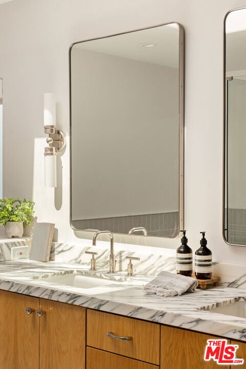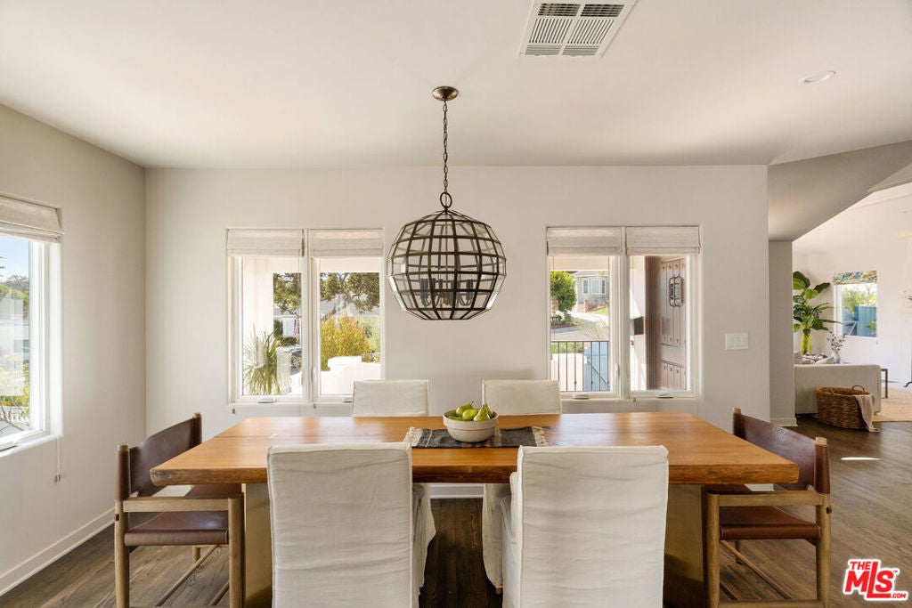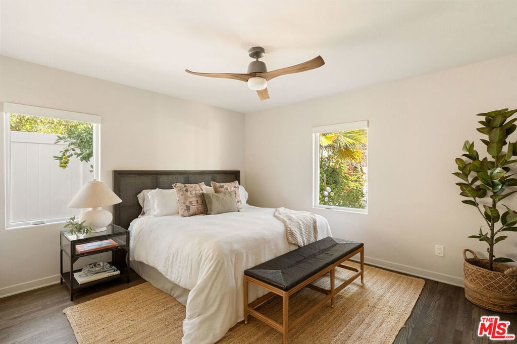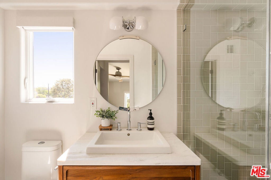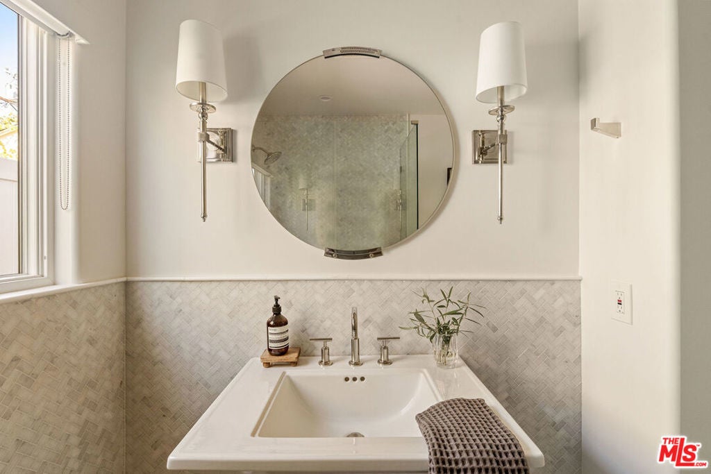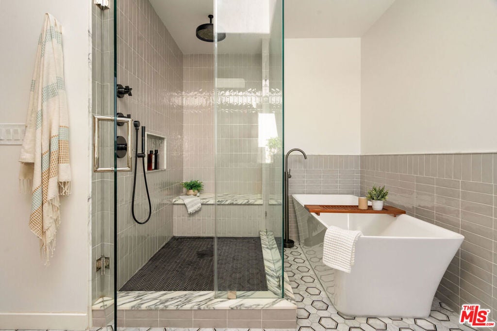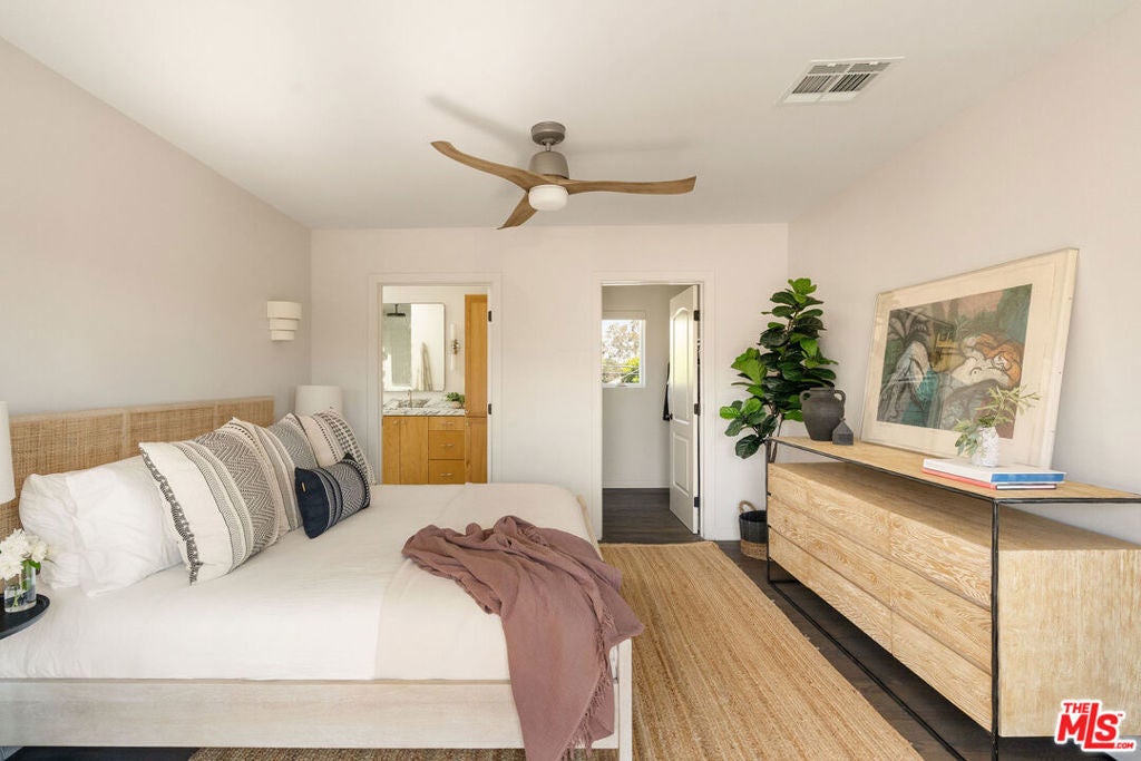 This Spanish-style Westchester residence was taken down to the studs and fully reimagined by a seasoned interior designer, completed in 2022 with impeccable attention to detail. Every space blends modern luxury with timeless character, from the wood-burning fireplace with a gas starter to custom ironwork railings and hardwood floors. The chef's kitchen is a showpiece, featuring custom wood cabinetry with Rejuvenation hardware, Arabescato marble counters, and top-tier European appliances including an ILVE 40" range, brass pot filler, and Fulgor Milano built-ins. The spa-like primary suite boasts a double vanity with Arabescato marble, a freestanding soaking tub, and an oversized shower with Kallista rain fixtures. Designer window treatments and curated finishes throughout underscore the home's elevated design. Outside, drought-tolerant landscaping, automatic lighting, and citrus and fruit trees create a private backyard retreat. A finished garage with 200v EV charging outlet completes this turnkey offering. Ideally located on a quiet, welcoming street, just minutes from Playa del Rey, Playa Vista, Silicon Beach, and LAX, this home delivers a rare blend of coastal convenience, Spanish character, and true designer pedigree.