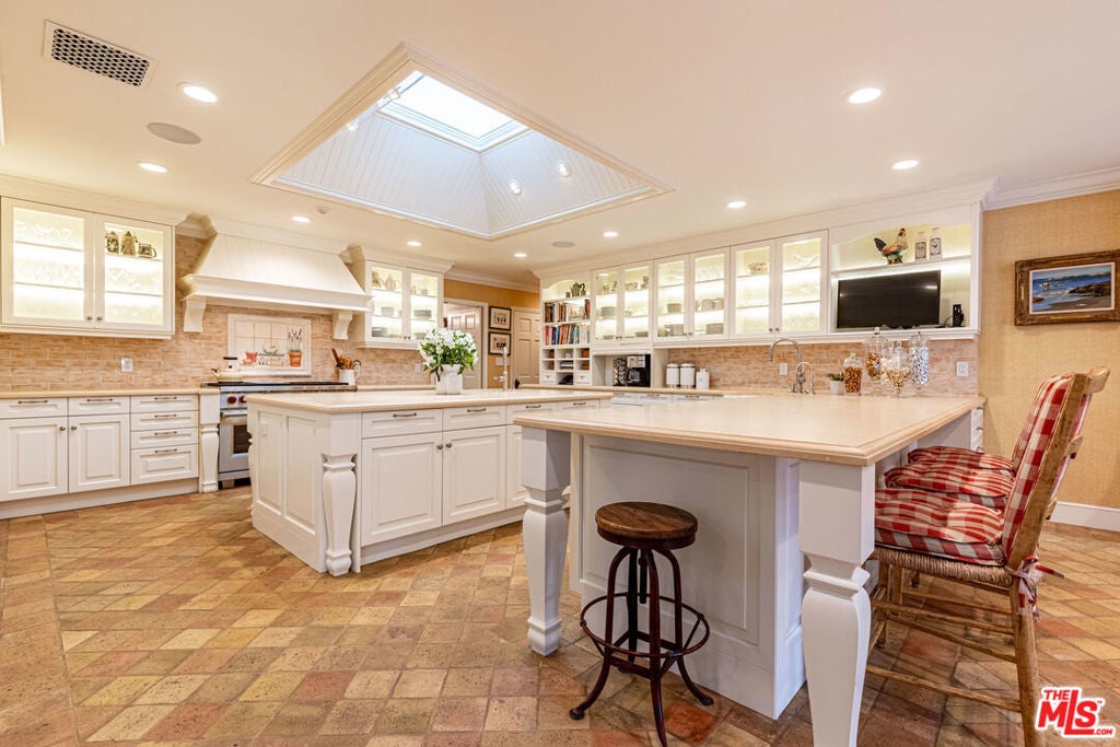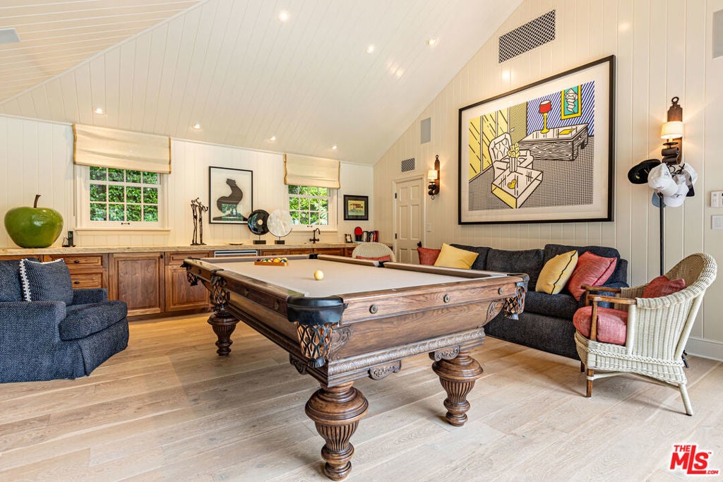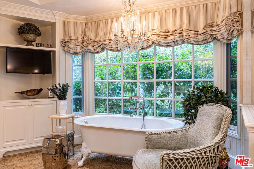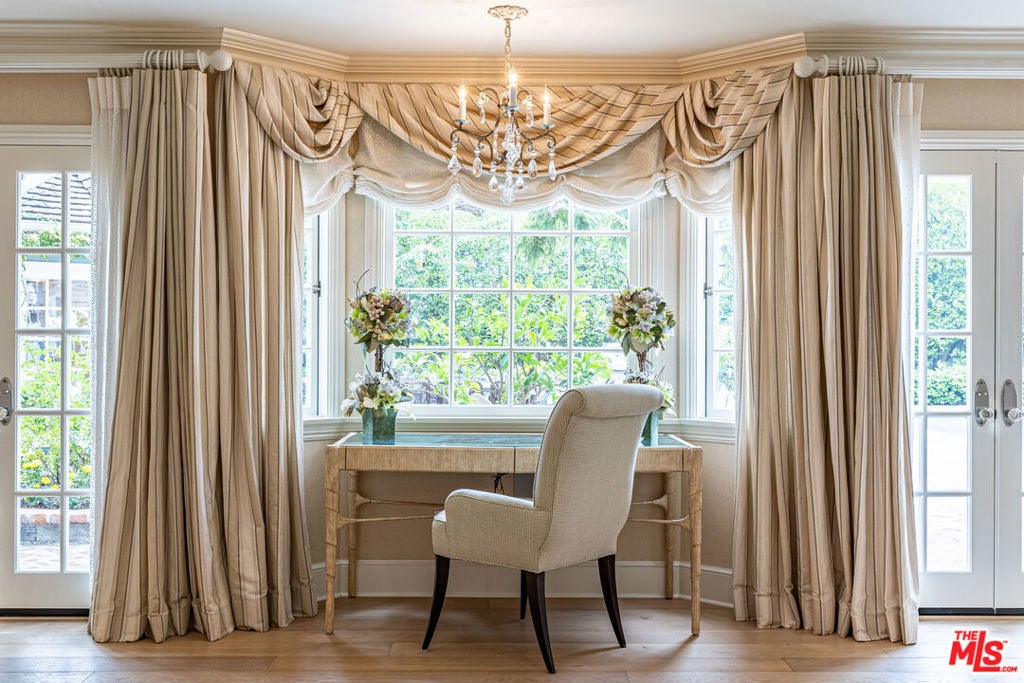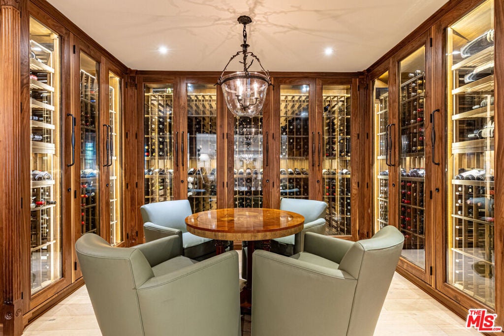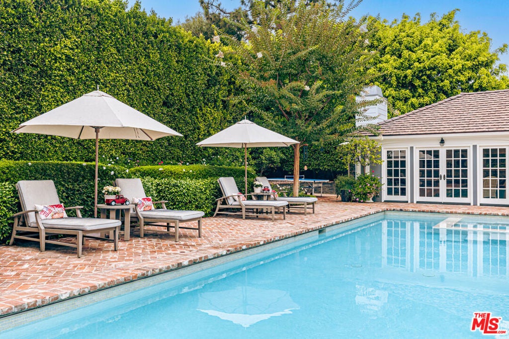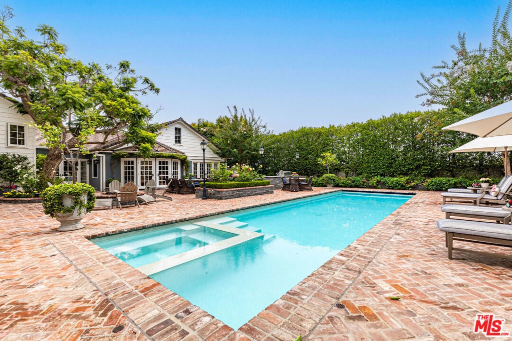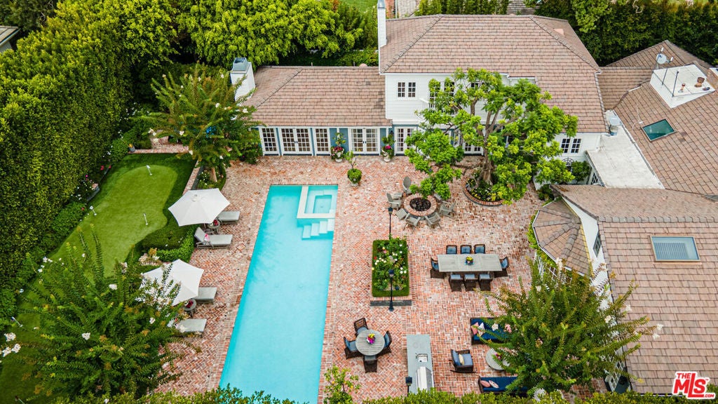 Formerly the home of Goldie Hawn and Kurt Russell, this nearly 6,400-square-foot traditional residence has been meticulously renovated, seamlessly blending East Coast charm with modern luxuries. Privately tucked away behind gates, a brick pathway, lined with manicured greenery, leads to the vine-adorned facade, welcoming guests into the formal entry. Hardwood floors and crown moldings guide you to the formal dining room on the left and the formal living room with one of the home's four fireplaces on the right. A temperature-controlled wine tasting room, converted from one of the bedrooms, is perfect for entertaining. Grand central skylights in the den and kitchen flood the home with natural light. The chef's kitchen is fully equipped with a substantial center island and peninsula, top-of-the-line appliances, ample cabinetry, a farmhouse sink, and an eat-in nook. The primary suite offers a luxurious en suite bath with a soaking tub, sauna, and custom walk-in closet. An adjoining bonus room with an additional en suite and closet makes for the perfect office or sitting room with direct access to the backyard. Three additional guest suites, all generous in size, complete this highly functional floor plan. Set on a nearly 18,000-square-foot lot framed by mature landscaping for complete privacy, the property features a swimmer's pool, multiple fire pits, a built-in barbecue, and lounging and dining areas, along with a putting green -creating an entertainer's paradise.