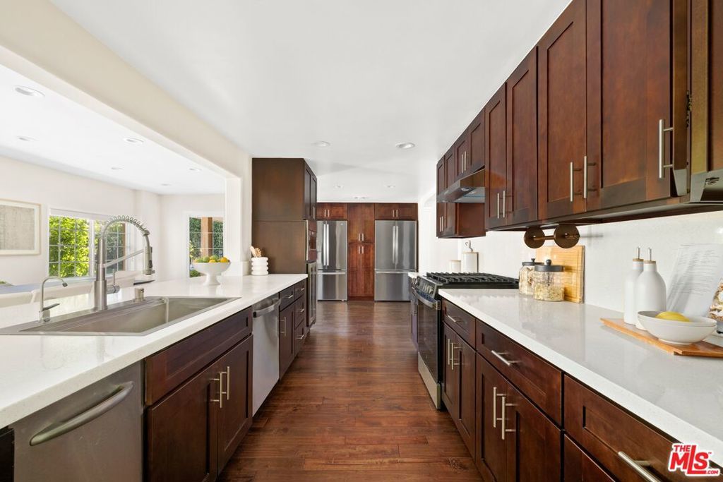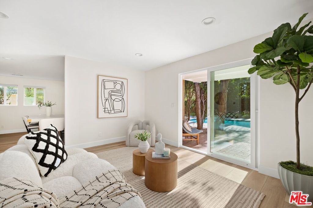 An Elegant Retreat in Walnut Acres offering the perfect blend of resort-style entertaining and private luxury living. Nestled on one of the most prestigious streets in Woodland Hills, this hidden gem exudes privacy, tranquility, and timeless elegance. From the welcoming circular driveway to the expansive backyard, the property feels like a private resort. A sparkling pool surrounded by fruit trees and vibrant gardens creates the ultimate setting for gatherings or peaceful relaxation. Set on a sprawling 25,700+ sq. ft. flat lot, the estate includes a single-story ranch home and a newly built 1,050 sq. ft. ADU featuring two ensuite bedrooms, a kitchenette, and its own electrical panelideal for extended family, a private office, or rental income. Inside the main residence, a remodeled gourmet kitchen showcases quartz countertops, custom cabinetry, premium appliances, bar seating, and seamless flow into the spacious family room with nature views. Additional highlights include a formal dining room, a separate living room with a fireplace, and a grand double-door foyer. The private bedroom wing offers sunlit retreats tucked away from the main living spaces. Recent upgrades include a brand-new roof (2024), upgraded electrical panel (200 AMP), and modern finishes throughout. Outdoors, a covered stone patio invites year-round entertaining, while a 460 sq. ft. bonus studio with half bath, currently used as a gym/massage roomadds versatility. Moments from premier shopping, dining, entertainment, freeway access, and award-winning schools, this residence is more than a homeit's a lifestyle. A rare Walnut Acres treasure not to be missed!
