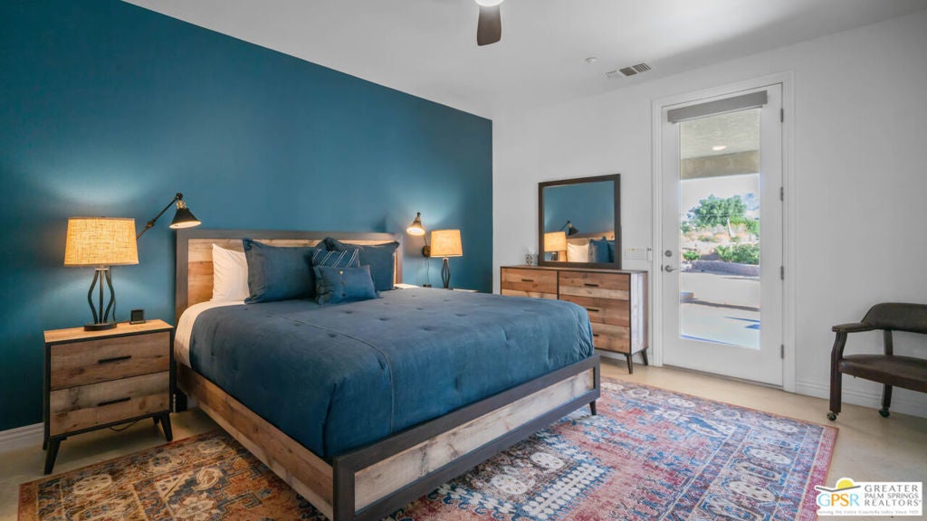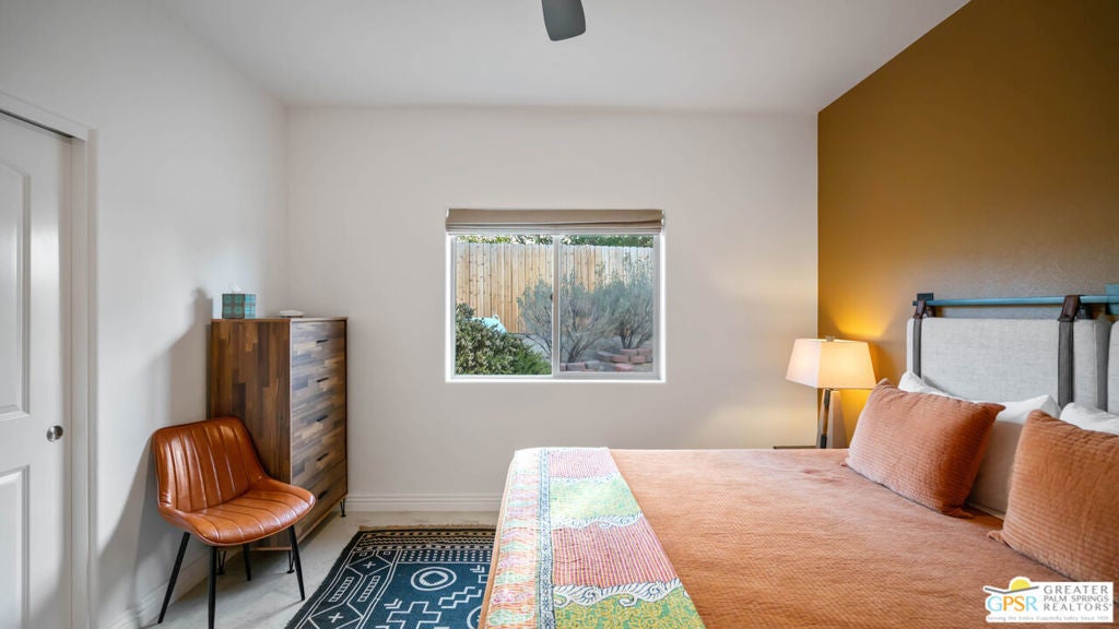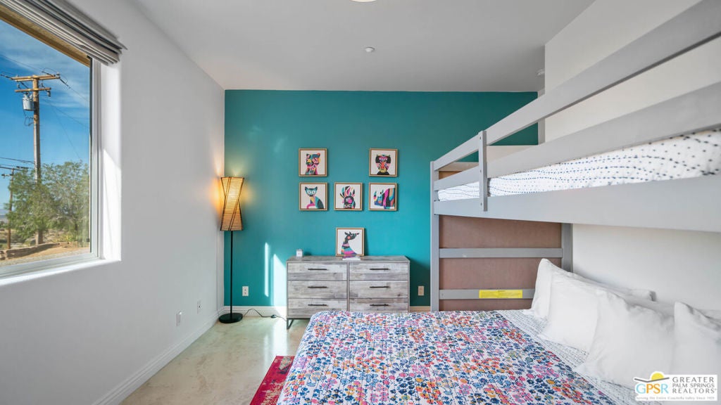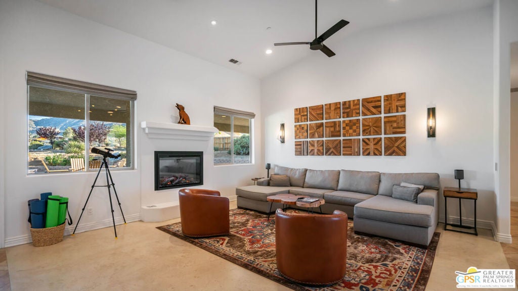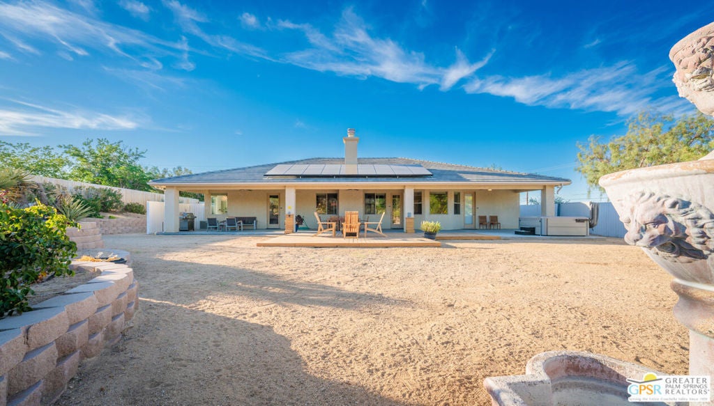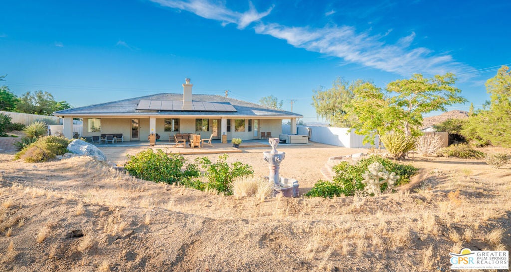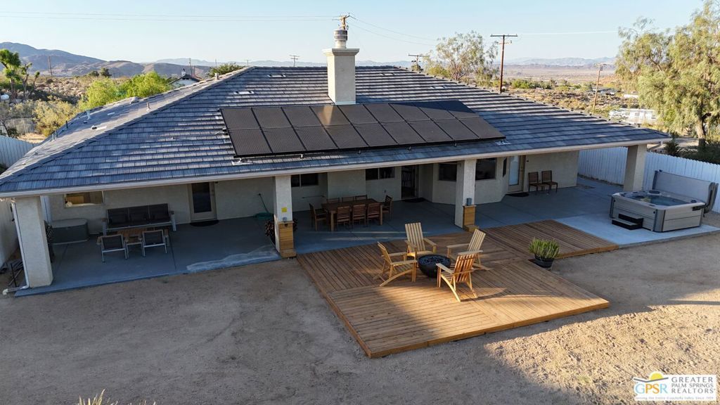 Unbeatable value in the heart of Joshua Tree! This enchanting 4-bedroom, 3-bathroom home sits on nearly an acre, blending timeless architecture with modern amenities for an unparalleled living experience. Recently renovated, this gorgeous property boasts high ceilings and an open-concept design, creating an inviting and spacious atmosphere. This is your dream retreat in the serene neighborhood of Upper Friendly Hills! Enjoy living in one of the best located neighborhoods in Joshua Tree, situated just a few blocks from the village and town center, you'll enjoy the convenience of local shops and dining while being only 10 minutes from the breathtaking landscapes of Joshua Tree National Park, perfect for exploring serene hiking trails and awe-inspiring natural beauty. Step into your private backyard sanctuary, where lush landscaping and a spacious covered patio set the stage for outdoor entertaining. Unwind on the brand-new deck with a hot tub, or cozy up by the firepit on cool desert evenings. Inside, a beautifully remodeled ensuite bathroom features modern fixtures, LED lighting, and thoughtfully placed switches for added convenience. Additional upgrades including epoxy-painted cabinets and floors, powered blinds, dual Navien tankless water heaters, house fully vented for a swamp cooler, and a propane-plumbed fire pit and barbecue enhance both style and functionality. Security and comfort are top priorities, with a SimpliSafe alarm system, Ring security cameras, and video doorbells ensuring peace of mind. A gated entry leads to a spacious 3-car garage with EV charging and RV access, offering ample storage for all your recreational gear. Plus, with 20 solar panels on a transferable lease, this home is as eco-friendly as it is luxurious. Perfectly suited for short-term rentals, this home offers a lucrative opportunity for investors or those seeking a hassle-free Airbnb experience. Furnishings are negotiable! Providing meticulous attention to detail and a host of amenities designed to impress, this gem is ready to welcome you home to the enchanting beauty of Joshua Tree. Whether you are looking for a primary residence, vacation getaway, or short-term rental investment, this beautifully designed property offers a seamless blend of comfort, style, and opportunity. Don't miss your chance to own a slice of desert paradise schedule a showing today!