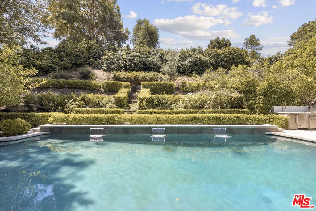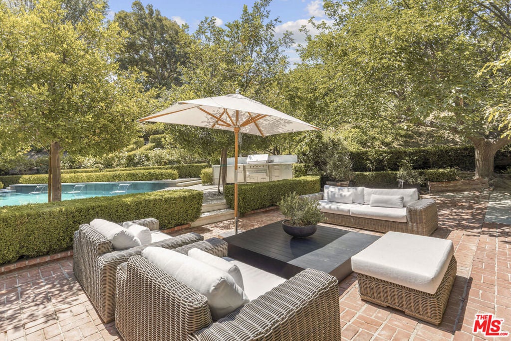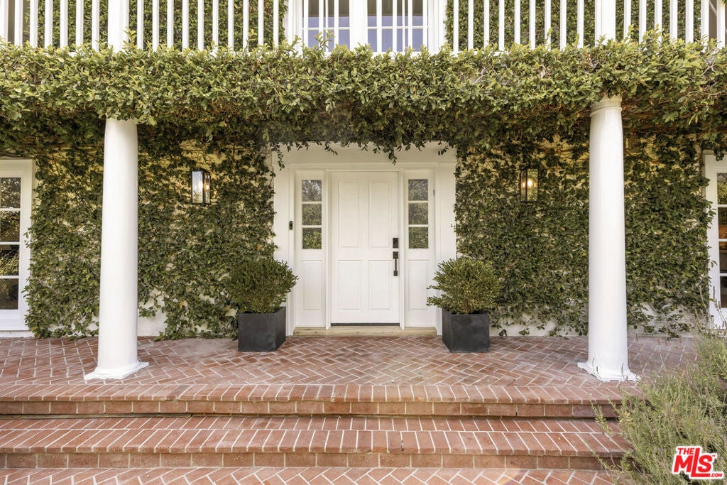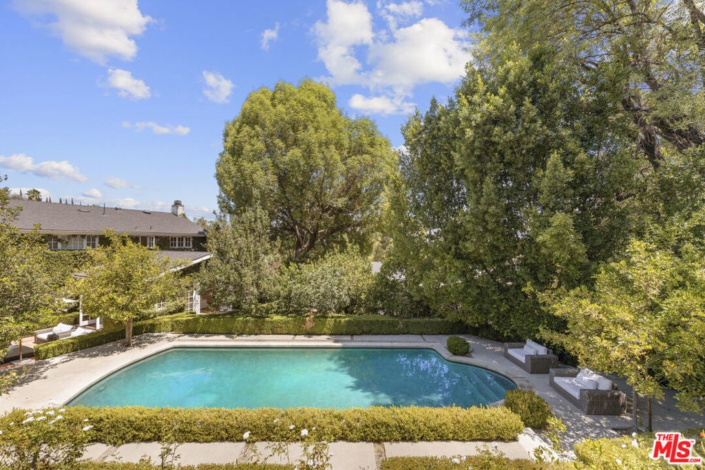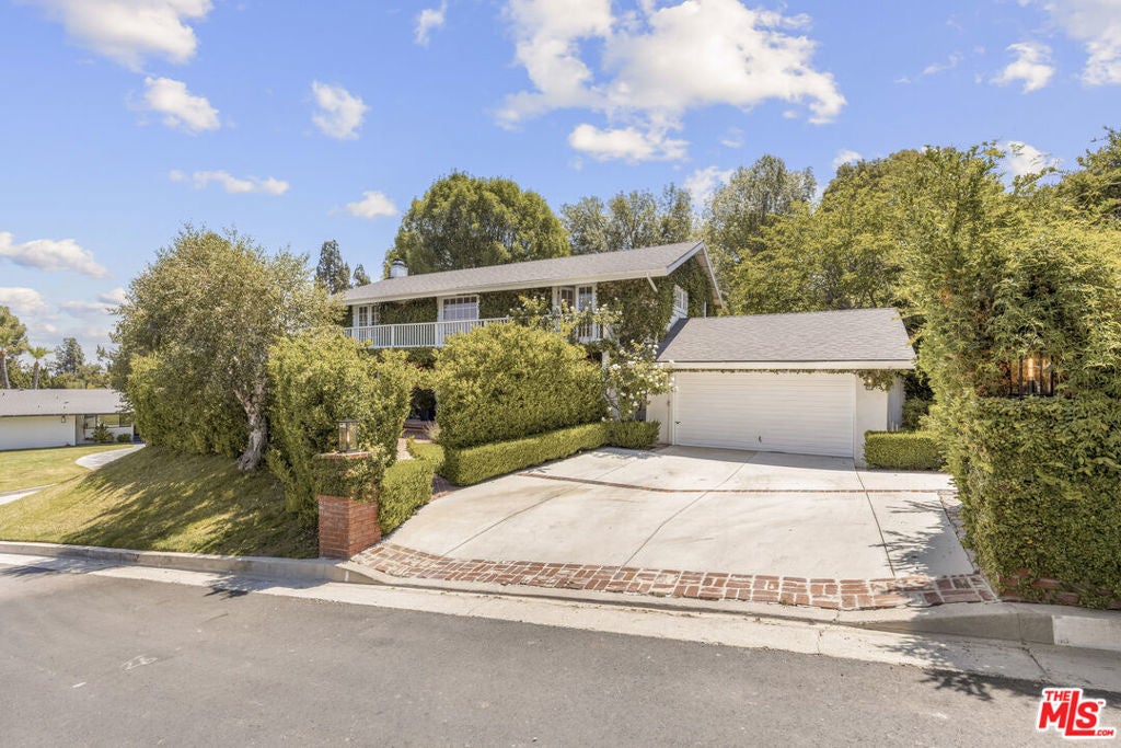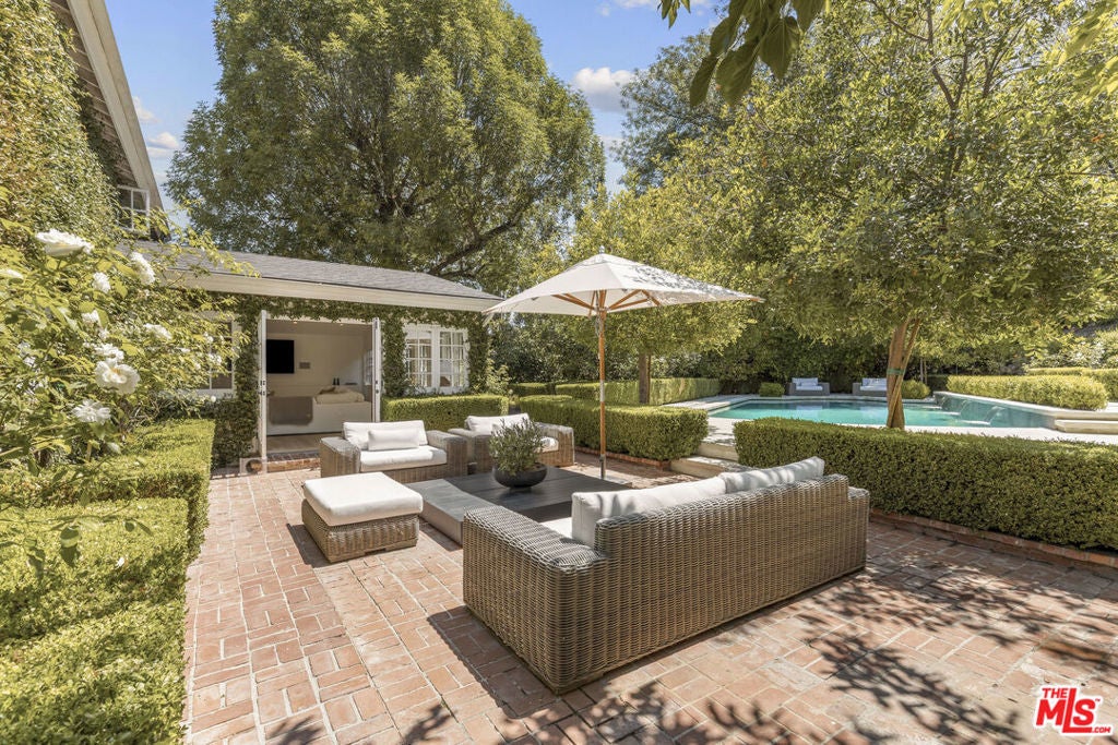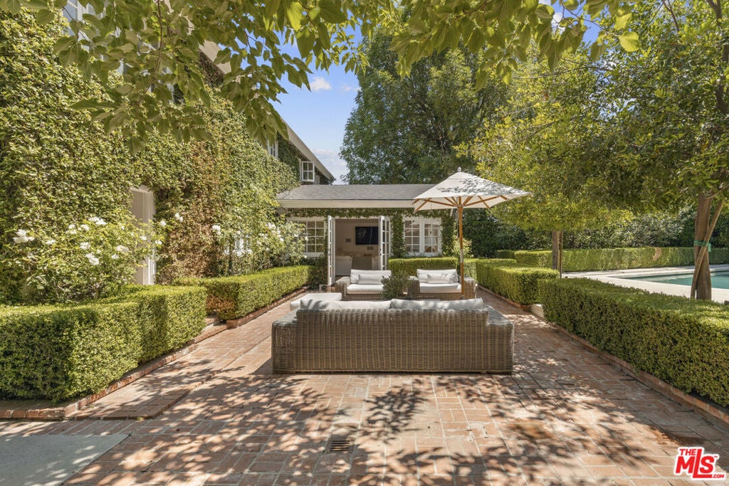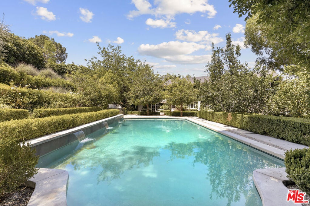 Framed by climbing ivy, white columns and a brick path, 5020 Bilmoor Avenue is a character-rich English Country Traditional set on over half an acre corner lot South of the Boulevard. Step inside to bright, gallery-white interiors and newly refinished wide-plank hardwood floors that set a calming, modern tone. A formal living room centers on a marble fireplace, while the expansive family room unfolds beneath a vaulted, tongue-and-groove ceiling with French doors on both sides for effortless indoor-outdoor flow. The custom chef's kitchen pairs a custom Regina honed marble countertop with a double-wide Sub-Zero refrigerator/freezer and Gaggenau appliances. The kitchen flows to the dining area, walk in pantry and downstairs powder + laundry room.Upstairs, the primary suite features treetop outlooks and a romantic balcony, and a spa like bath with marble floors, a freestanding soaking tub, and classic wainscoting. Three additional bedrooms and a full bathroom complete the top floor. A show stopping backyard features an oversized pool with trio water features, manicured parterre hedges, terraced flowering beds, and a fruit orchard to create a private, estate-like setting. Entertain on brick patios beside an outdoor kitchen with Viking appliances, or lounge by the pool. The detached garage has been transformed into a professional-grade music studio complete with an iso-booth - an inspiring creative haven with a storied legacy of legendary artists. 5020 Bilmoor Ave combines a rare blend of charm, privacy and luxury in one of Tarzana's most sought-after pockets.