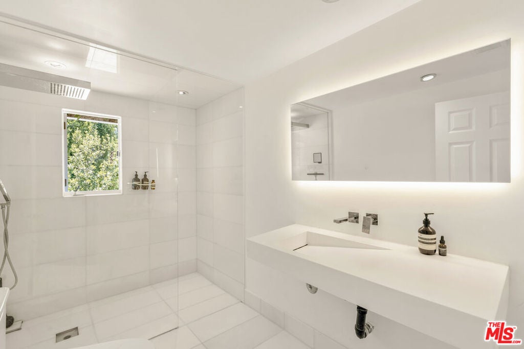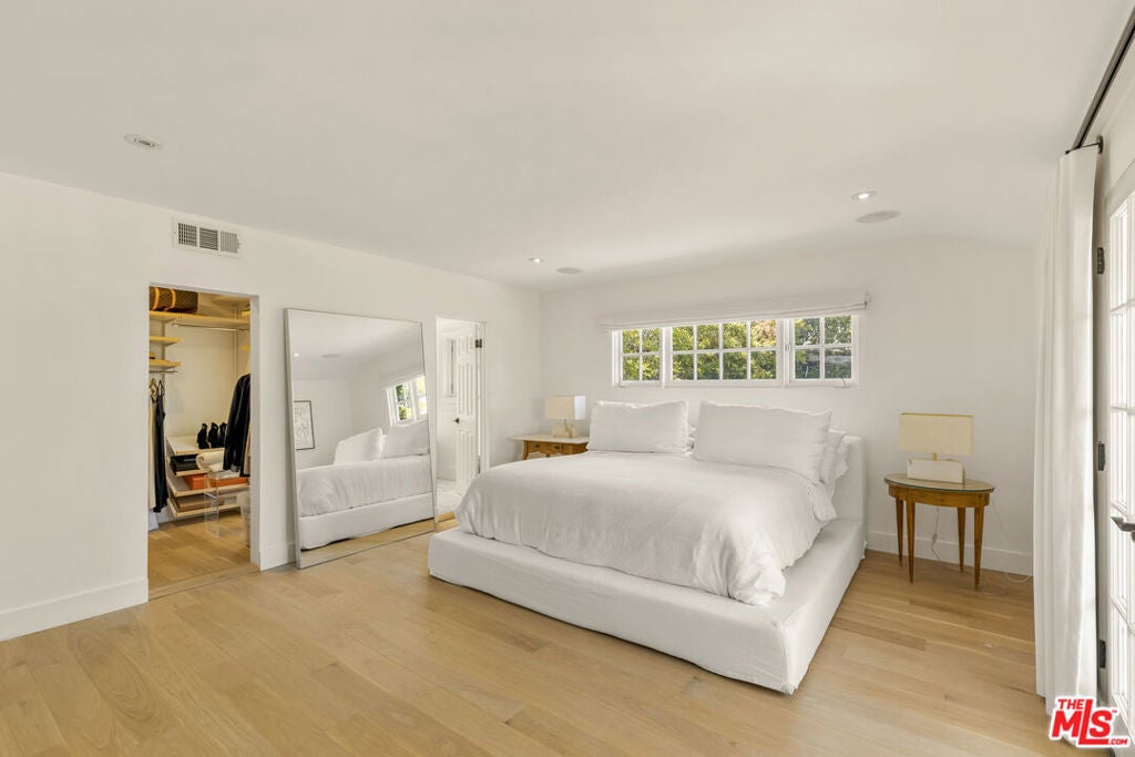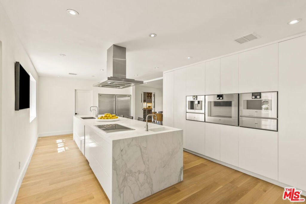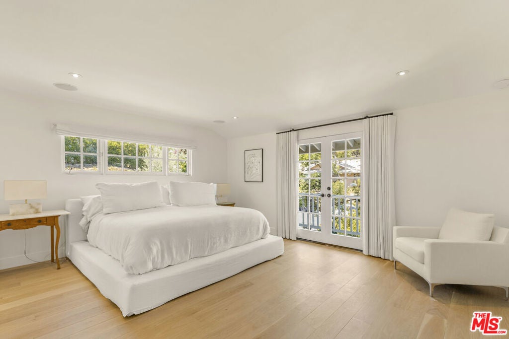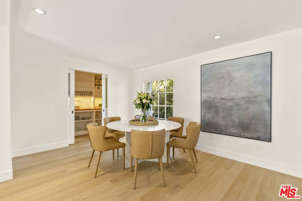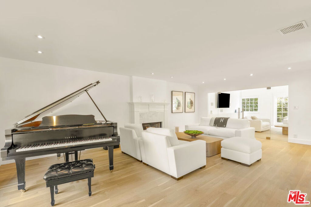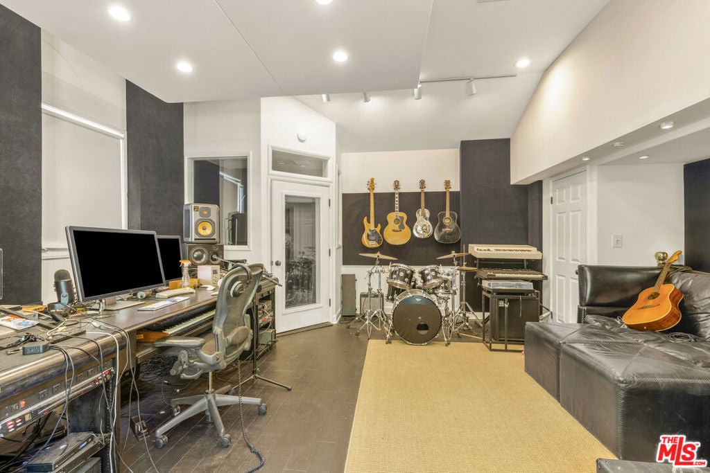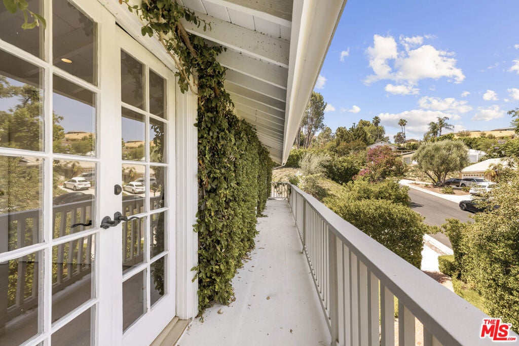 Framed by climbing ivy, white columns and a brick path, 5020 Bilmoor Avenue is a character-rich English Country Traditional set on over half an acre corner lot South of the Boulevard. Step inside to bright, gallery-white interiors and newly refinished wide-plank hardwood floors that set a calming, modern tone. A formal living room centers on a marble fireplace, while the expansive family room unfolds beneath a vaulted, tongue-and-groove ceiling with French doors on both sides for effortless indoor-outdoor flow. The custom chef's kitchen pairs a custom Regina honed marble countertop with a double-wide Sub-Zero refrigerator/freezer and Gaggenau appliances. The kitchen flows to the dining area, walk in pantry and downstairs powder + laundry room.Upstairs, the primary suite features treetop outlooks and a romantic balcony, and a spa like bath with marble floors, a freestanding soaking tub, and classic wainscoting. Three additional bedrooms and a full bathroom complete the top floor. A show stopping backyard features an oversized pool with trio water features, manicured parterre hedges, terraced flowering beds, and a fruit orchard to create a private, estate-like setting. Entertain on brick patios beside an outdoor kitchen with Viking appliances, or lounge by the pool. The detached garage has been transformed into a professional-grade music studio complete with an iso-booth - an inspiring creative haven with a storied legacy of legendary artists. 5020 Bilmoor Ave combines a rare blend of charm, privacy and luxury in one of Tarzana's most sought-after pockets.